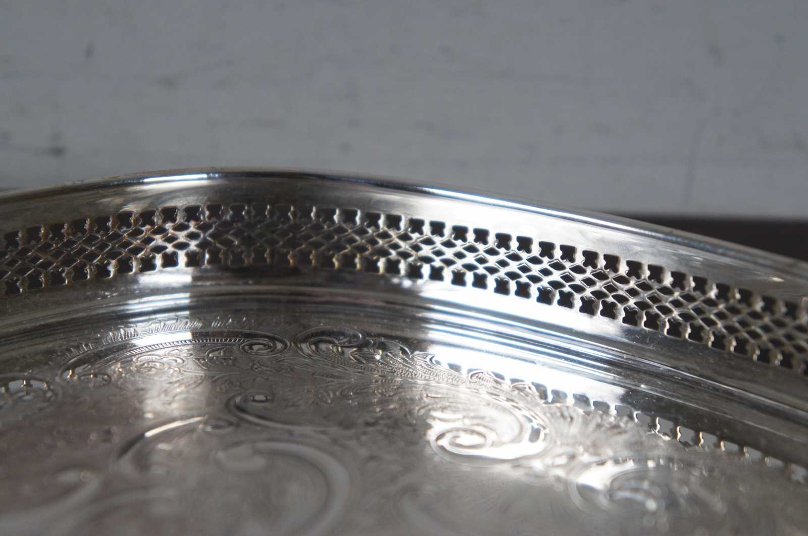 Vintage oval silver plate tray with raised pierced / reticulated edge and stamped floral pattern. Marked on reverse with an F topped by a crown.