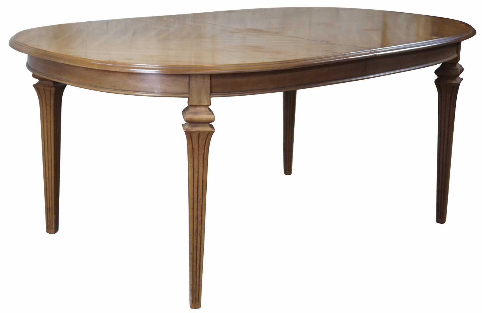 Vintage Stanley Furniture dining table. Made of walnut with matchbook parquetry oval top and tapered fluted legs. 645-38