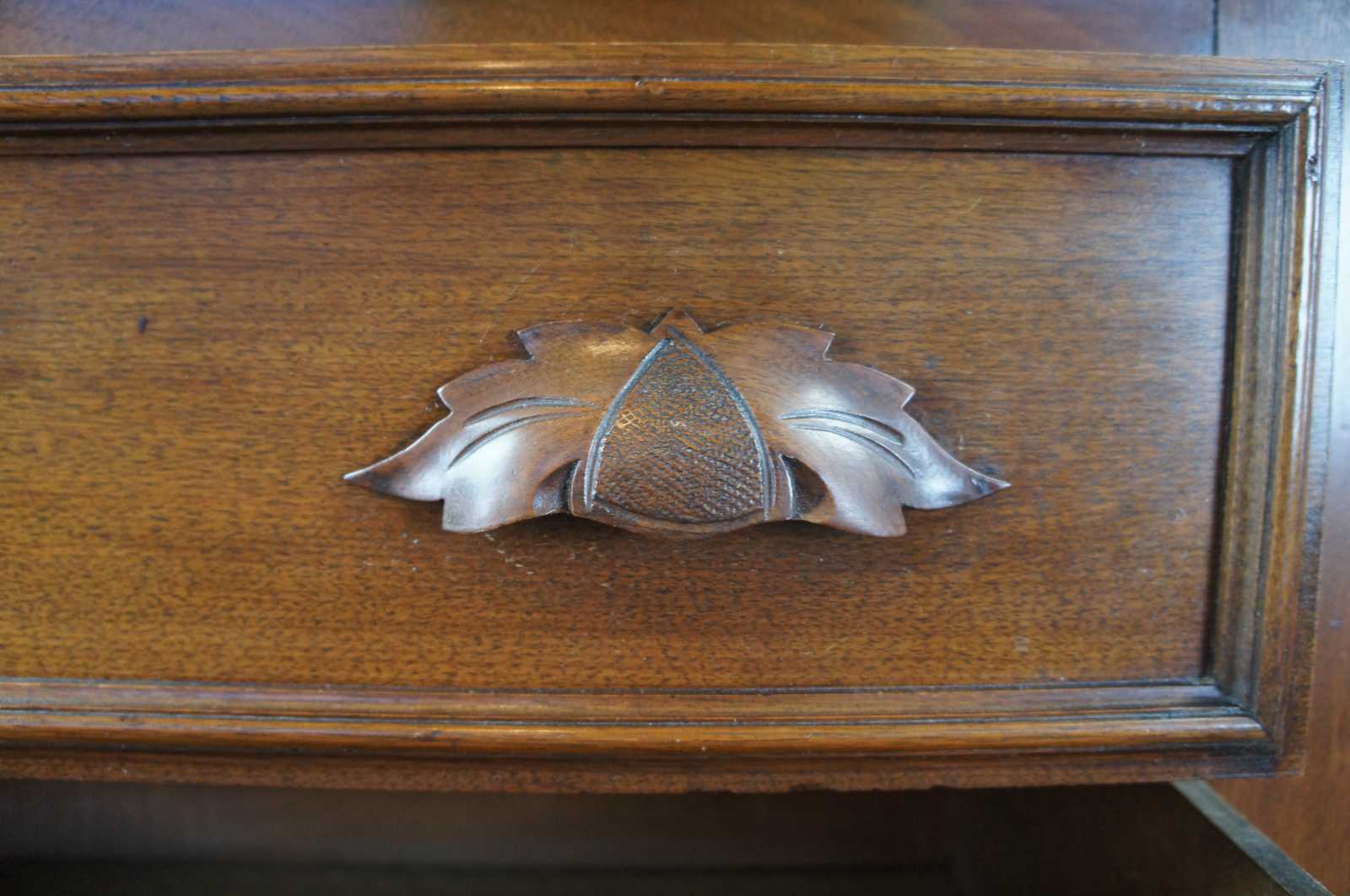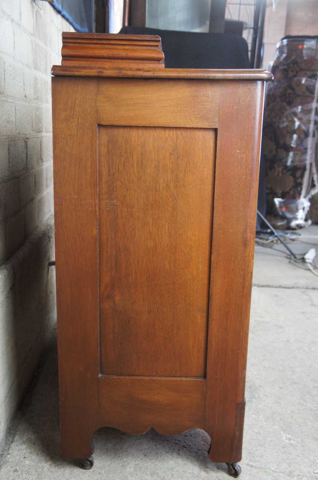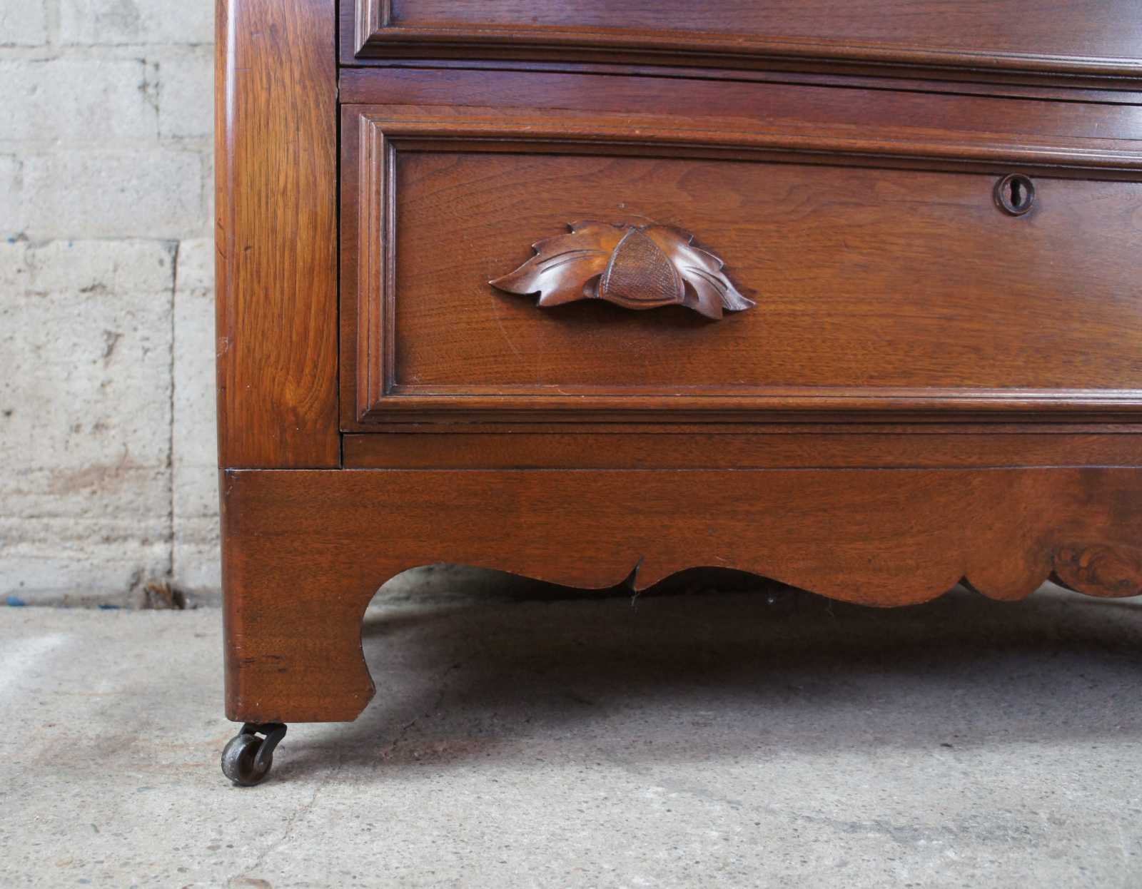 Circa 1880s Victorian dresser. Made from walnut with two glovebox drawers over three larger lower drawers. Features ovular shaped drawer trim, leaf carved pulls and serpentine cut lower apron. The drawers are constructed using the Knapp Joint. The Knapp joint was developed during the late Victoria Era in post-Civil War United States. It was patented by Charles Knapp of Waterloo, WI in 1867. The Knapp Joint is particularly unique to furniture as it was only used from 1870 until 1900.