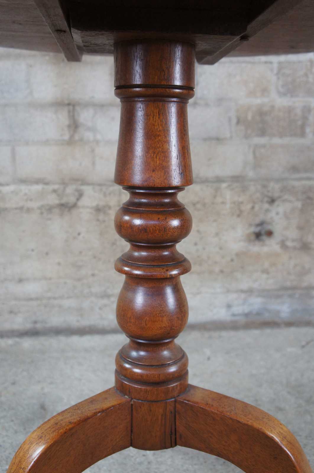 Early 20th century round tilt top table in the manner of Queen Anne or Georgian Styling. Made of mahogany, featuring a tri leg pedestal base and turned baluster support.