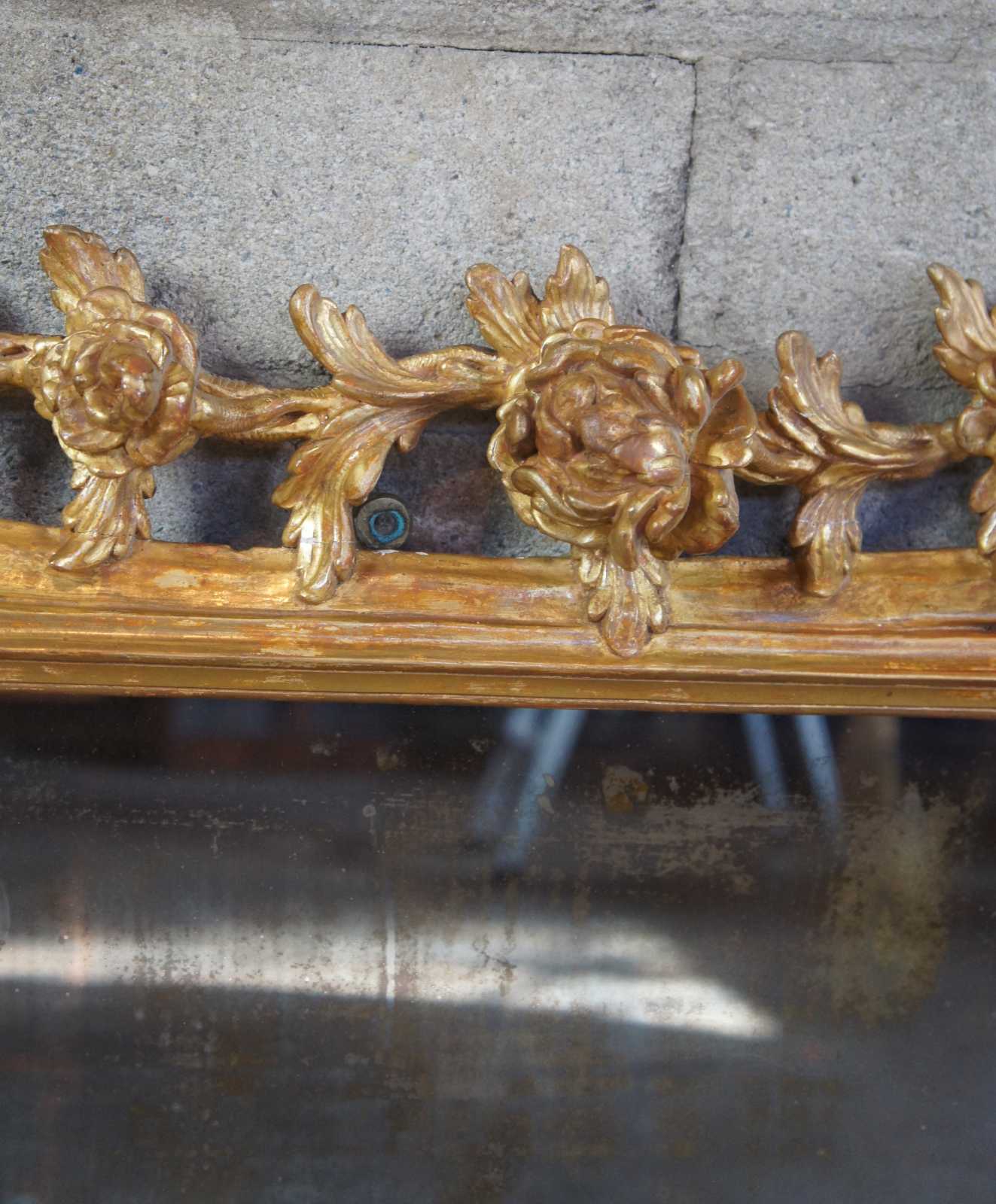Antique George III giltwood mirror, circa second half of 18th century. Features ornate carvings with scrolling rococo and foliate decoration with segmented plate.
