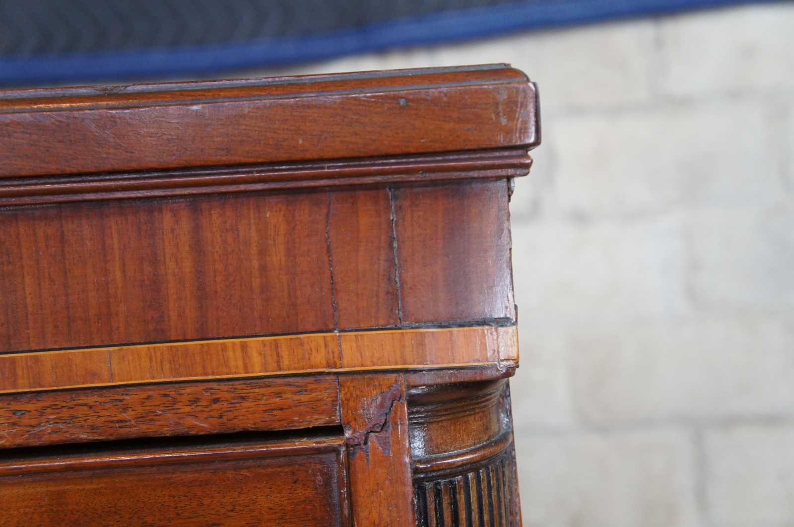 Circa 1850s English mahogany rectangular form "Two over Three" chest of drawers. A remarkable design with banding, quarter cut reeded columns over inlay and brass lion head pulls. the chest is supported by bracket feet.