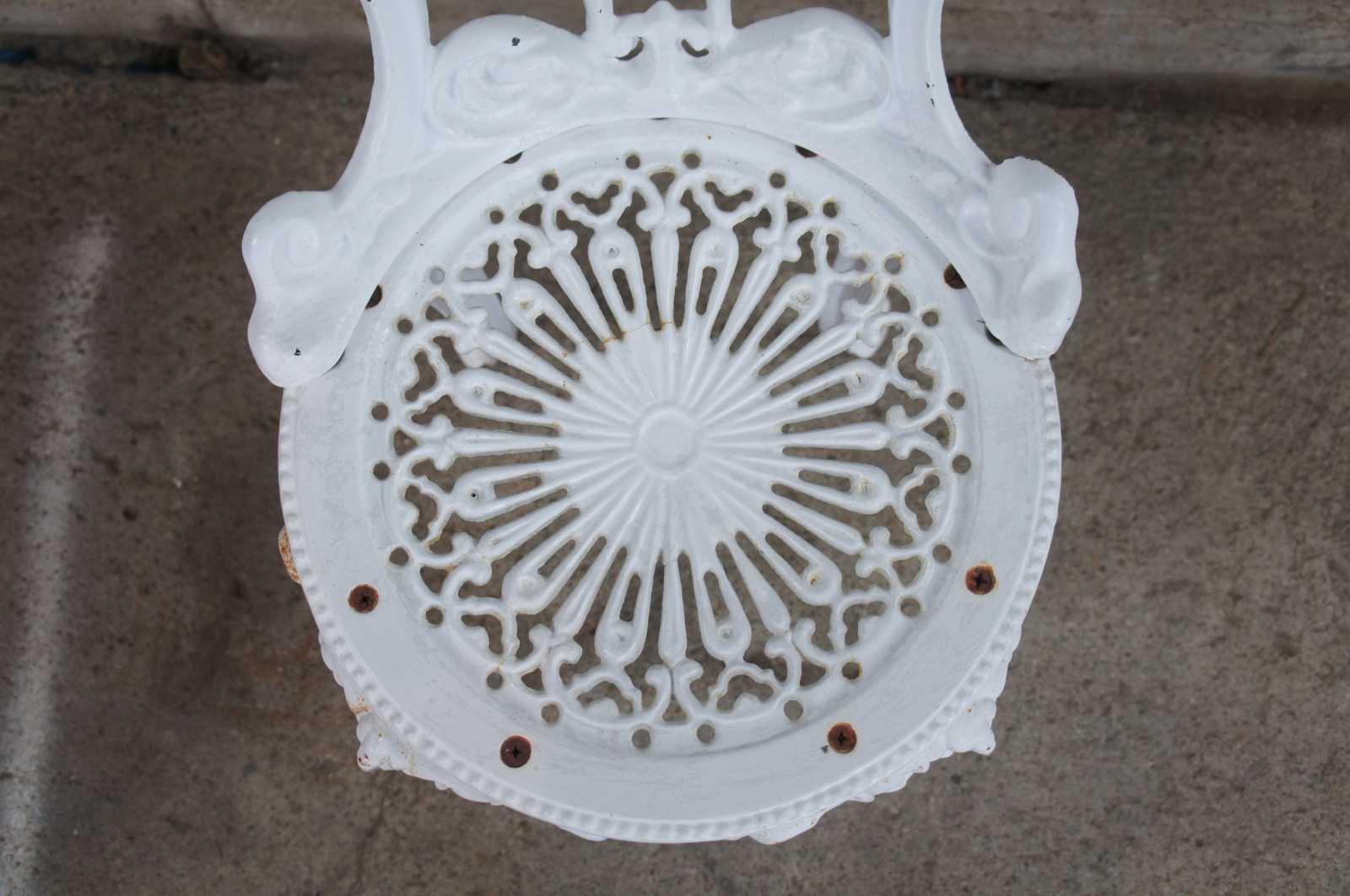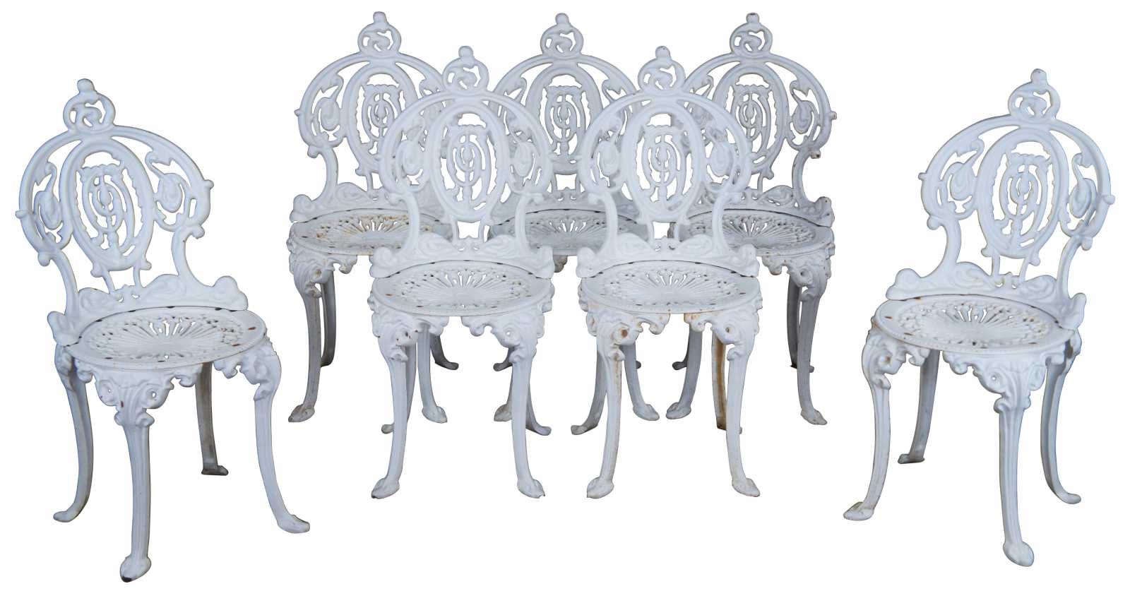 Seven Antique French cast iron patio / garden / bistro chairs. Made of cast iron featuring an ornate design with crest and filigree seat. Very heavy.
