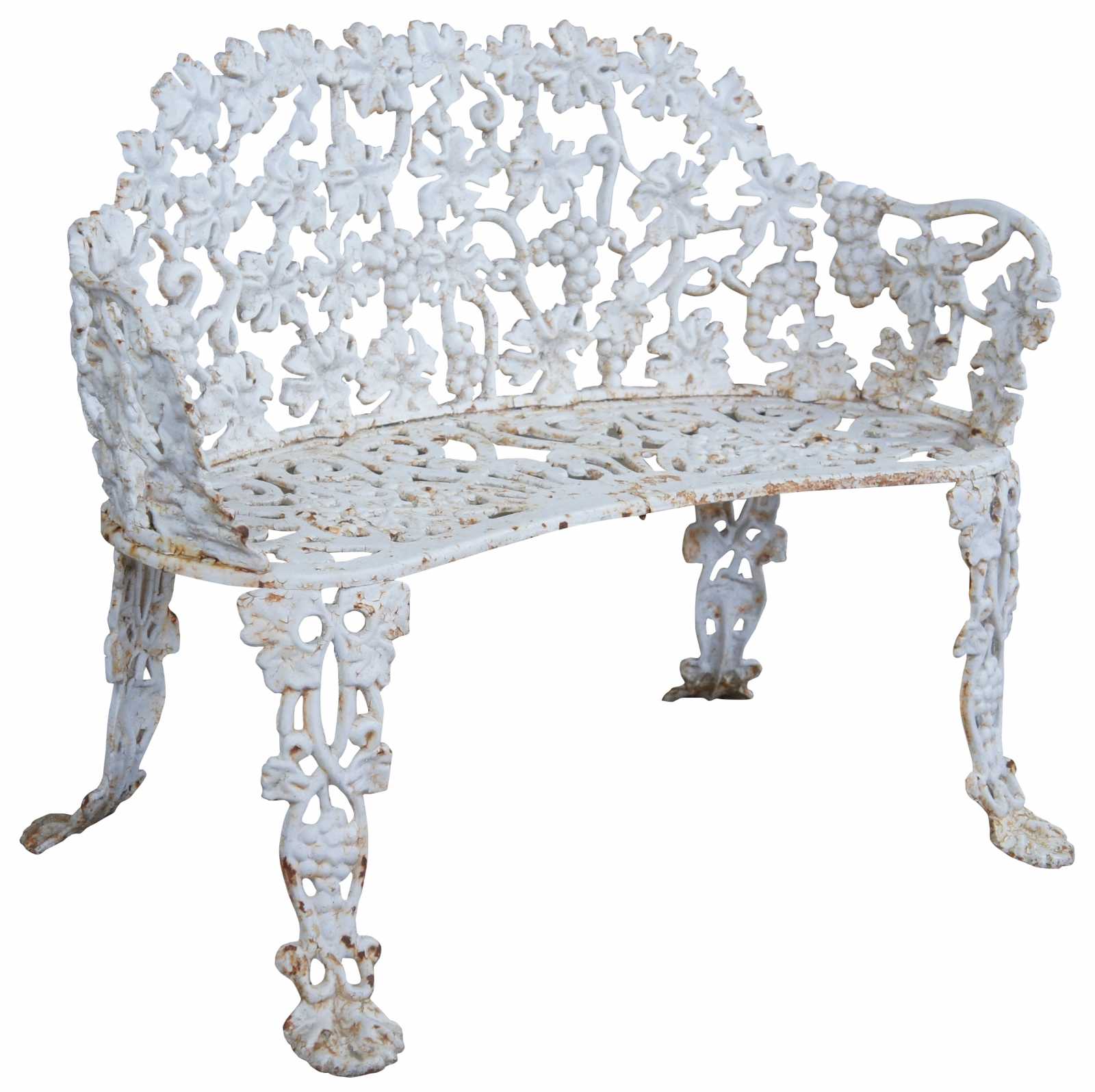 Victorian reticulated garden bench features cast iron construction in grape and leaf pattern and seated on cabriole legs terminating in stylized paw feet