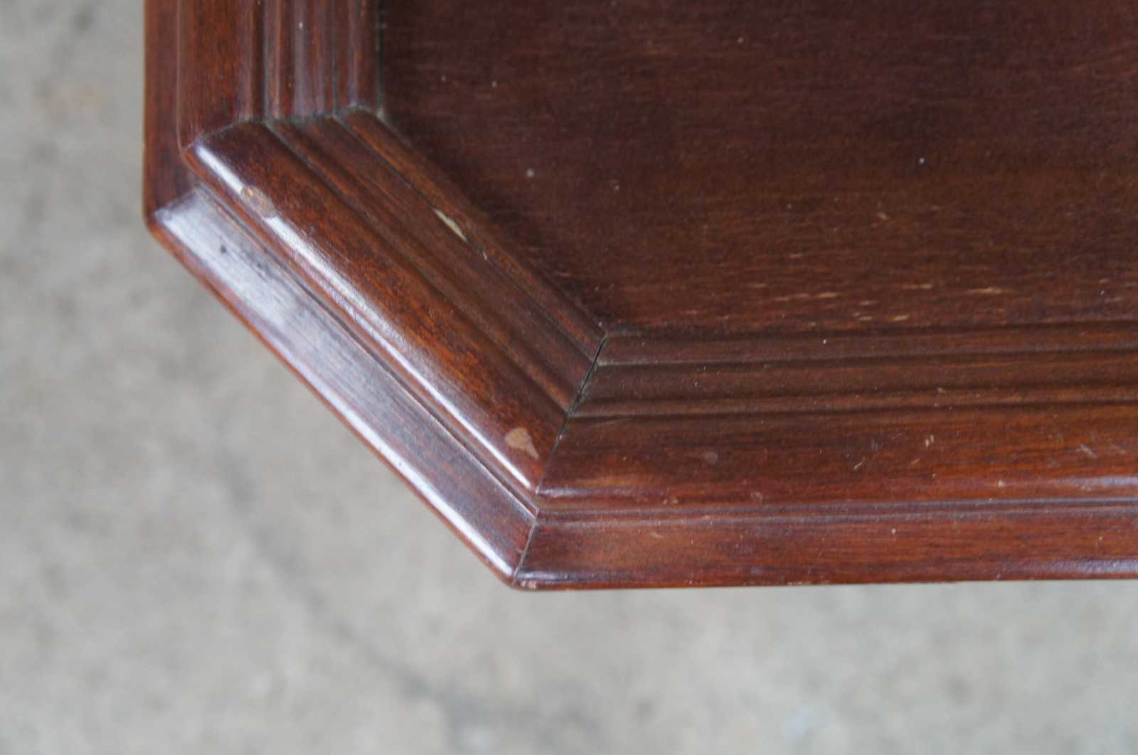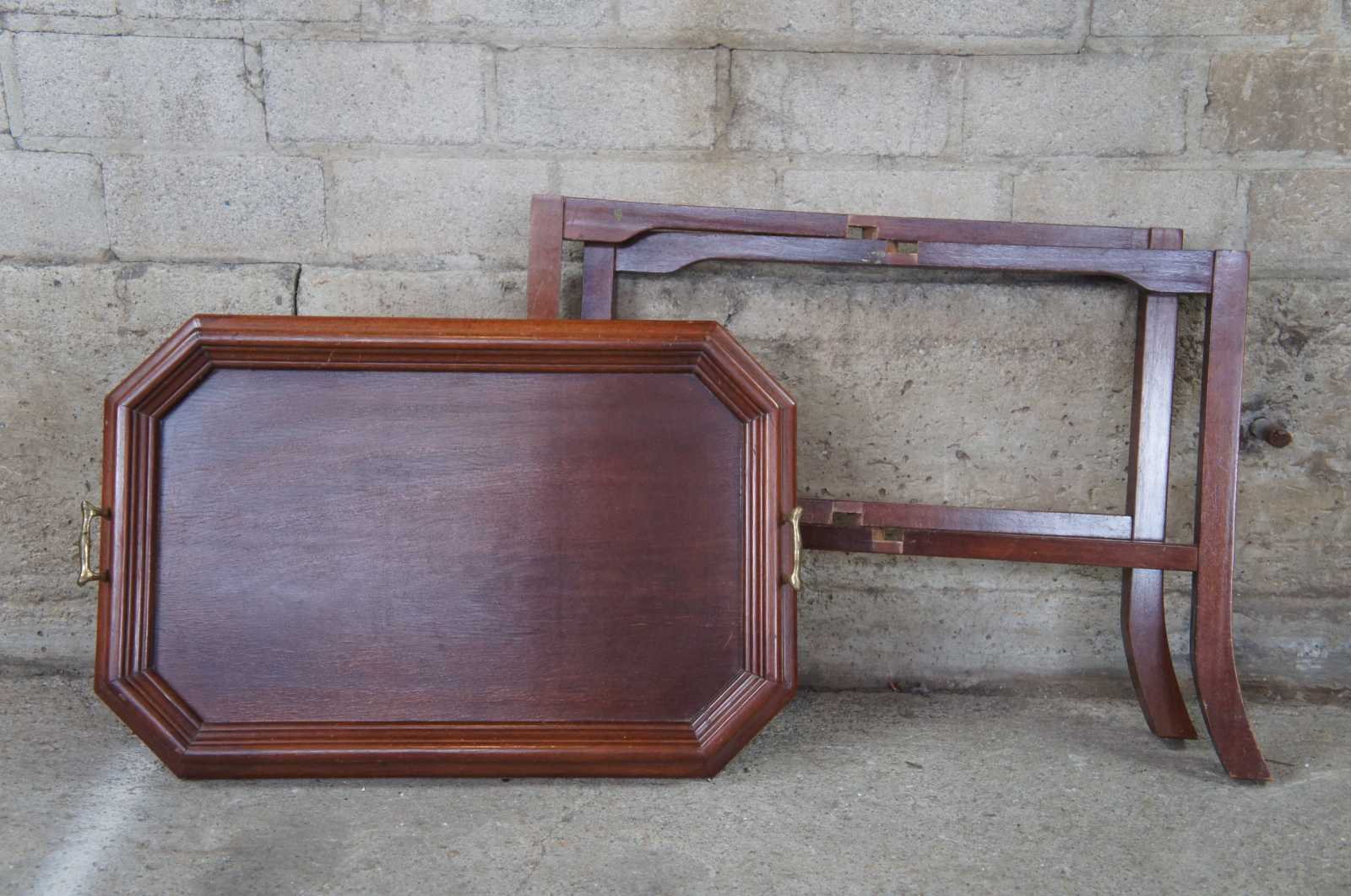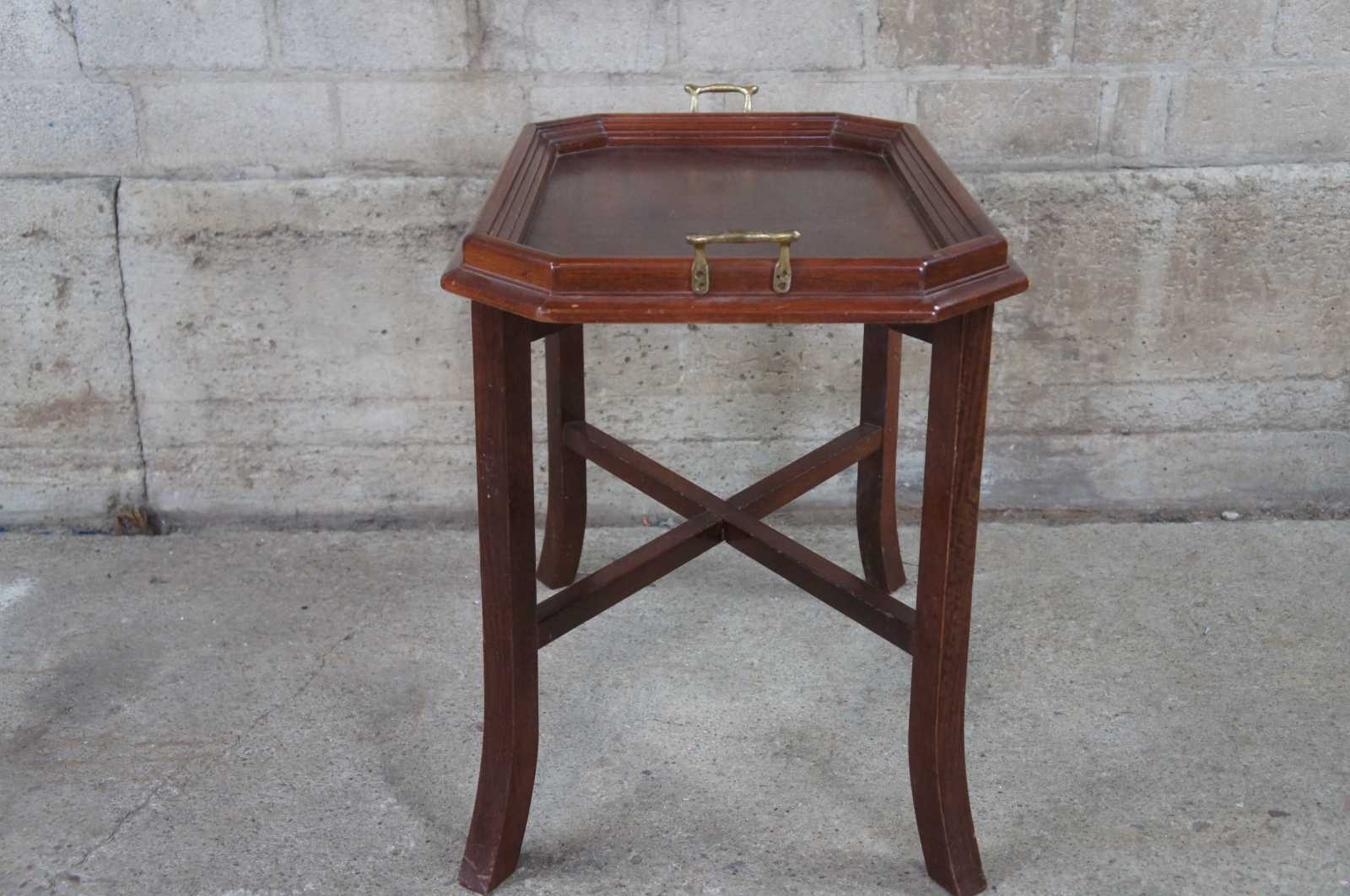 Vintage pine tray table. Features a folding base connected by X stretcher and rectangular octogon shaped top with brass handles.