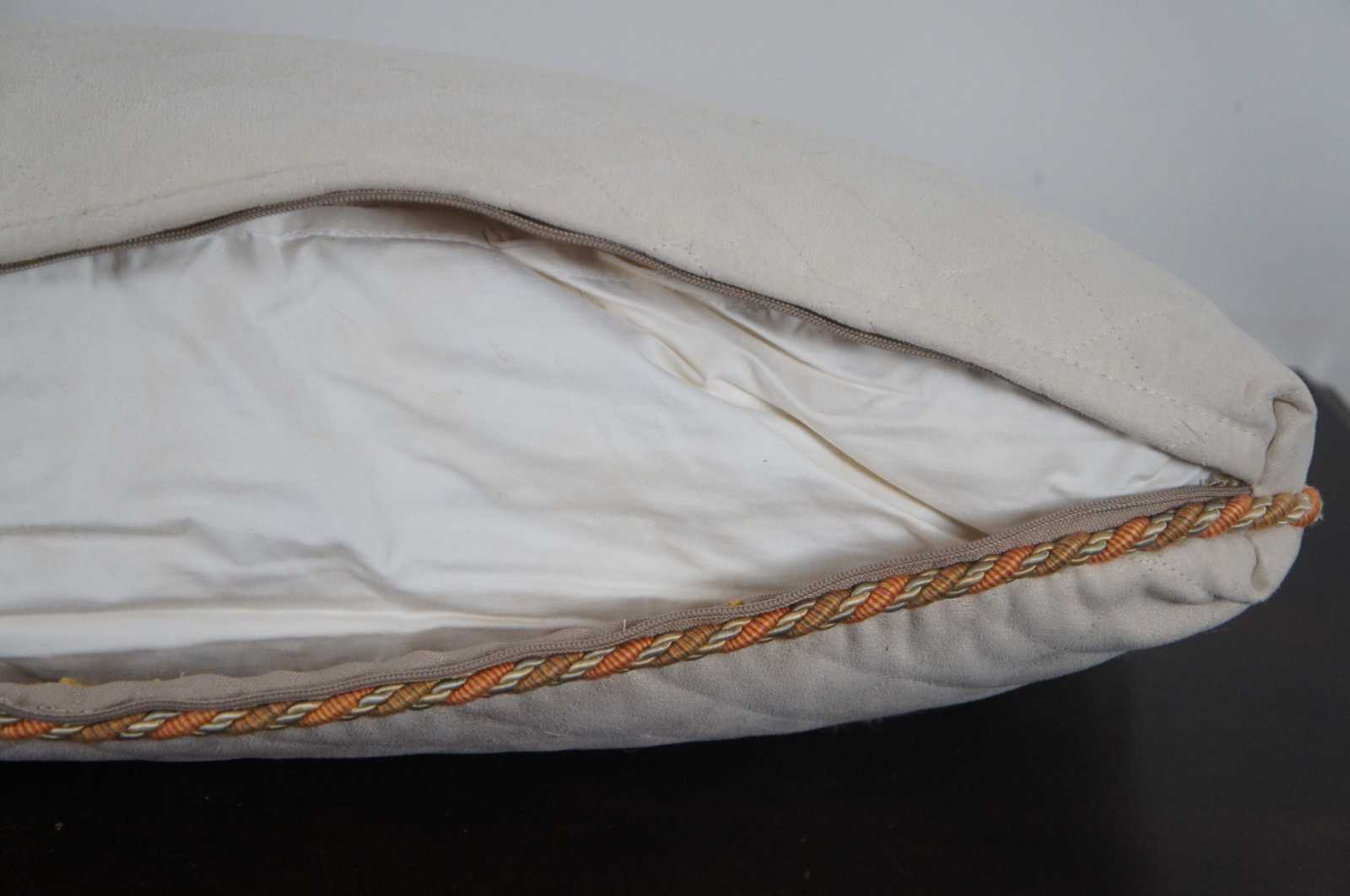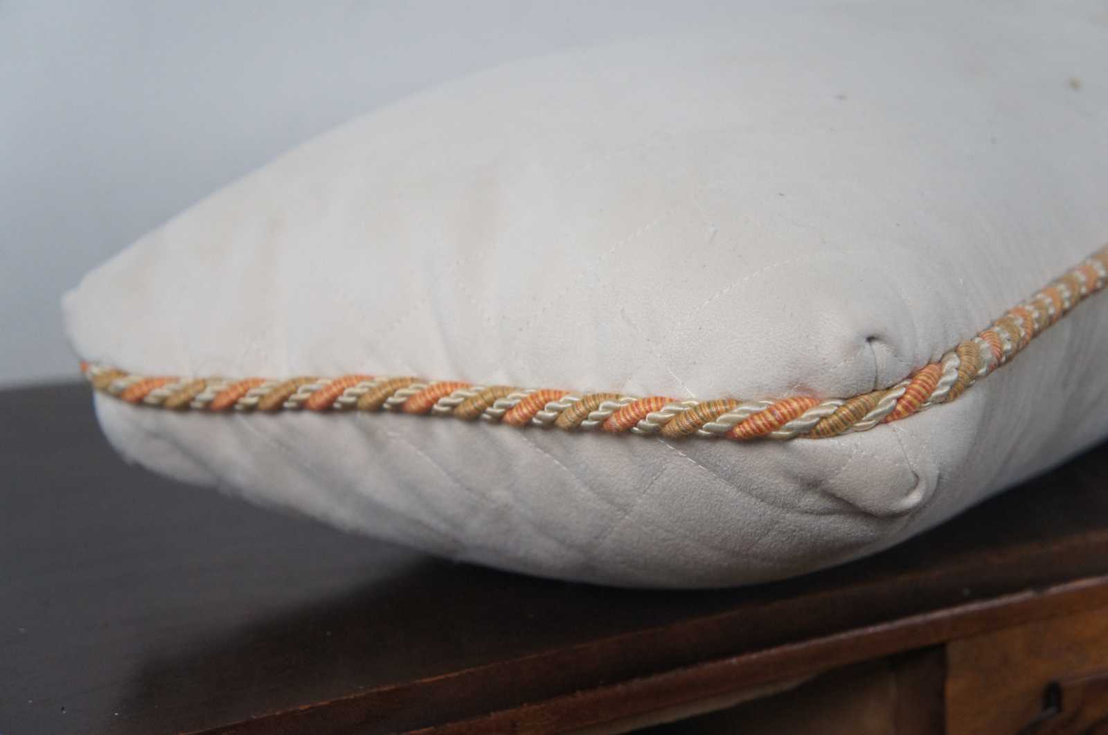 Long rectangular down filled bolster pillow with off white quilted cover bordered with twisted orange and green piping.