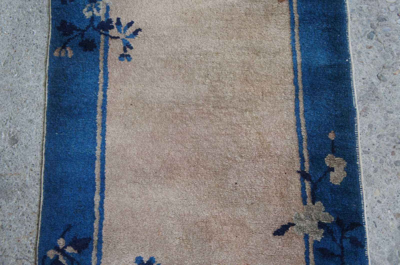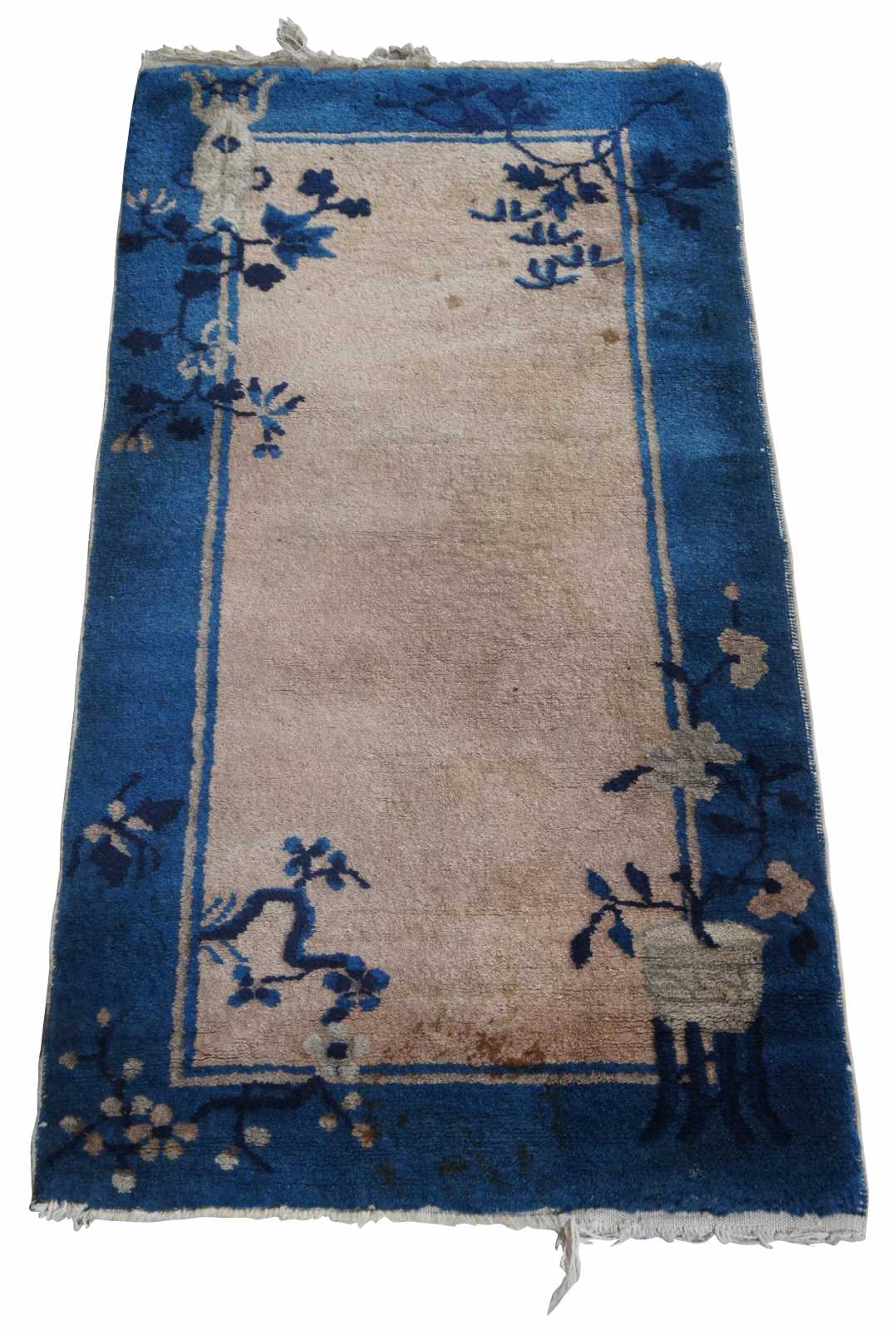 Antique chinese floral rug or carpet featuring flower filled vases on stands against a salmon pink ground with blue boarder.