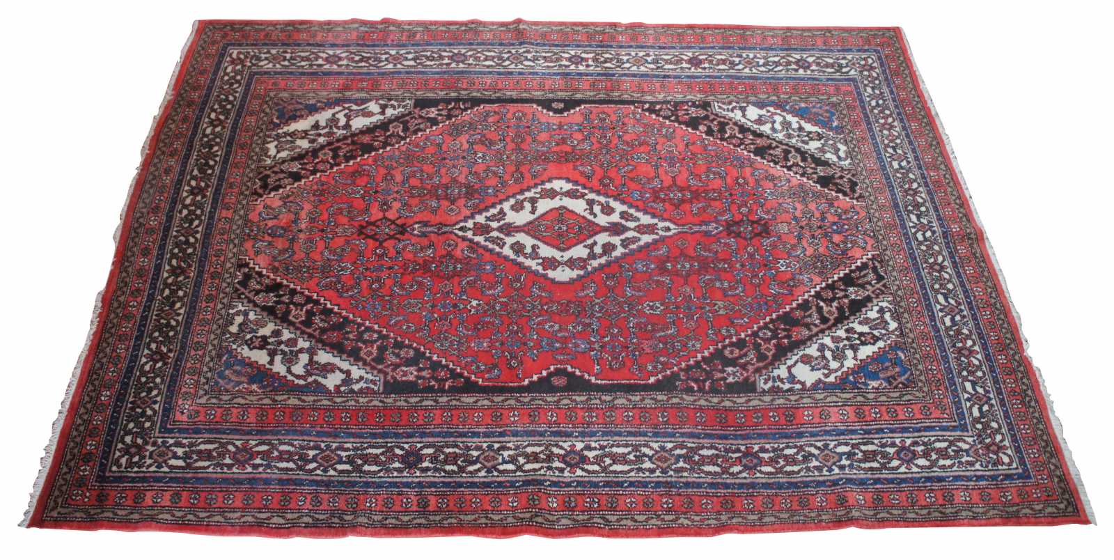 Large antique floral all over area rug featuring a red field with ornate floral accents in greens, blues, pink and brown.