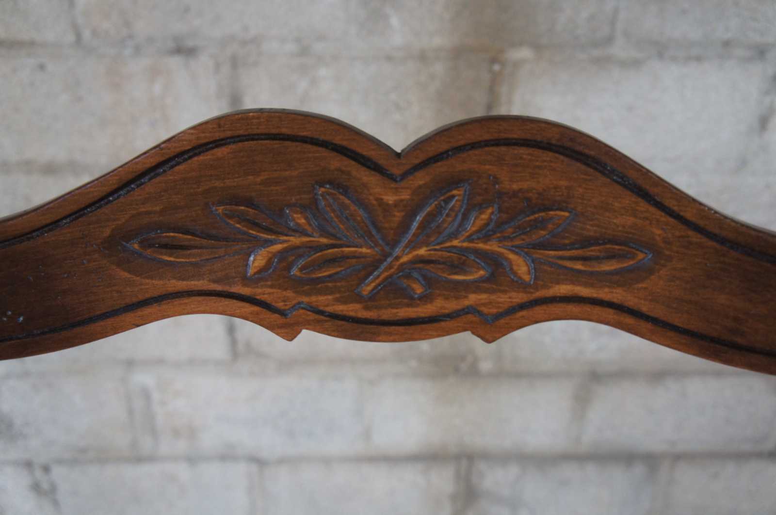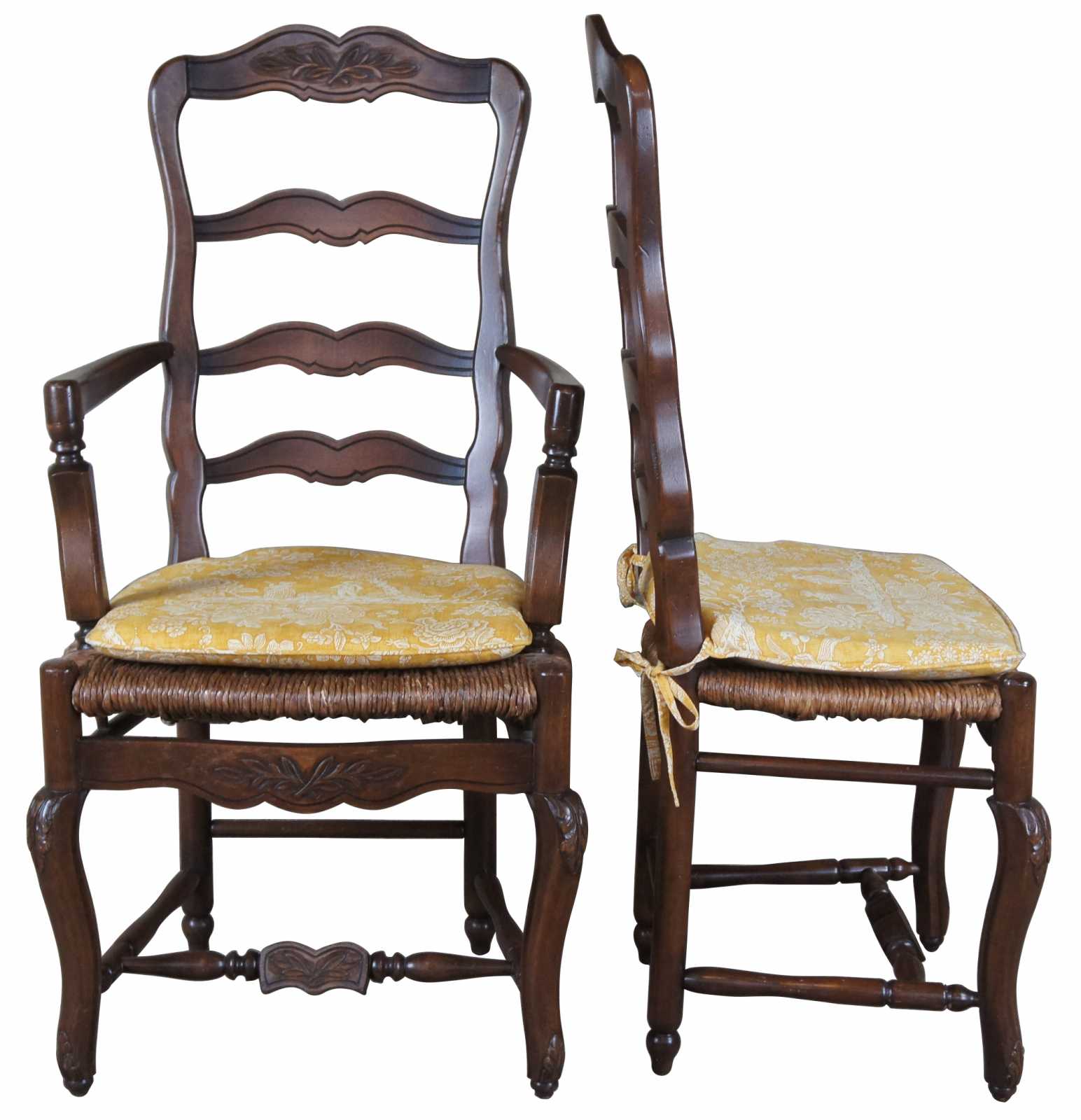 Circa 1970s Country French dining chairs. Feature a serpentine foliate pressed rail over ladderback leading to a rush seat and carved base with cabriole legs and H stretcher. Includes removable toile cushions