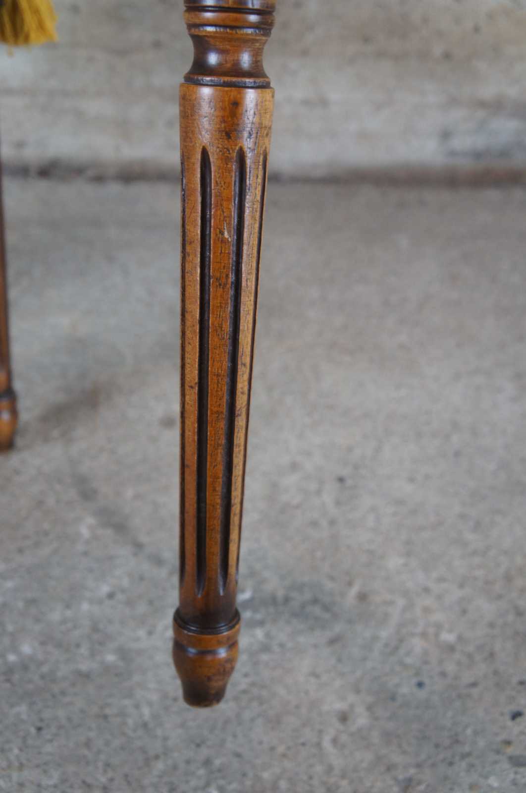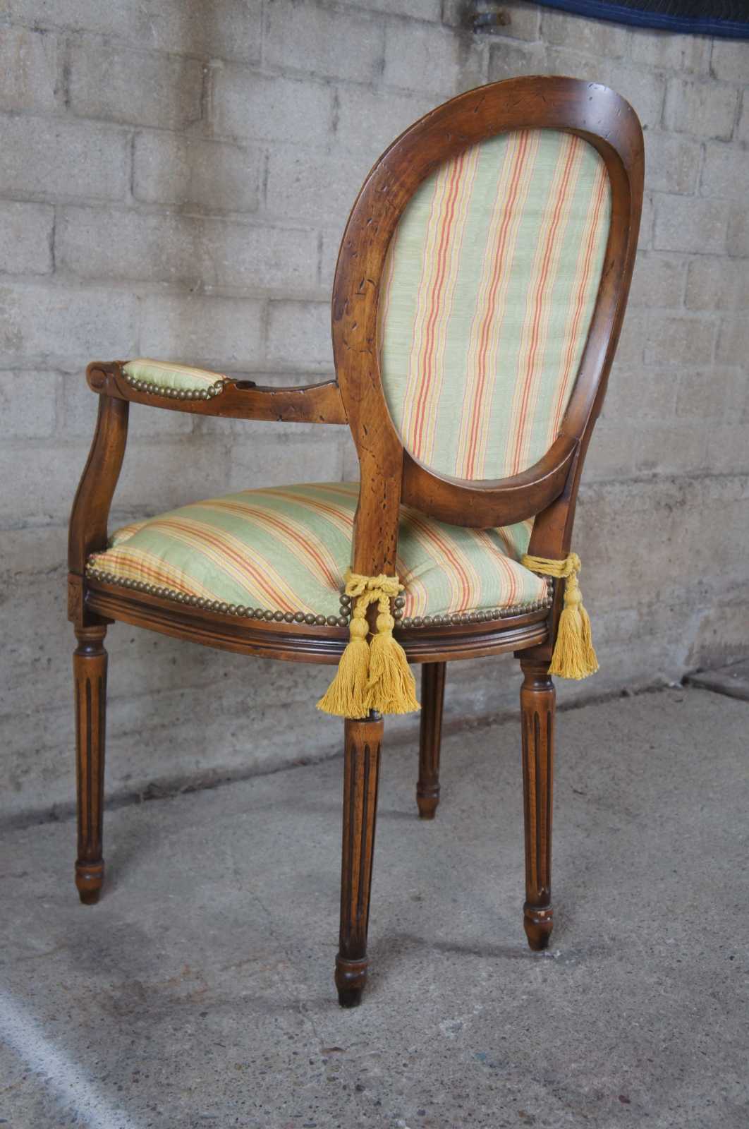 Italian made arm chair by Chateau D'AX. Walnut with padded arms, round back, striped upholstery, nailhead trim and tapered fluted legs. Marked along along underside.