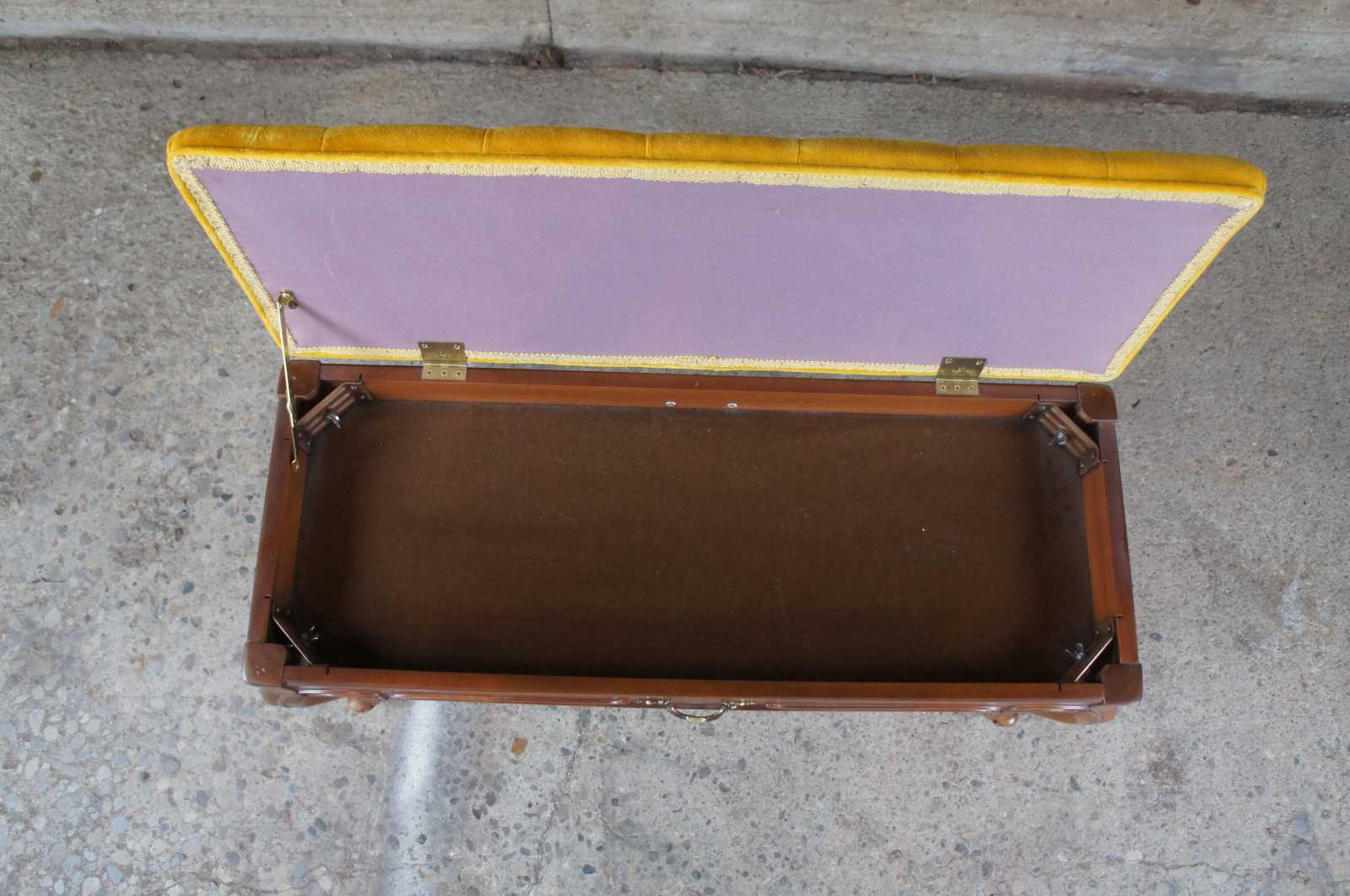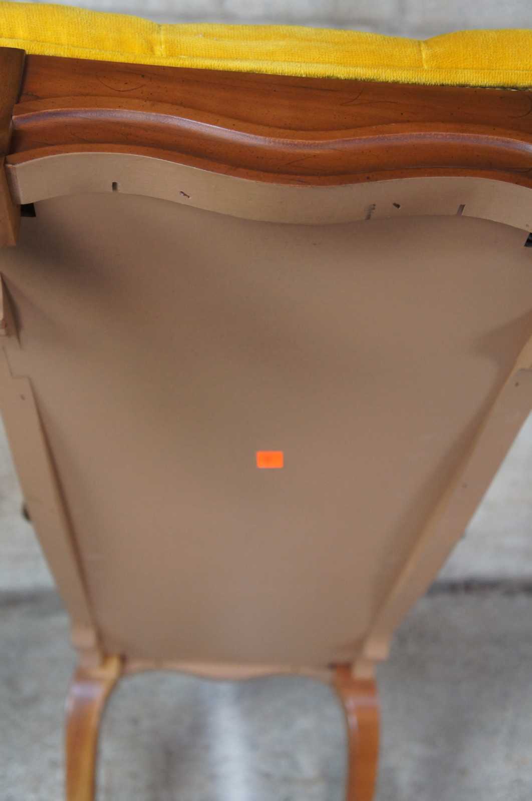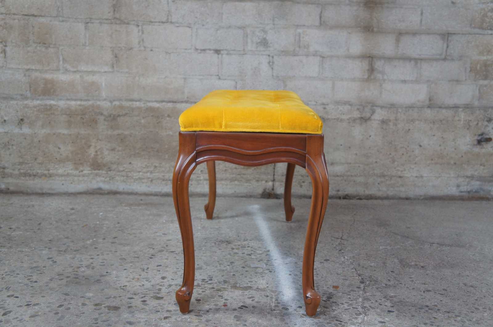 Vintage piano bench finished in walnut featuring yellow tufted upholstery and French Provincial styling. Circa 1980s.