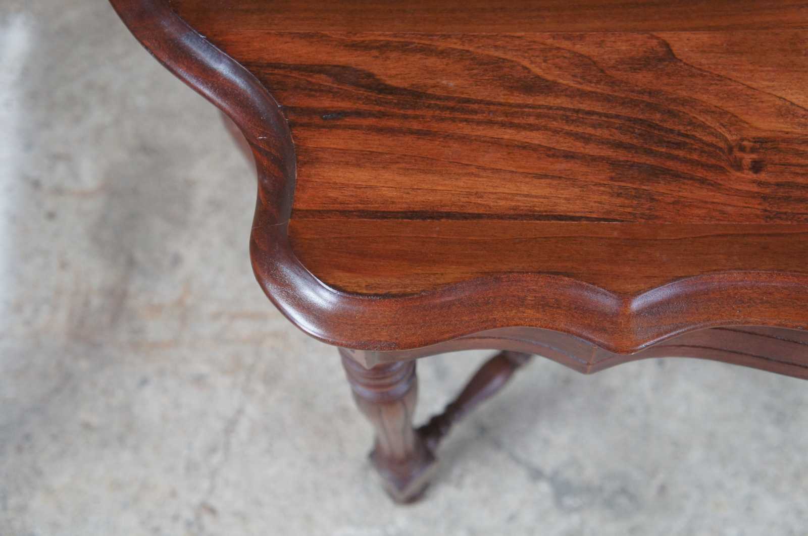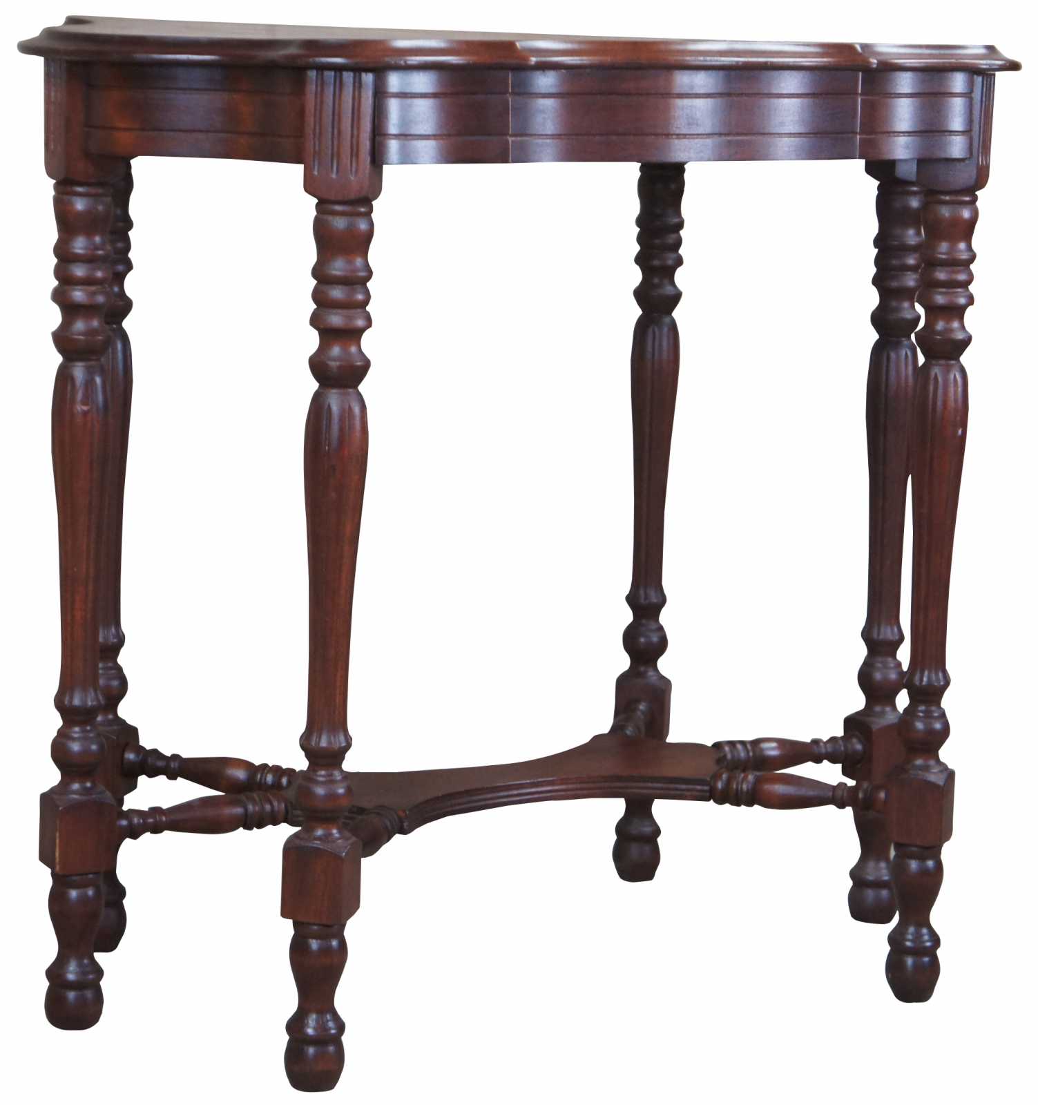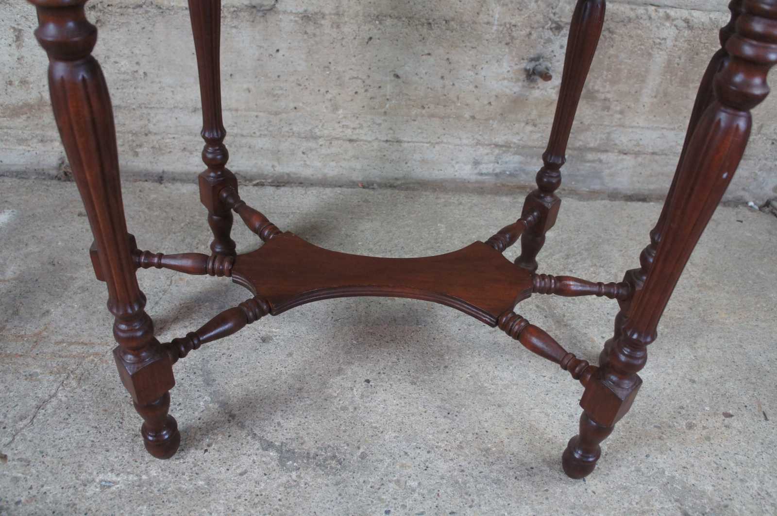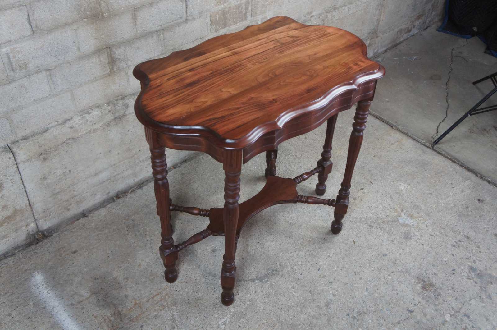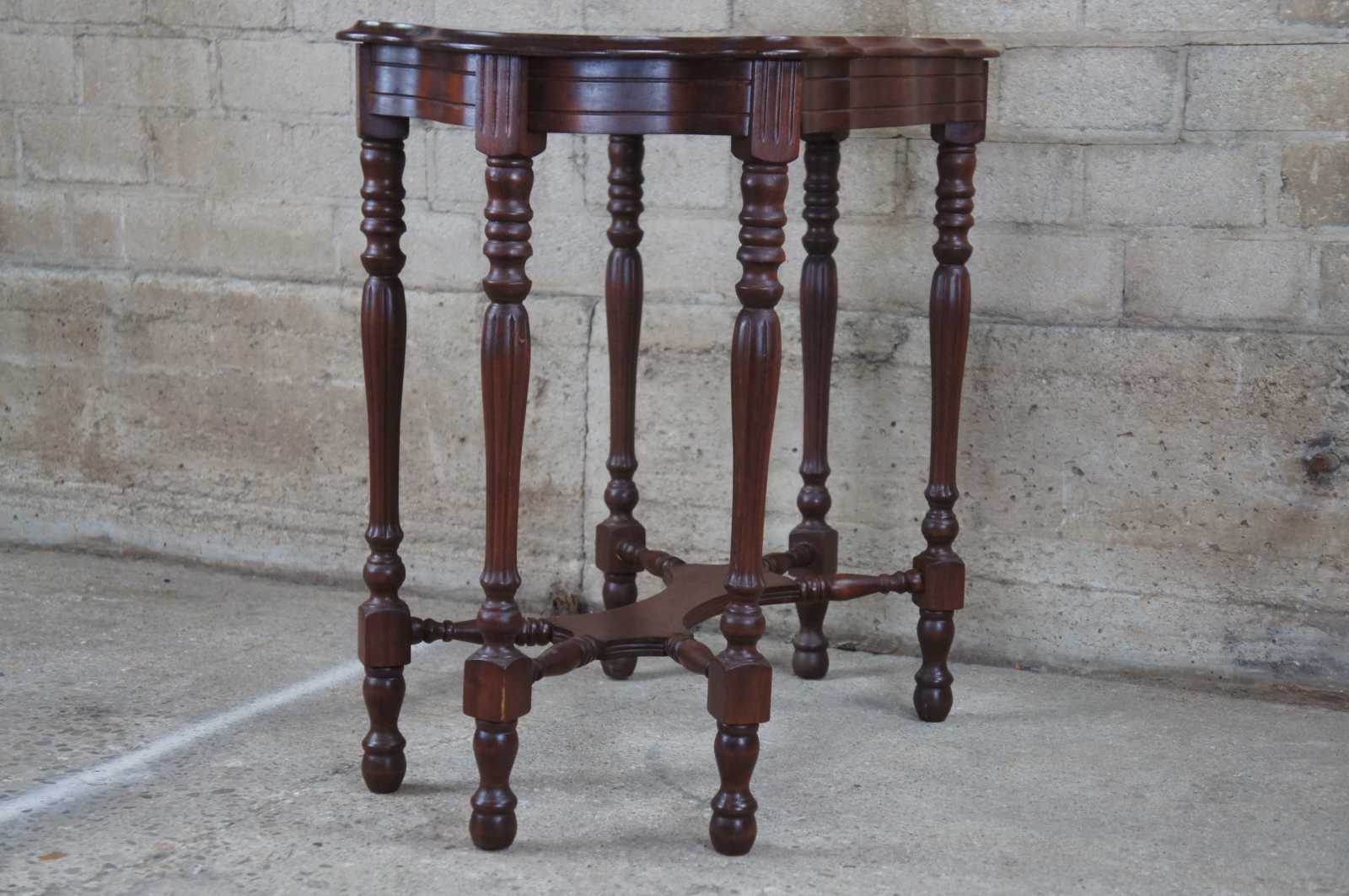 Vintage Jacobean turtle top side table. Made of walnut with scalloped shape with ogee edge. The table is supported by six turned legs tapering fluted legs connected by a turned stretcher and nubby feet.