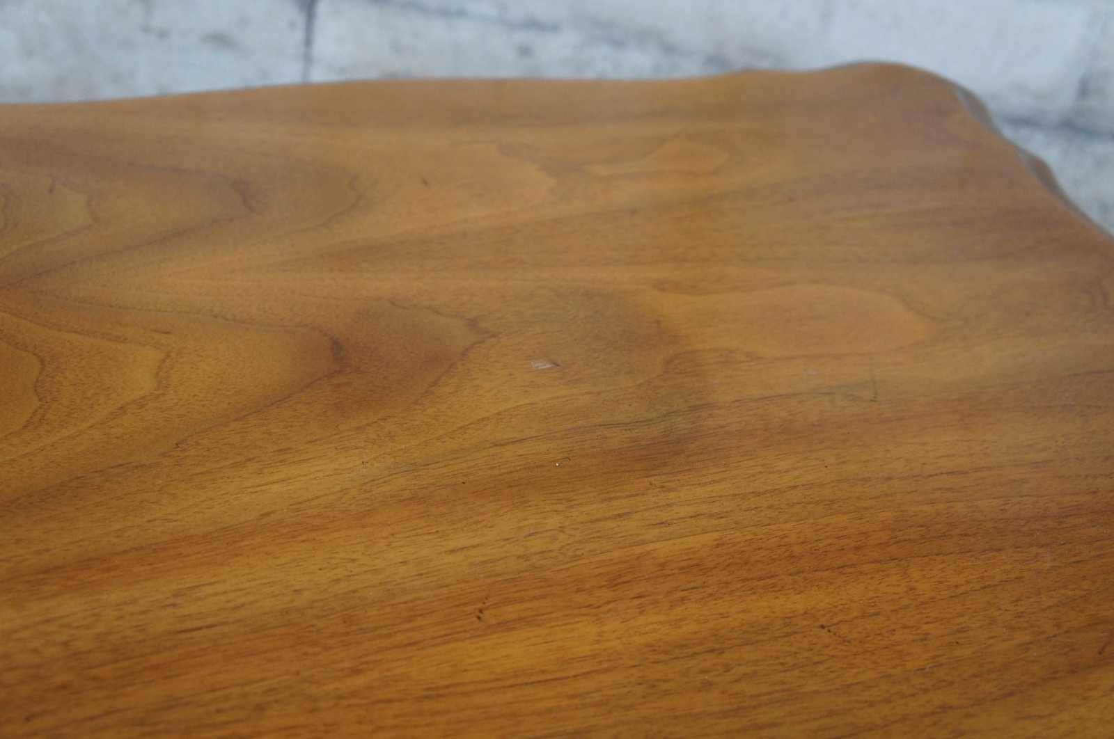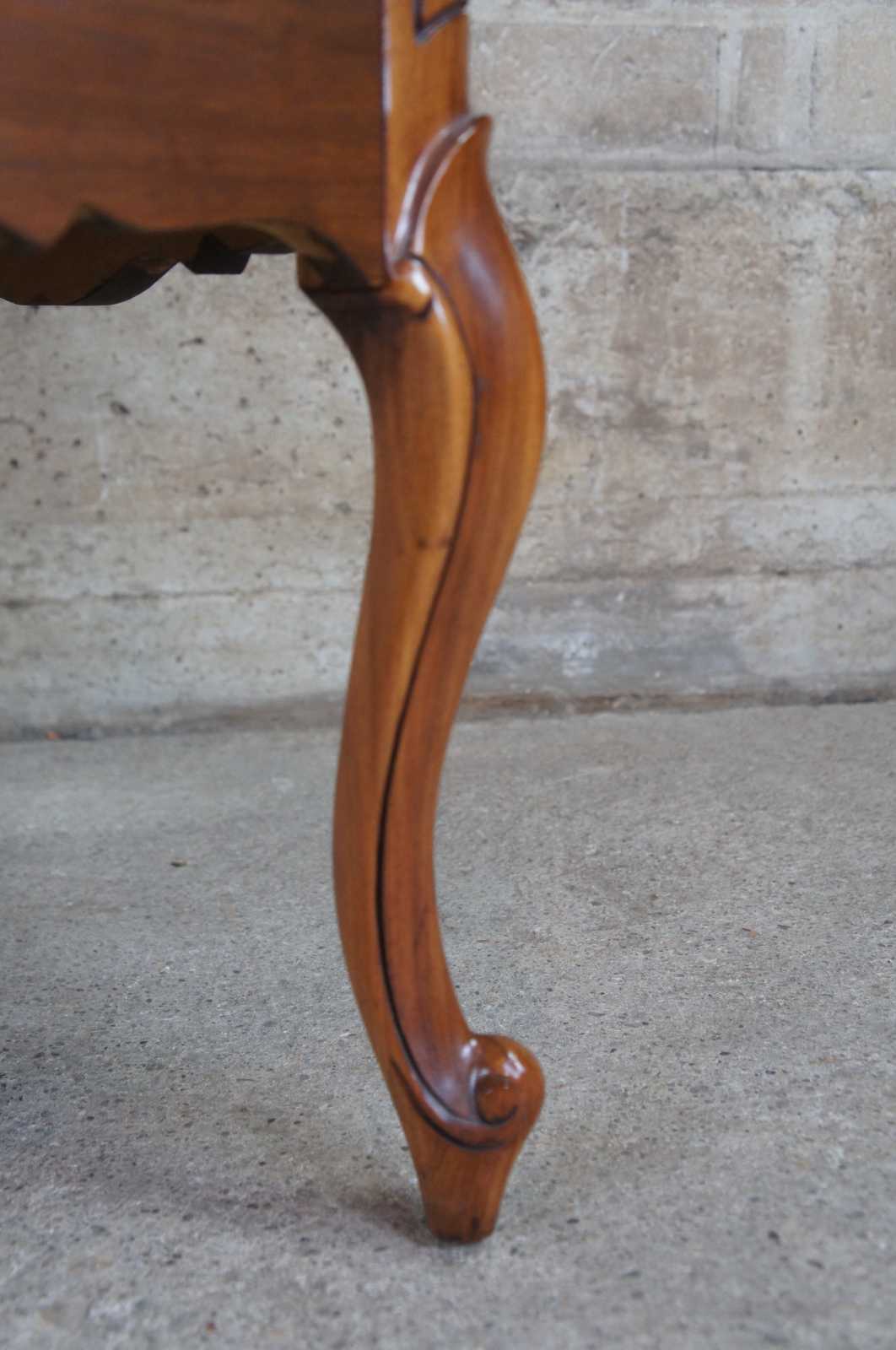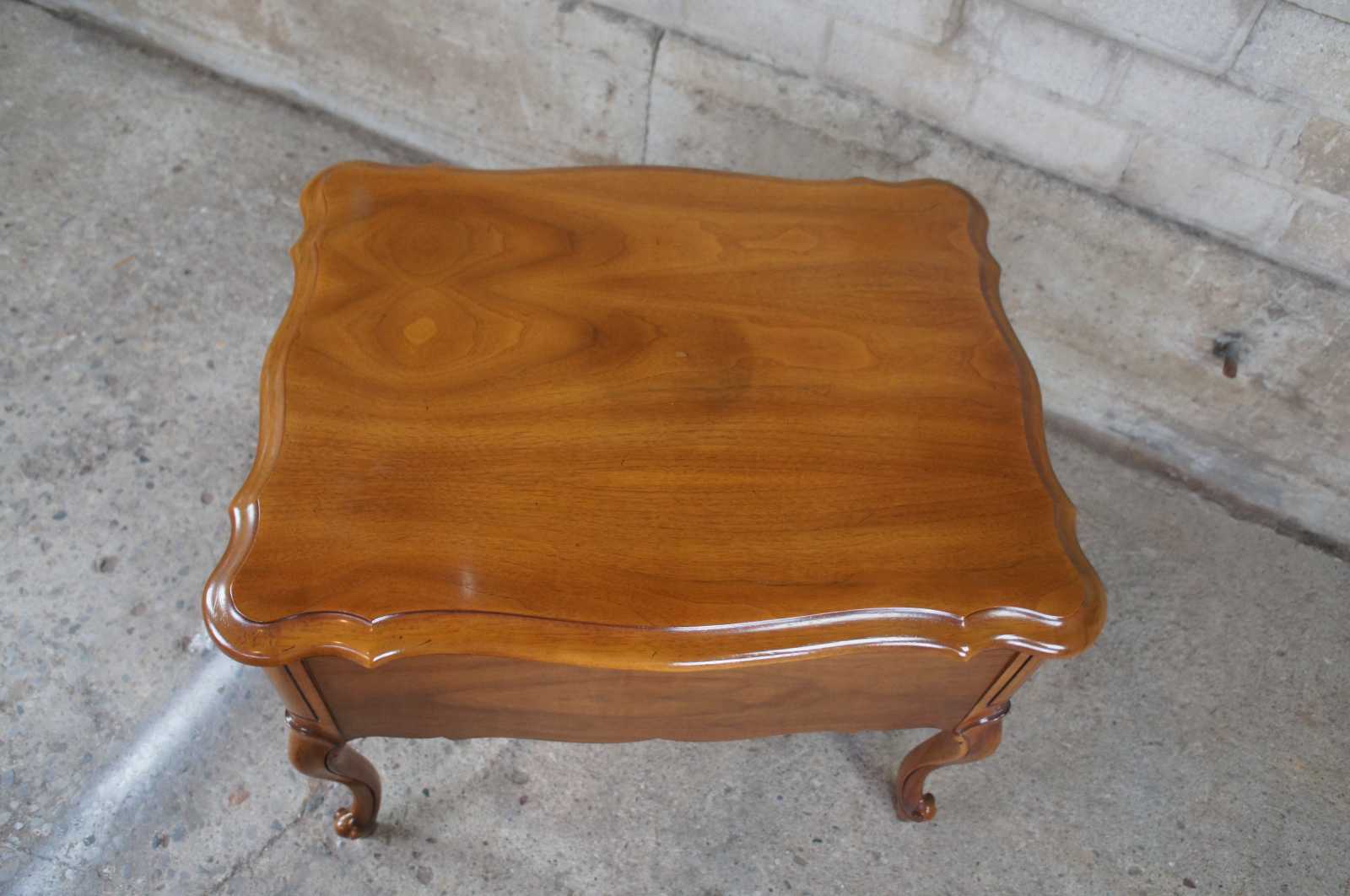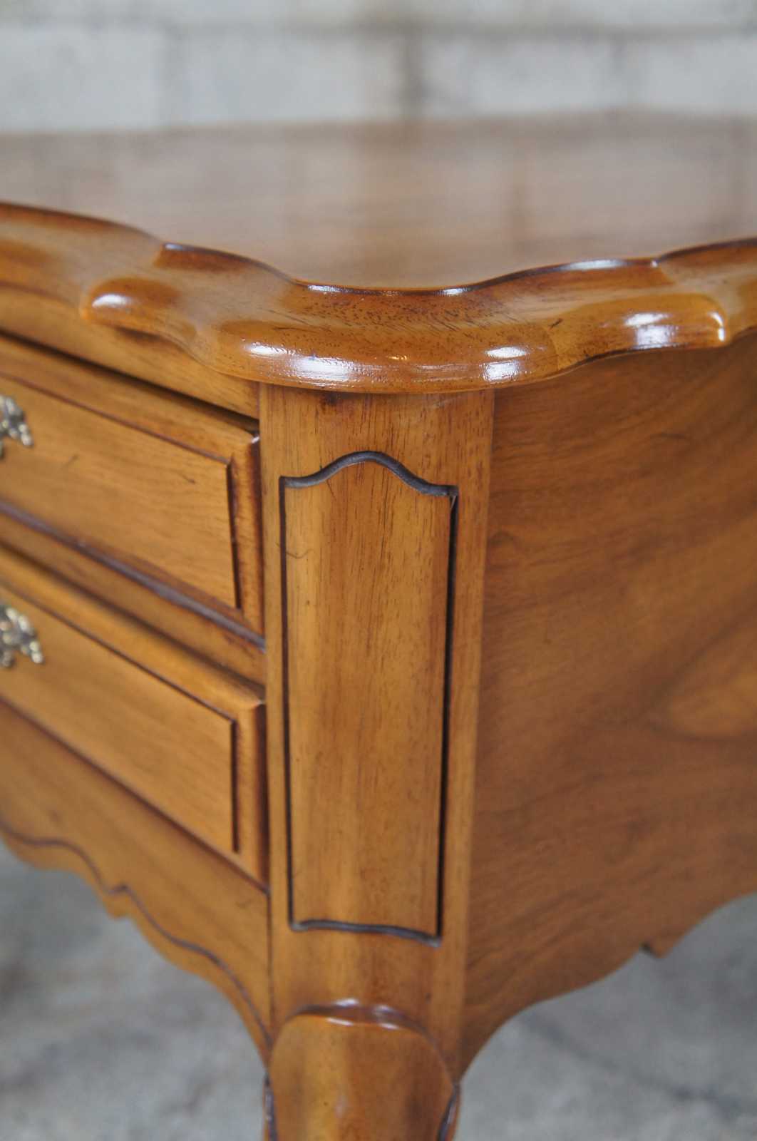 Vintage Hammary Maisonette French Louis XV chairside tables or nightstands. Made of walnut featuring a scalloped serpentine design over two drawers and cabriole legs.