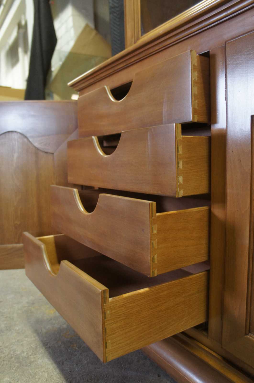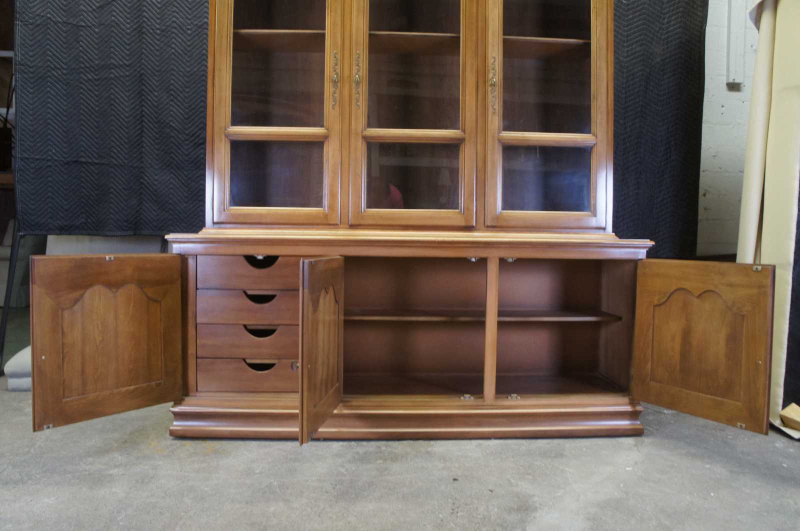 Circa 1970s Century Furniture Italian Provincial China Cabinet. Made from walnut with a stepback hutch featuring 3 shelves for display of china and collectibles. Buffet portion opens to 4 drawers and accessory storage.