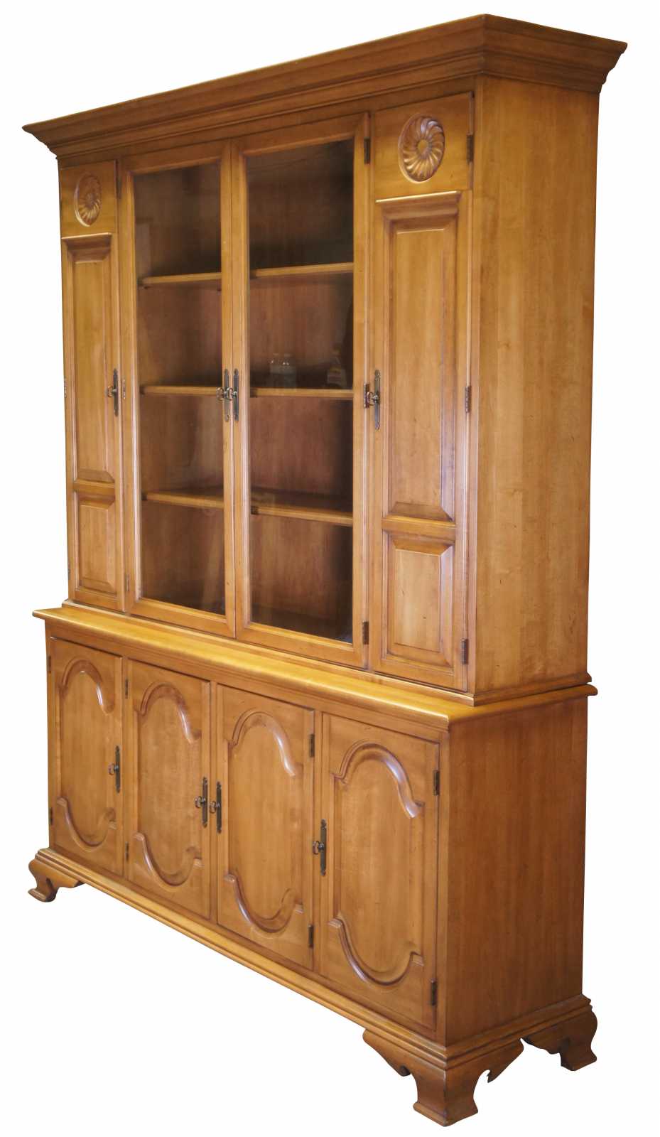 Circa 1970s Italian Provincial China Hutch. Made from walnut with a stepback top with 4 glass covered shelves. Features outer cabinet, lower storage, floral carvings and bracket feet.