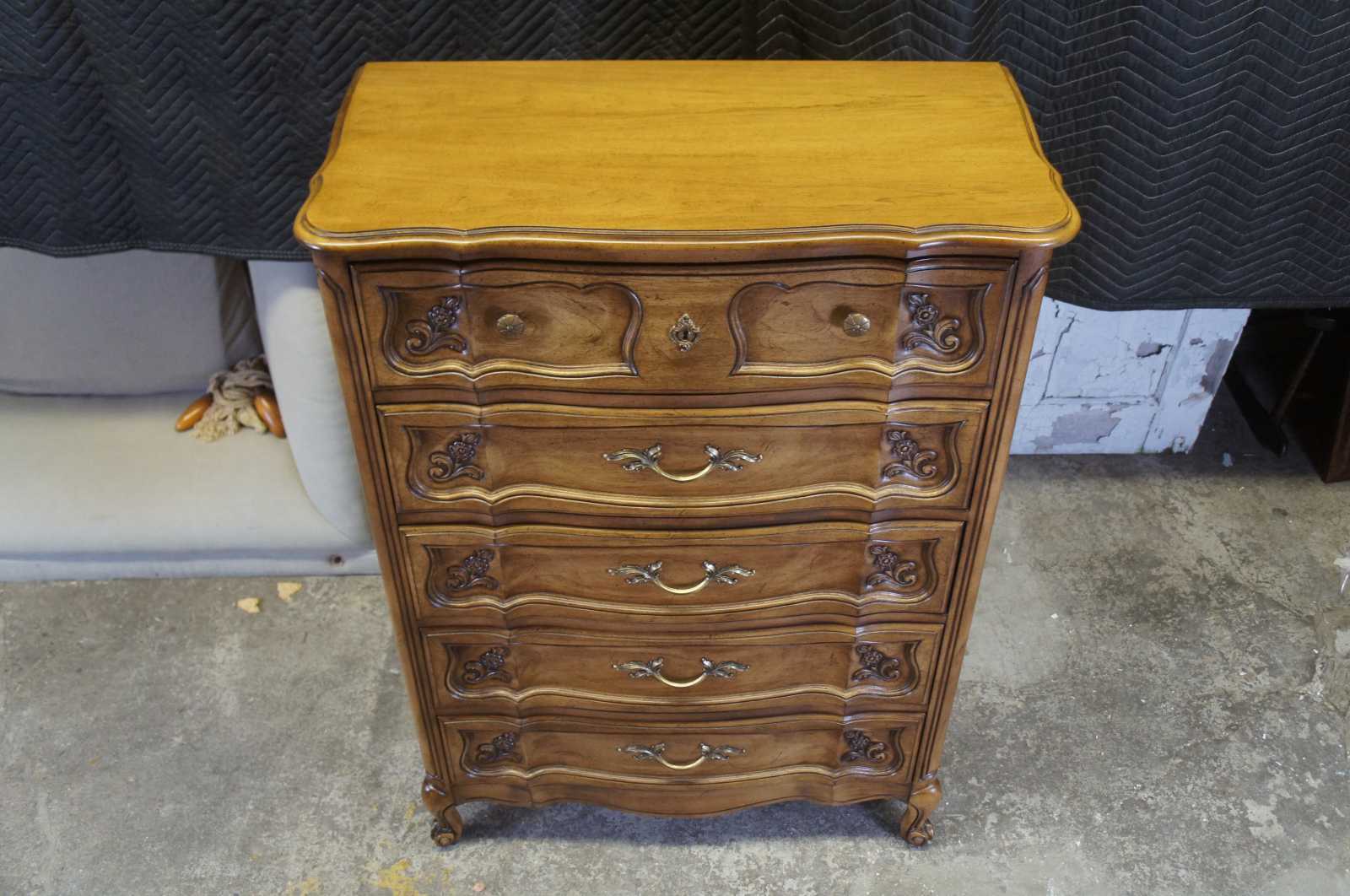 Circa 1960s French Provincial Chest of Drawers by Basic Witz. Made from fruitwood with a serpentine form and carved accents.