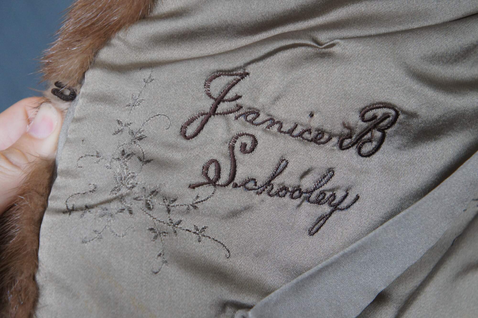 Vintage mid century medium brown mink fur wrap / cape from Donenfelds of Dayton, OH, featuring a floral silk lining with shoulder straps, hook and loop closure, and two pockets on the front. Personalized with the name Janice B Schooley.