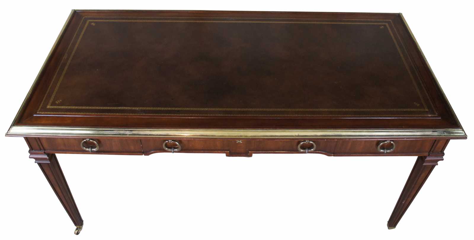 Vintage Sligh Furniture writing desk. Made of mahogany with brass edgework, tooled leather top featuring greek key, fleur de lis, repeating spades and neoclassical drawer pulls.