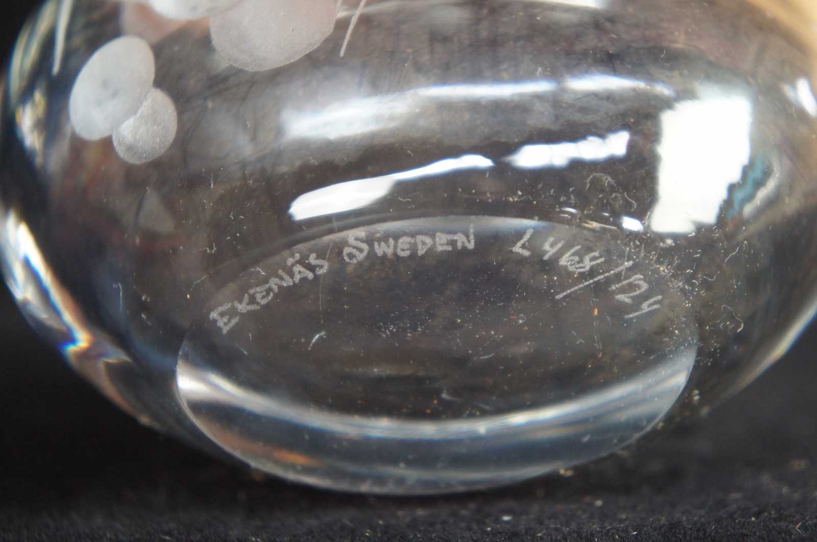 Vintage Ekenas Sweden etched glass oval bud vase with an image of mushrooms next to a branching wild flower.