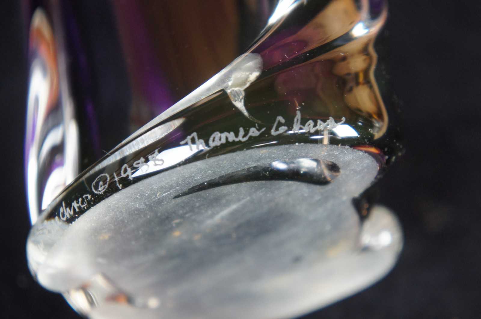 Vintage 1998 signed art glass purple tulip vase by Matthew Buechner for Thames Glass. “For nearly 40 years, Matthew Buechner has dedicated his life to his passion for glassblowing. Born and raised in Corning, New York to father Thomas, a renowned glassblower, painter, and writer and mother Mary, also an artist, Matthew grew up in a life surrounding art. Matthew attributes his appreciation for making and collecting art to his loving, artistic parents.