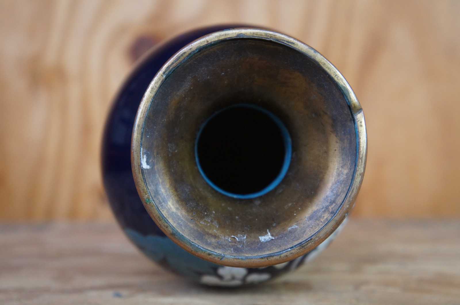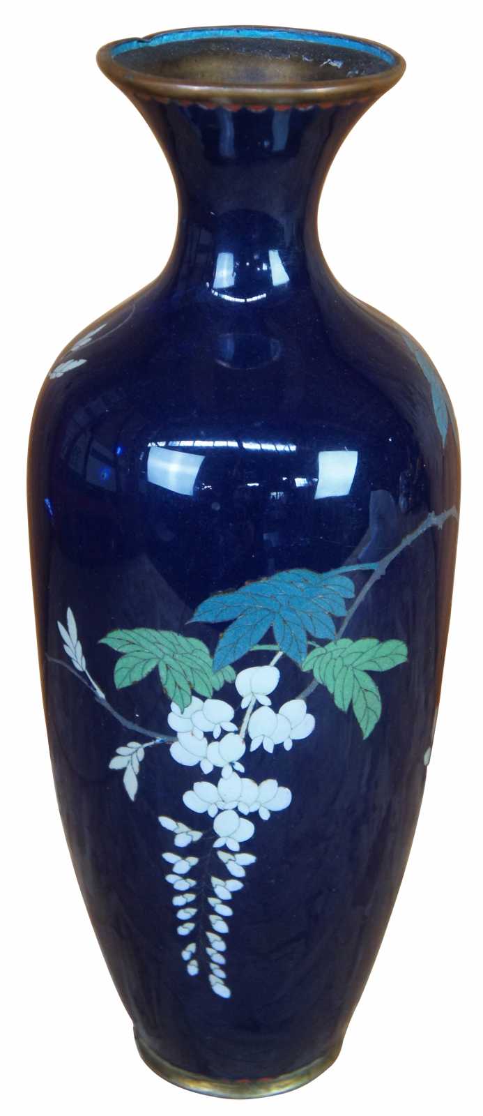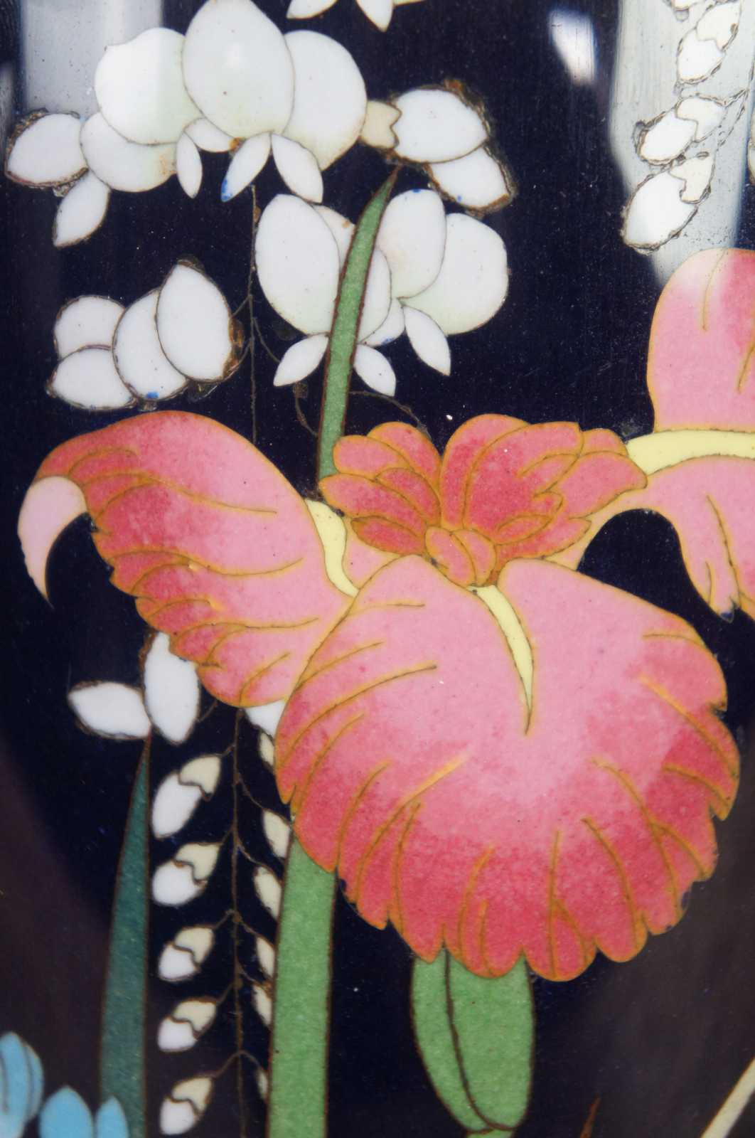 Tall vintage cloisonne vase with navy blue background setting off blue and pink irises and drooping lily of the valley.