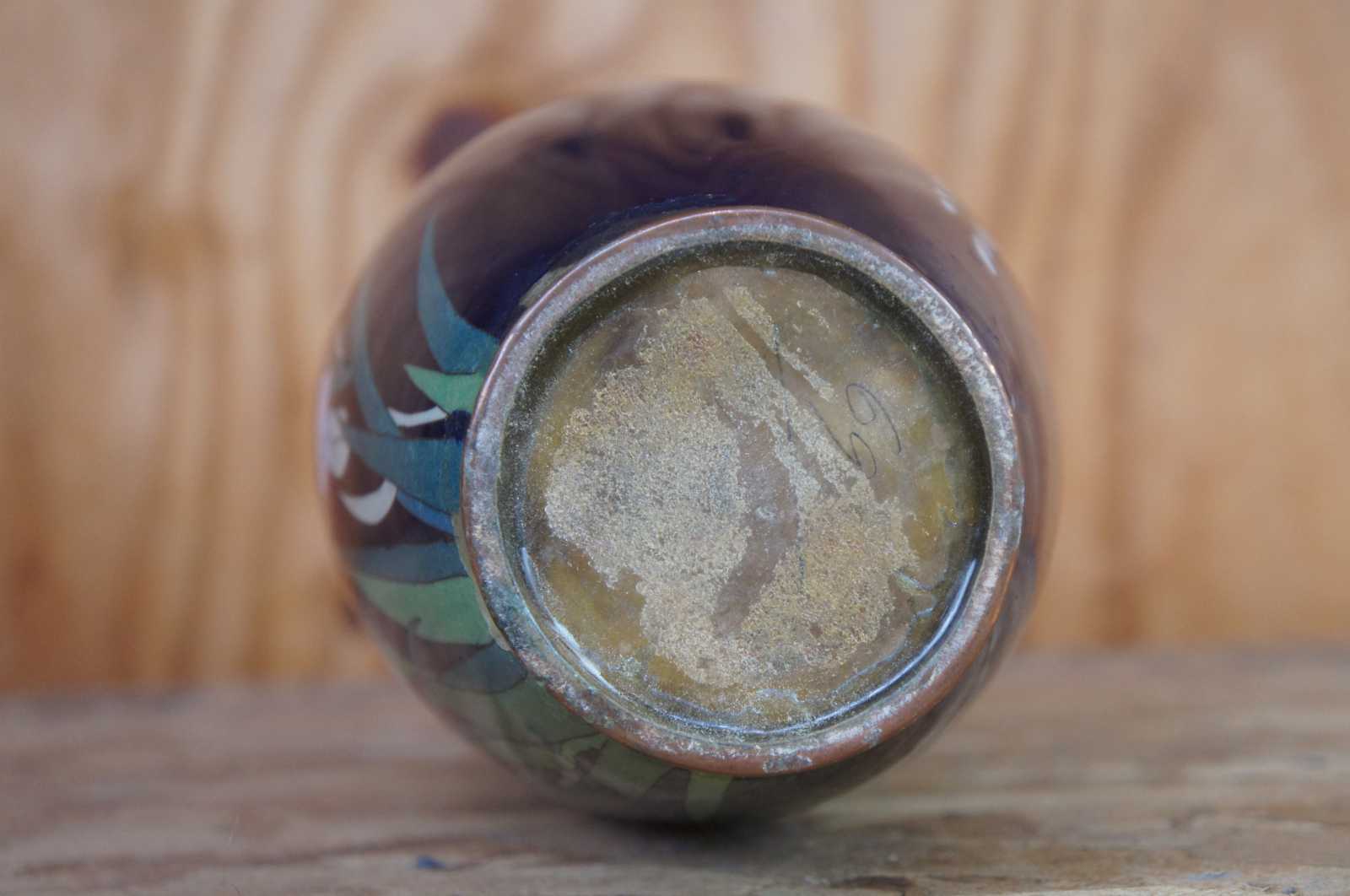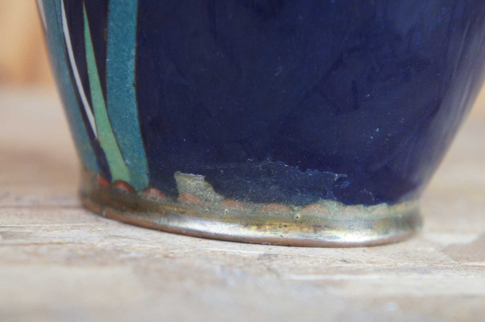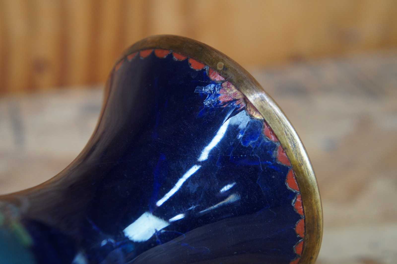 Tall vintage cloisonne vase with navy blue background setting off blue and pink irises and drooping lily of the valley.