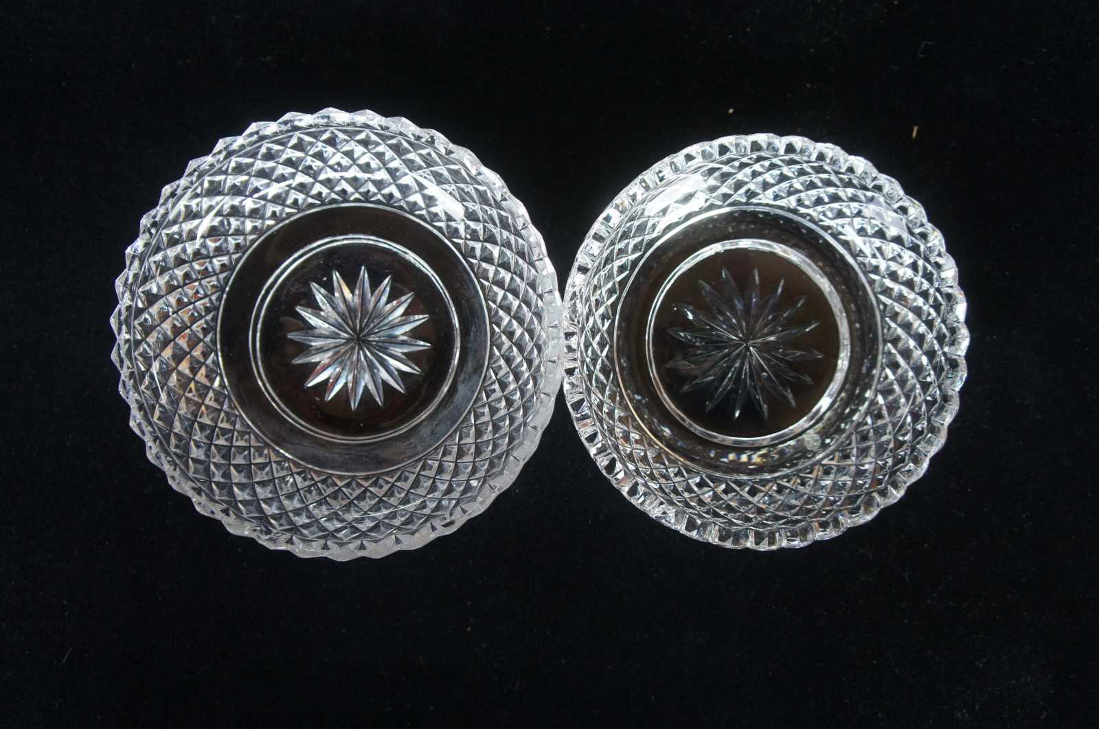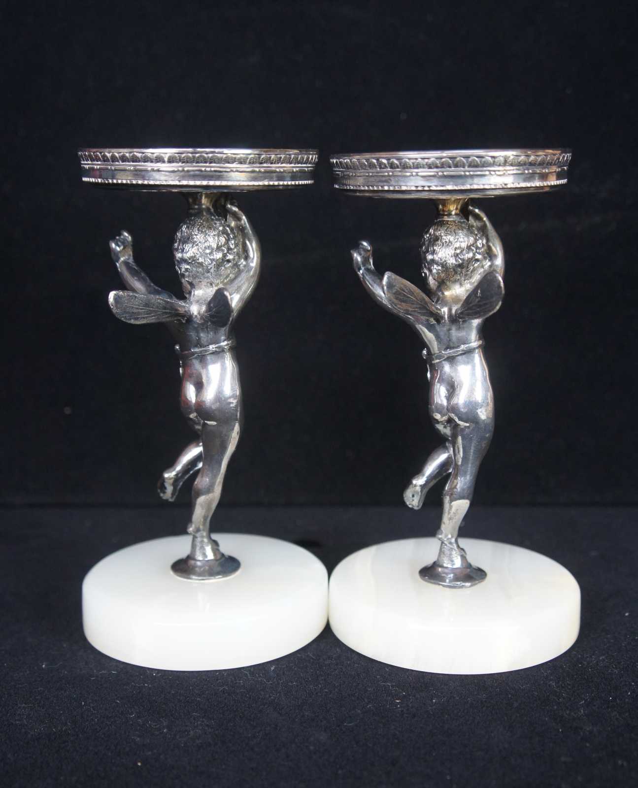 Pair of two antique art nouveau silver plate stands shaped like dancing fairies (instead of the usual wingless or angel-winged cherubs, these figures have dragonfly wings) on a white marble base and topped with cut glass compotes.