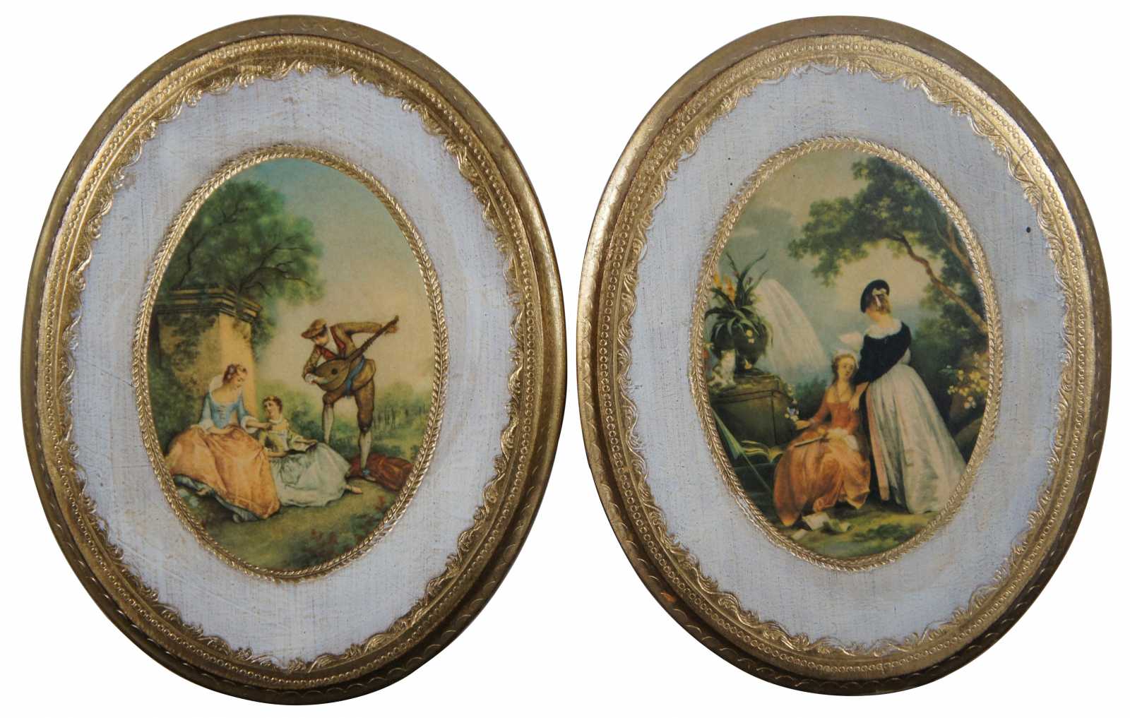 Set of four white and gold oval wooden wall plaques with decoupage classical scenes, made in Italy.