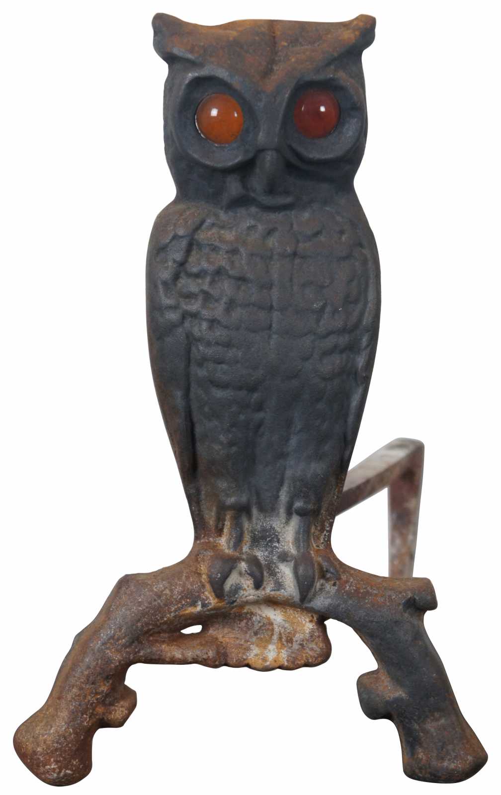 Pair of antique cast iron owl shaped fireplace andirons with orignal amber glass eyes.