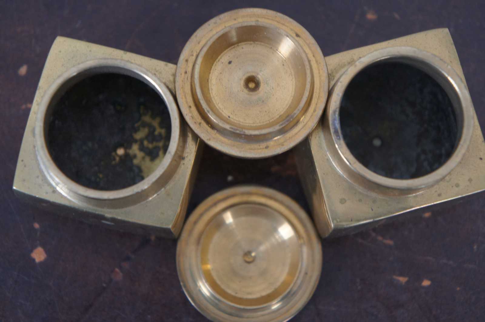 Antique Brass Double Inkwell Desktop Writing Ink Pen Stand w Pierced Gallery 8"