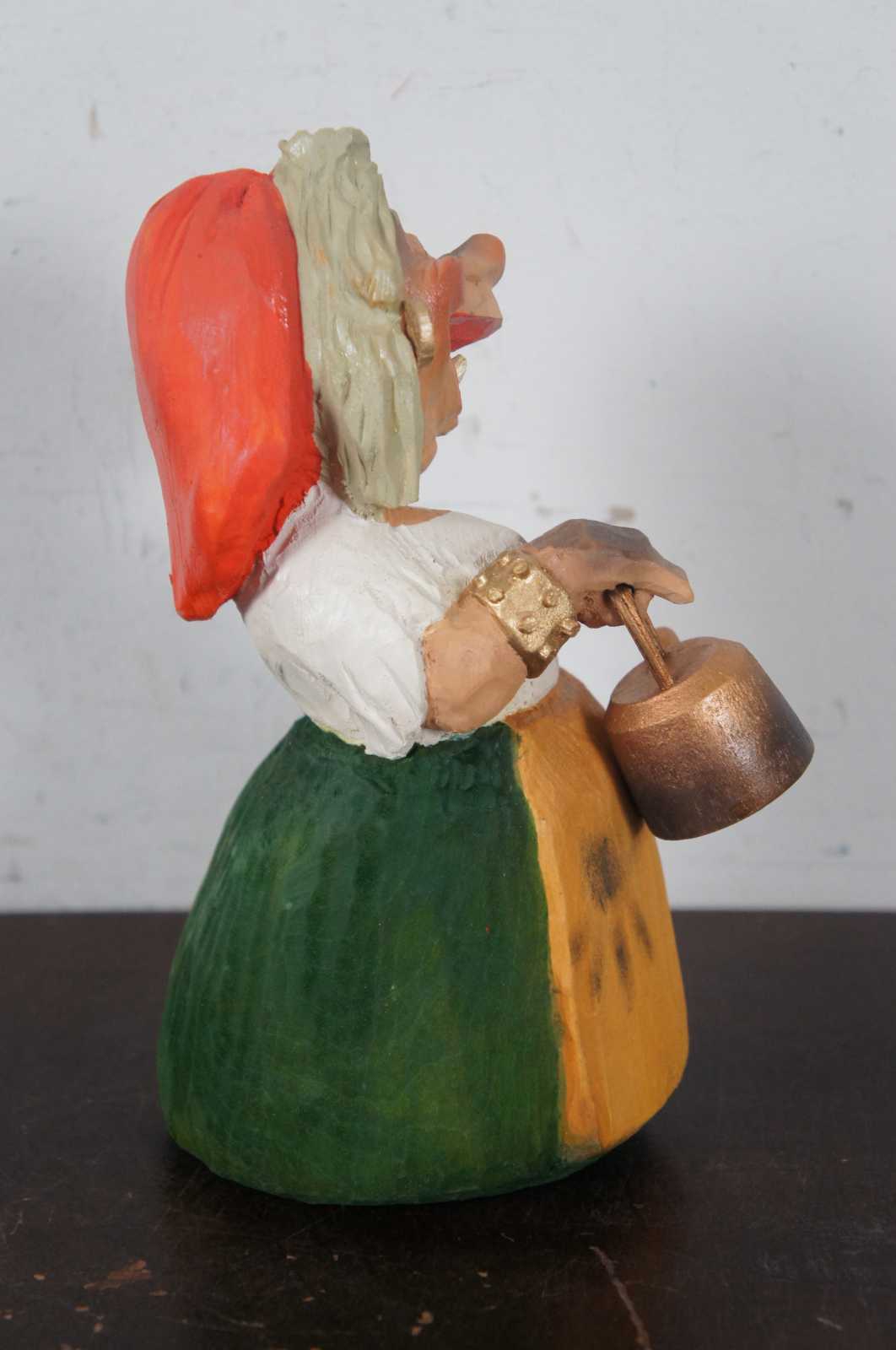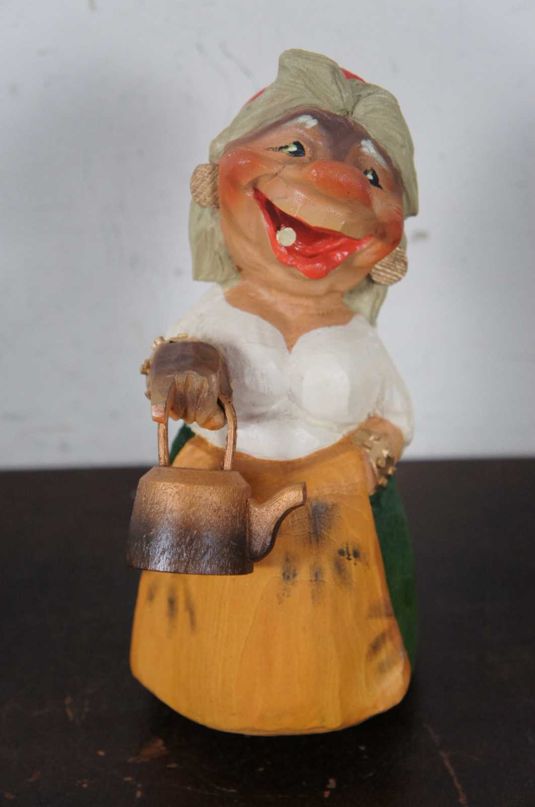Vintage hand carved troll figurine by Henning (catalogue number 119), dressed in a white shirt, green skirt, yellow apron, red hat, and gold jewelry, holding a copper tea kettle. Marked “Yenta NYC 10/’90 Engelsen since 1947” by previous owner in pen on base. “In Norwegian folklore there are many supernatural beings. The most famous of these are the trolls. At twilight time they emerge from the hills and mountains. They are rather huge and sometimes dangerous, but they might wink knowingly. - Henning Englesen's workshop is situated at Toten, a rural district 120 km north of Oslo. The workshop was built in 1950 in a personal style. Engelsen and his family have managed to create a good and inspiring atmosphere among the employees who all come from the district.”
