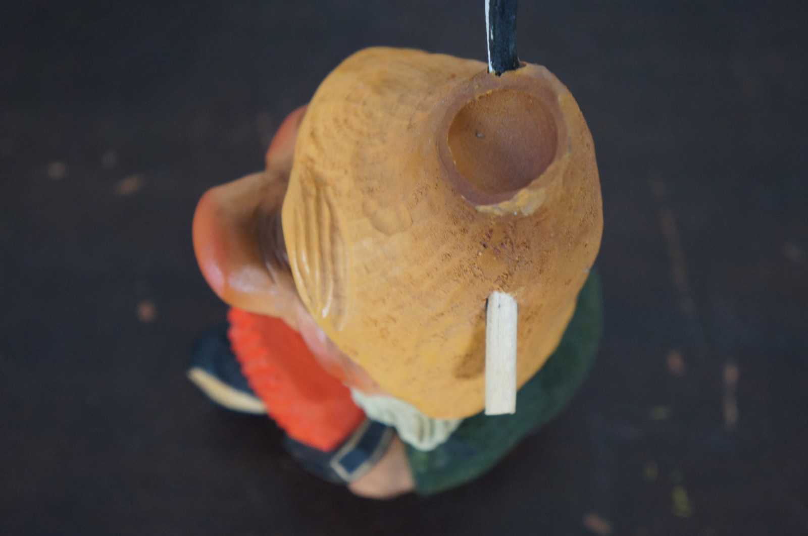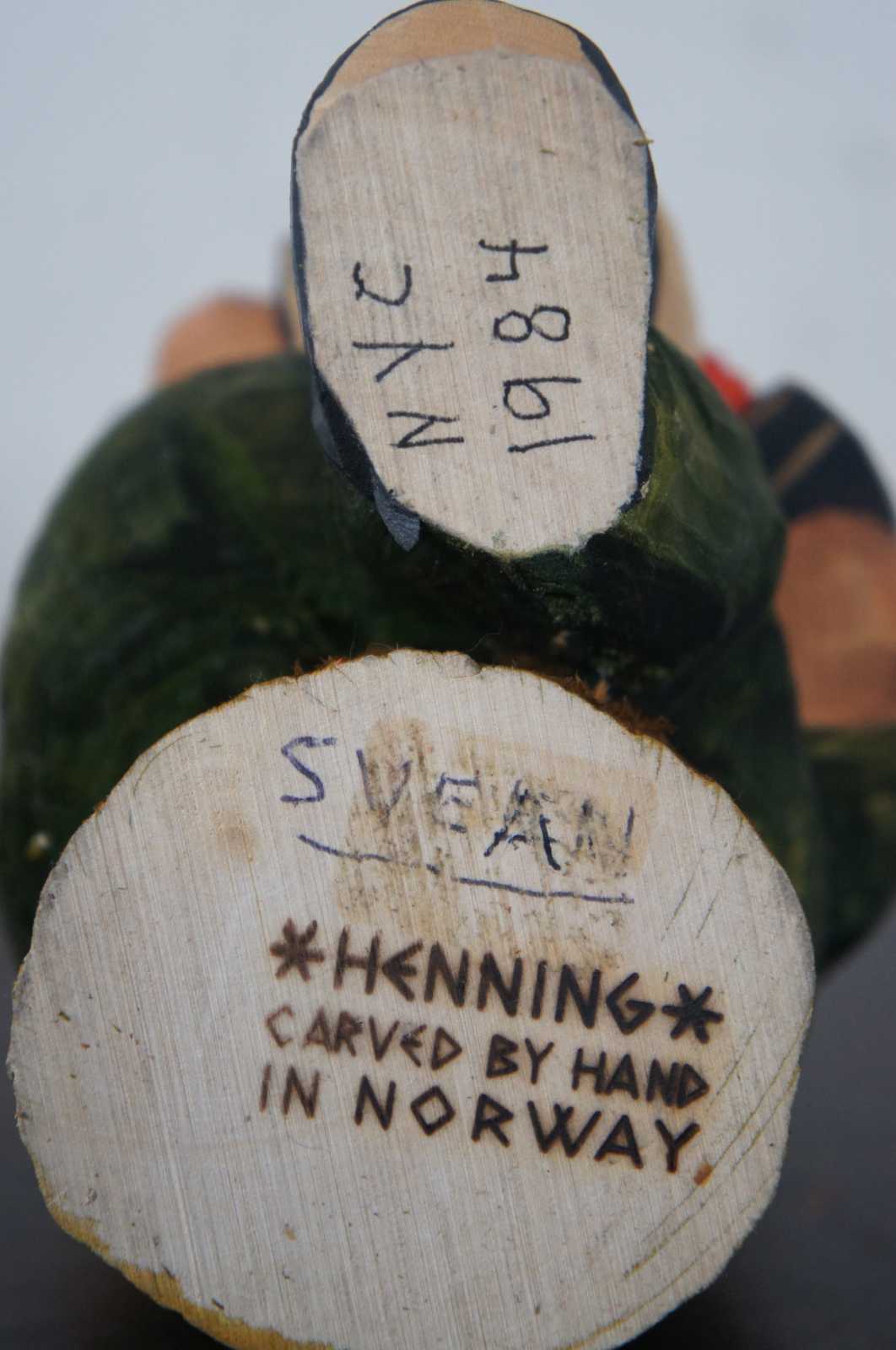 Vintage hand carved troll figurine by Henning (catalogue number 131), dressed in green with black buckled shoes and yellow feathered hat, seated on a tree stump and playing the accordion. Marked “Svean NYC 1984” by previous owner in pen on base. “In Norwegian folklore there are many supernatural beings. The most famous of these are the trolls. At twilight time they emerge from the hills and mountains. They are rather huge and sometimes dangerous, but they might wink knowingly. - Henning Englesen’s workshop is situated at Toten, a rural district 120 km north of Oslo. The workshop was built in 1950 in a personal style. Engelsen and his family have managed to create a good and inspiring atmosphere among the employees who all come from the district.”