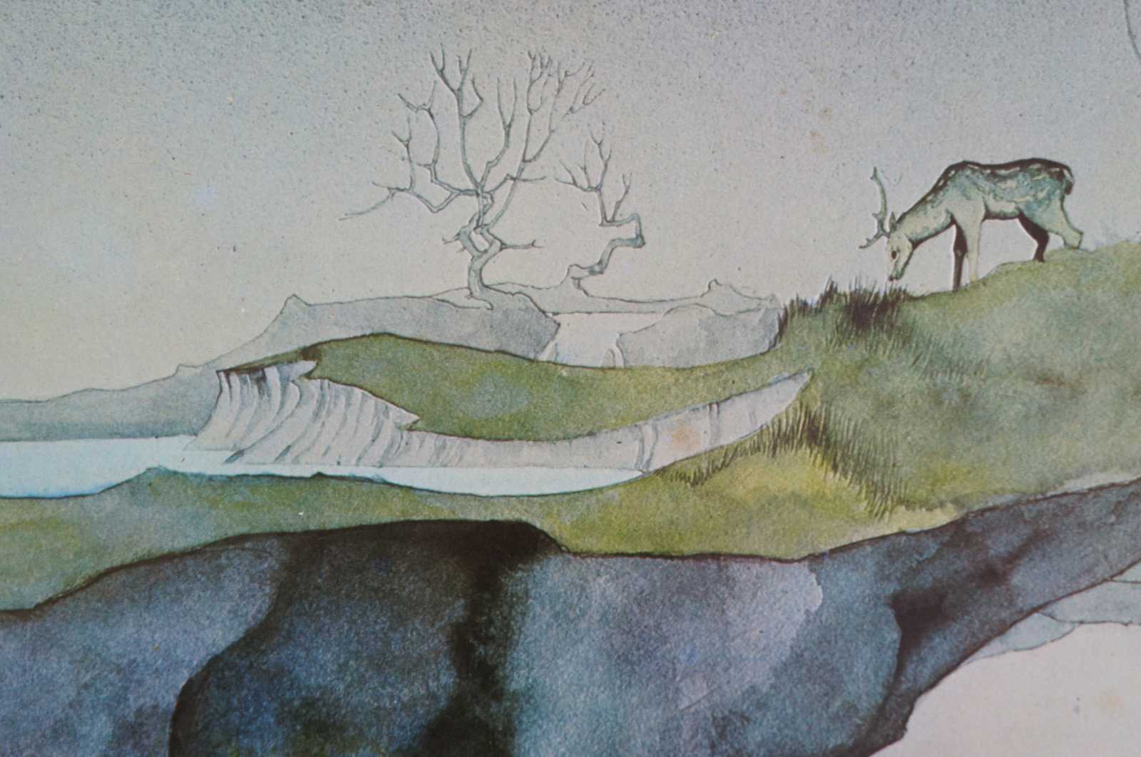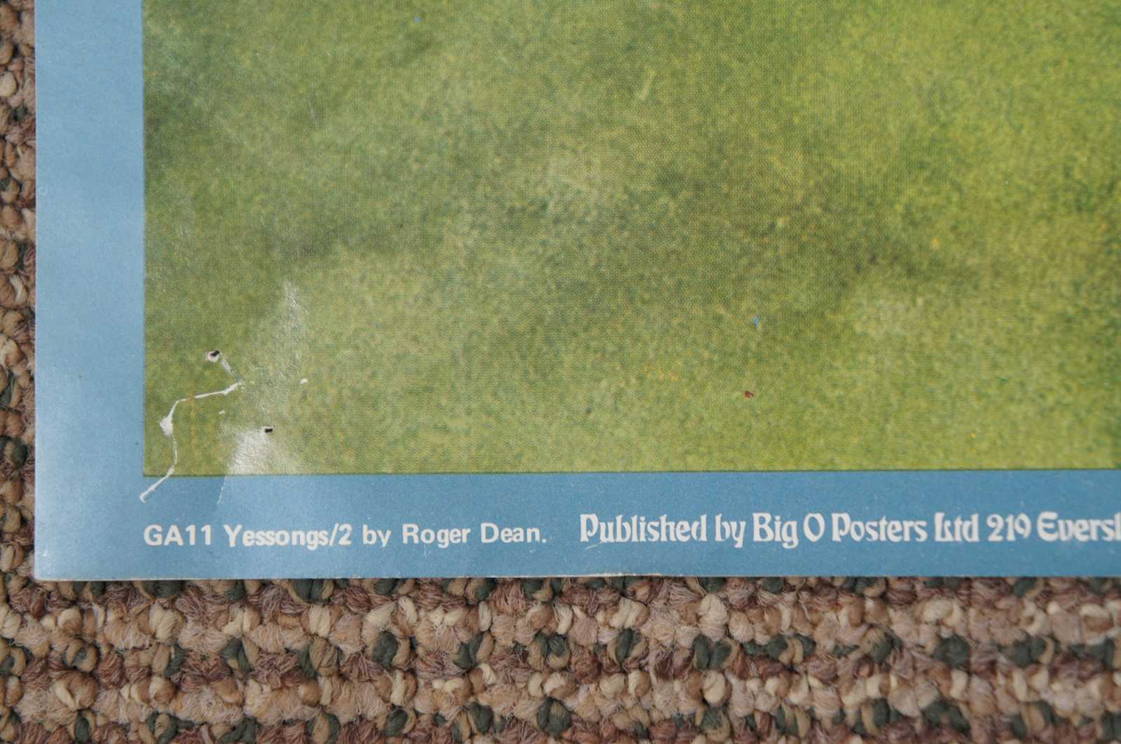 1973 poster print of one of the interior cover art landscapes from Yessongs featuring Moose grazing in the floating islands amongst Bonsai style tress. Yessongs is the first live album by the English progressive rock band Yes, released as a triple album in May 1973 on Atlantic Records. After completing their Close to the Edge Tour in April 1973, the band selected live recordings between February and December 1972 on their tours supporting Fragile (1971) and Close to the Edge (1972) for a live album release. They were then edited and remixed with their producer and live sound mixer Eddy Offord. Three tracks feature original Yes drummer Bill Bruford while the remaining tracks feature his replacement, Alan White.