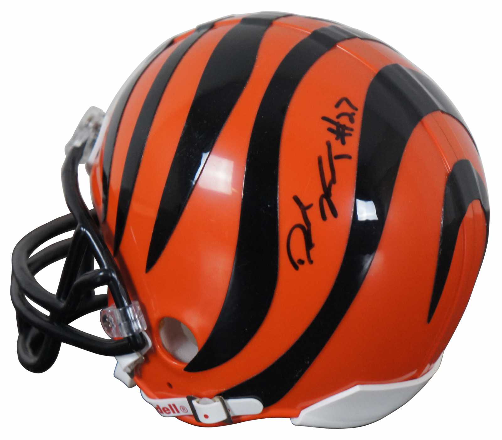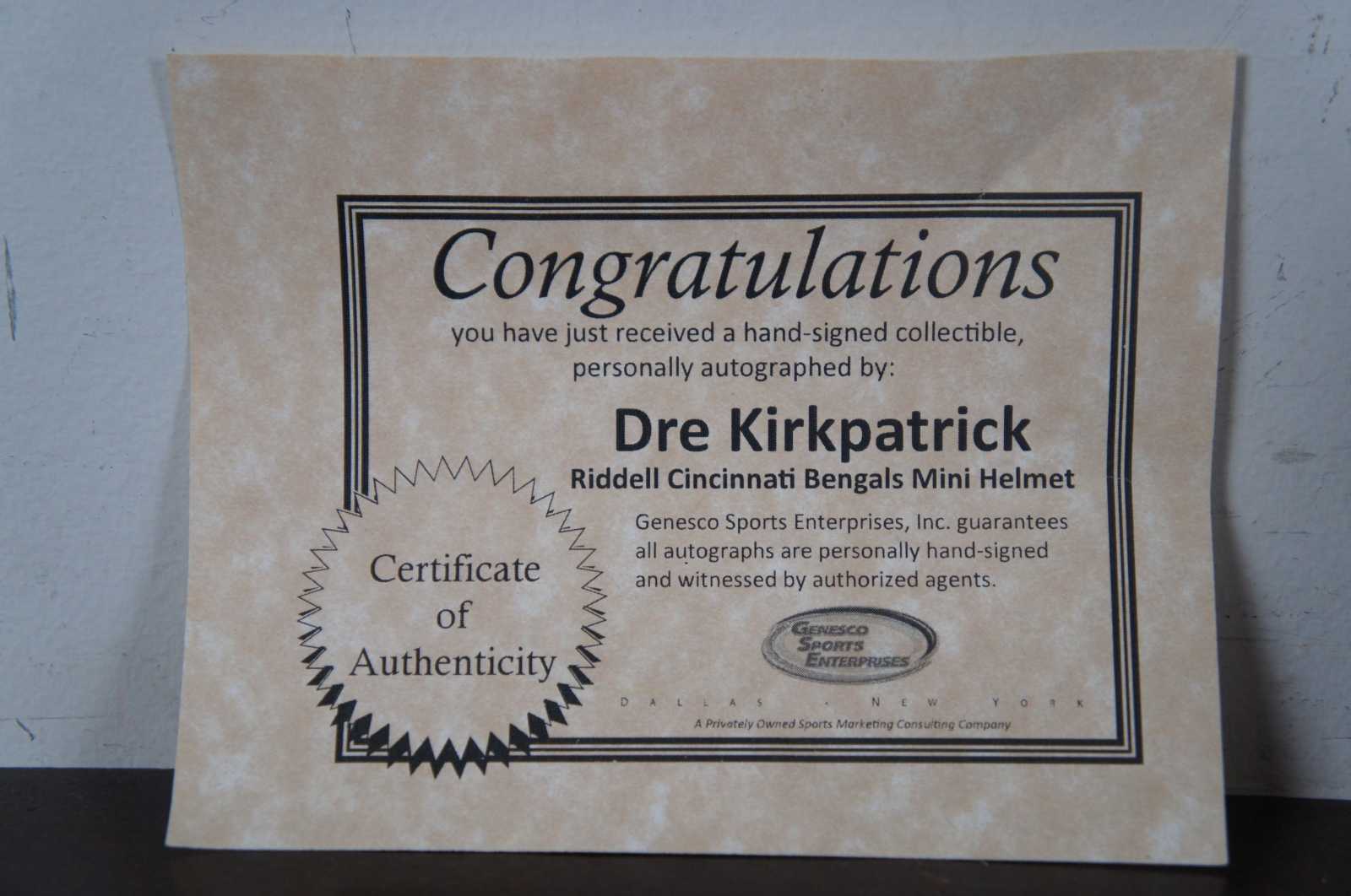 Riddell Cincinnati Bengals tiger striped mini helmet autographed by Dre Kirkpatrick; includes COA. “D'Andre Lawan "Dre" Kirkpatrick (born October 26, 1989) is an American football cornerback who is a free agent. He played college football at Alabama and was drafted by the Cincinnati Bengals in the first round of the 2012 NFL Draft.”