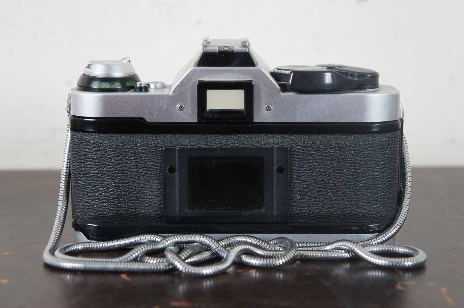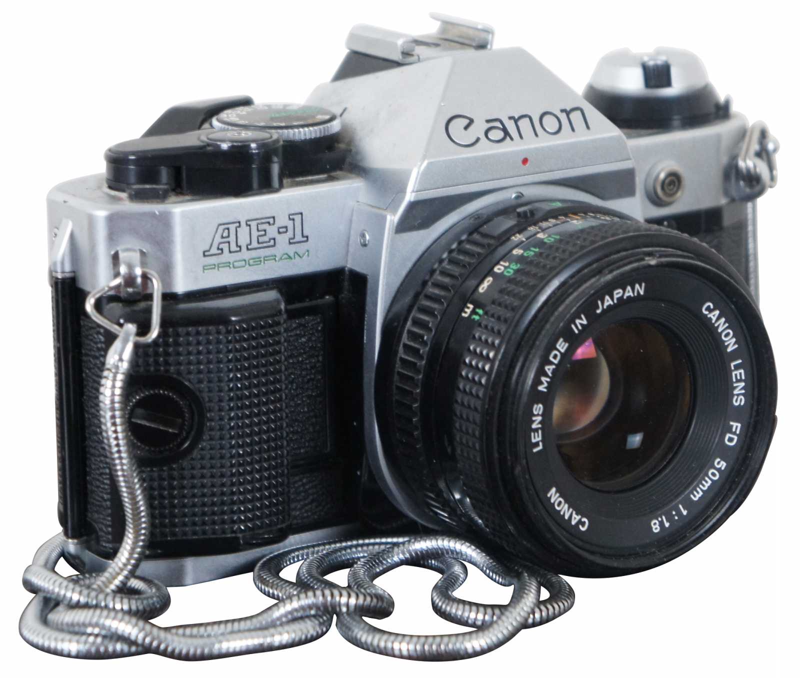 Vintage Canon AE-1 Program film camera with Canon lens FD 50mm 1:1.8 and chain strap.