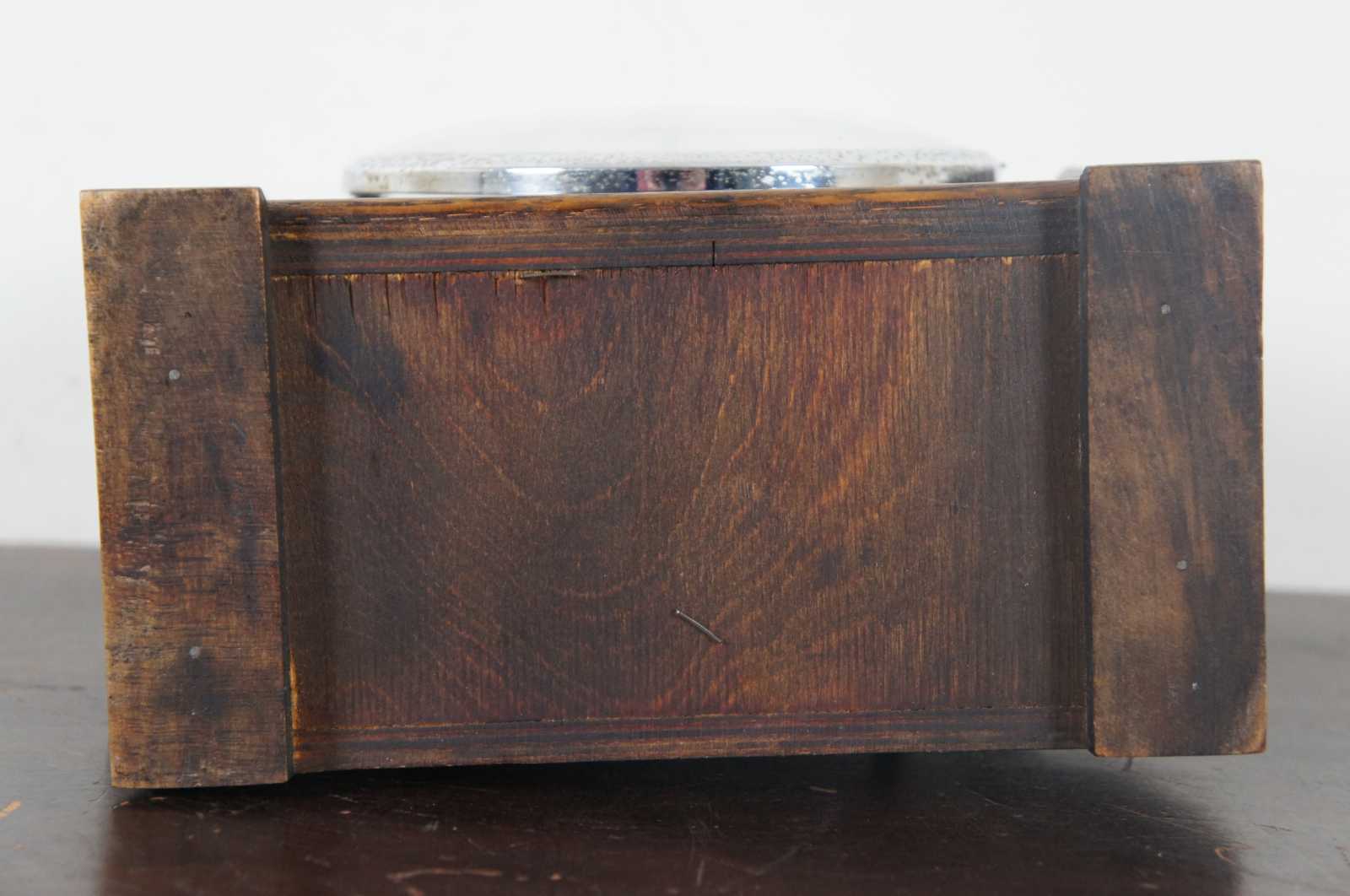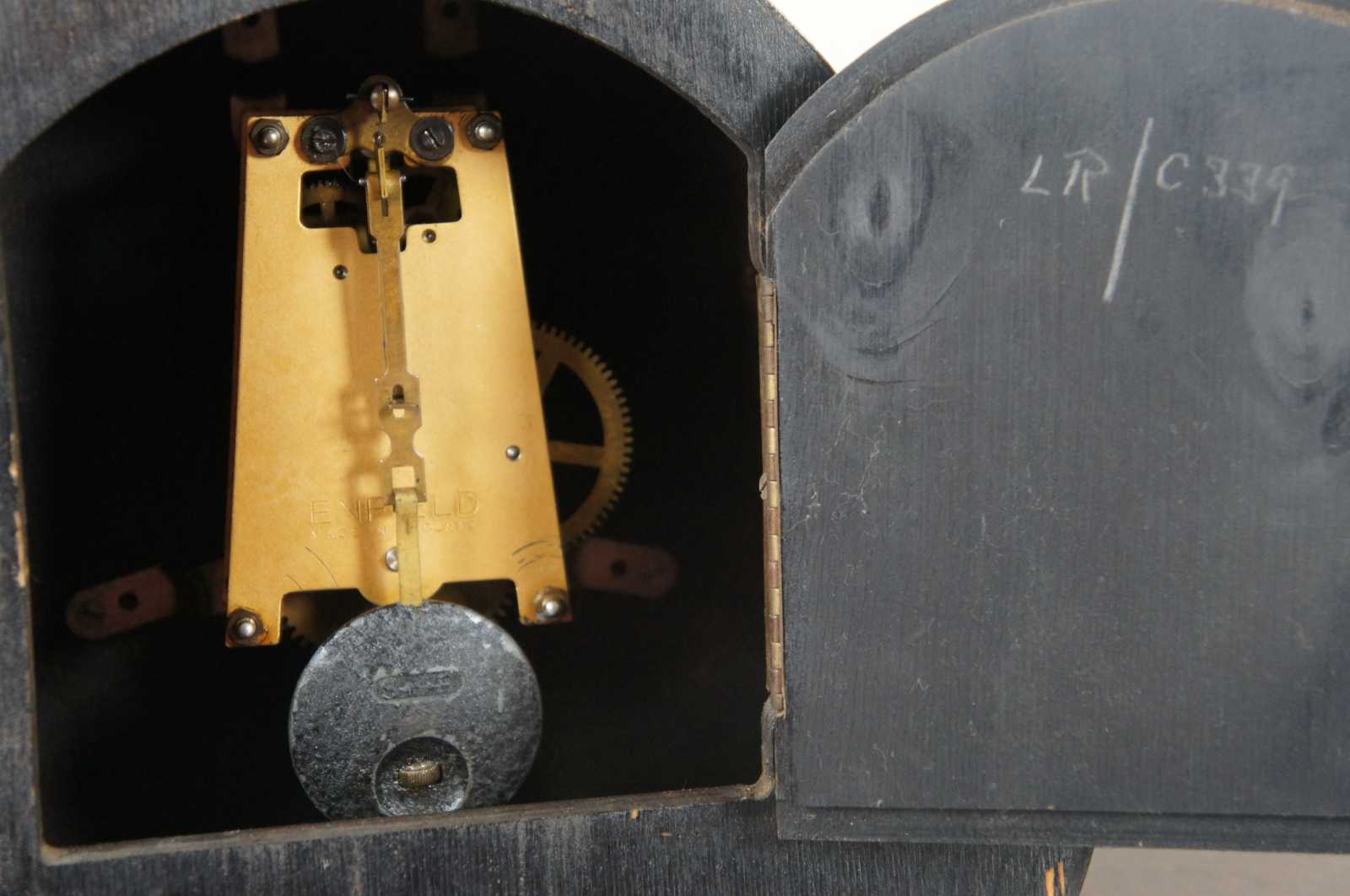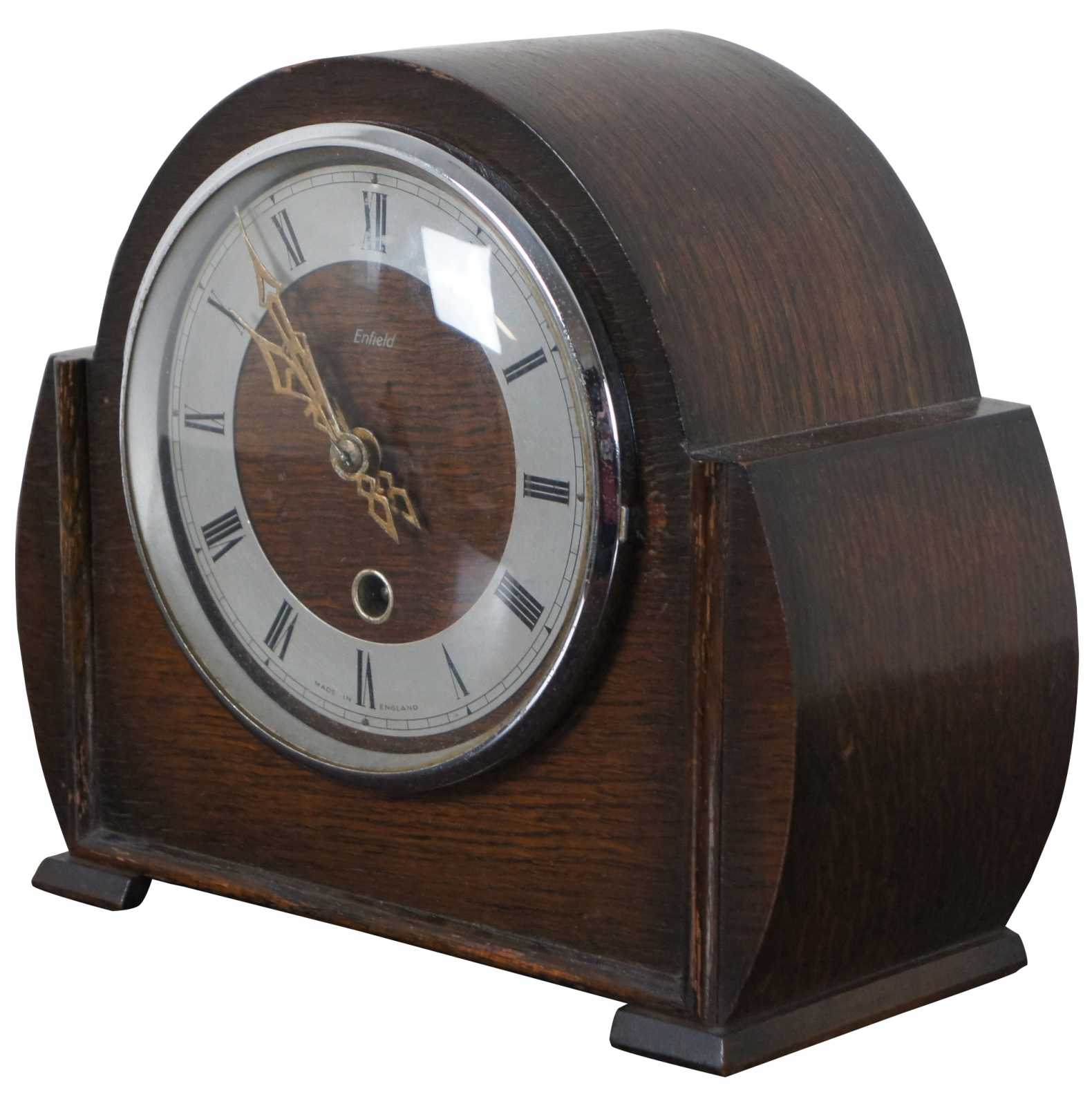 Antique oak mantel clock by Enfield England with art deco styling and pierced brass hands.