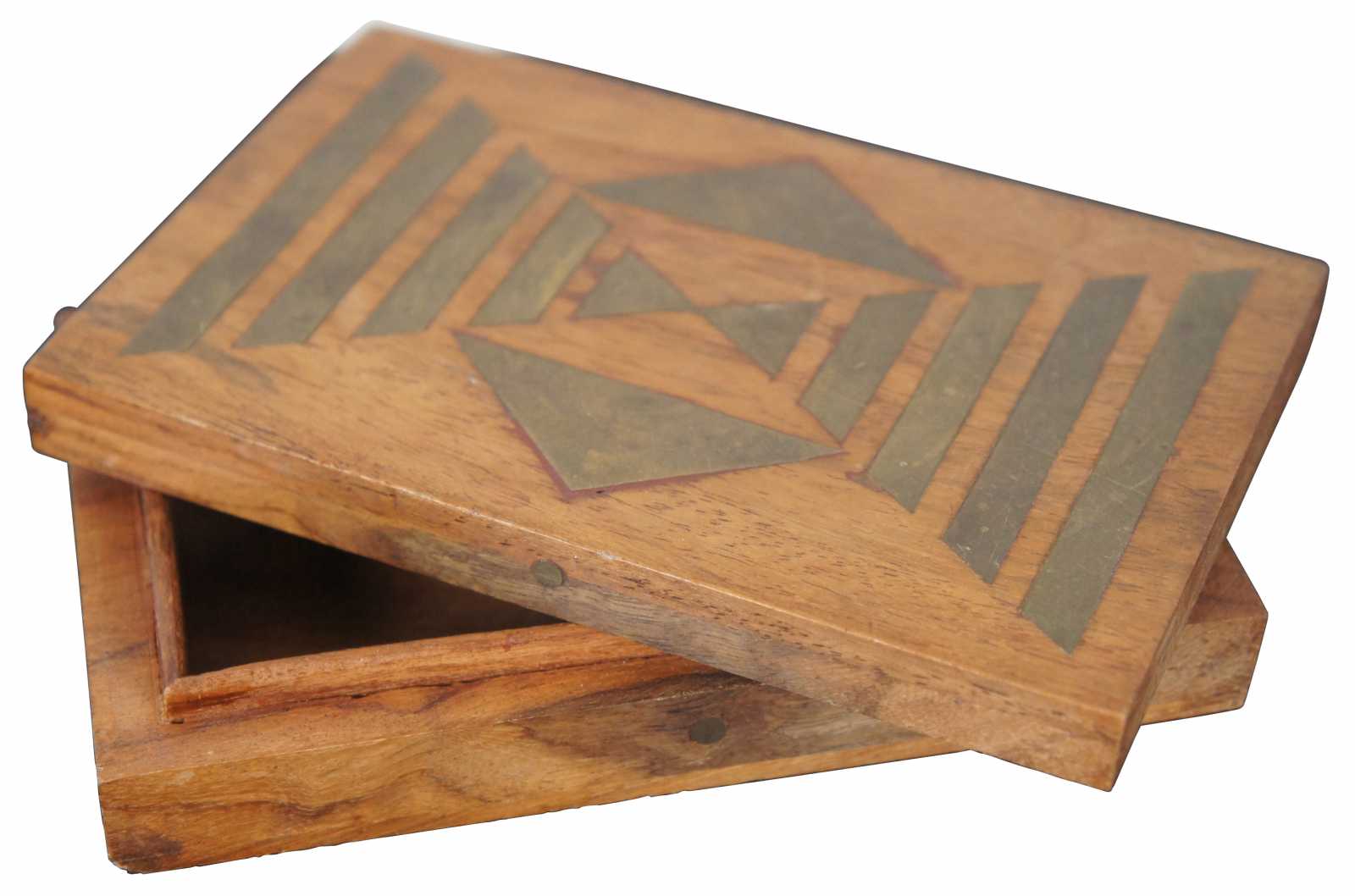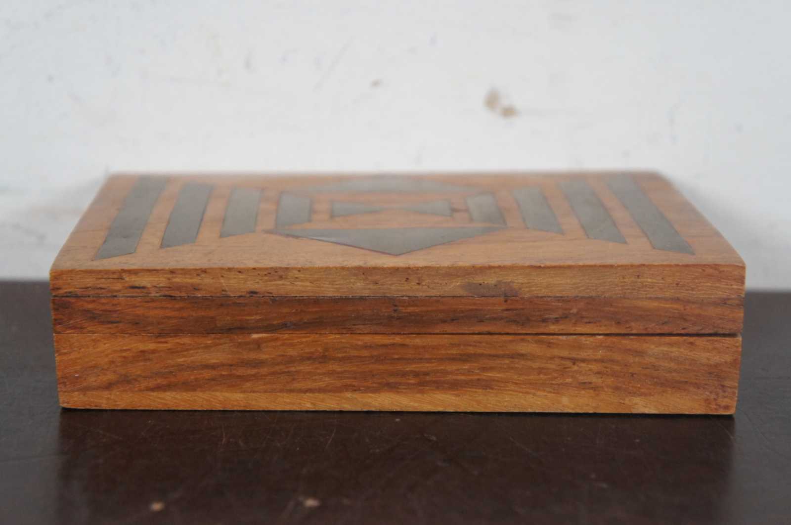 Vintage made in India wooden box with inlaid brass geometric triangle design.