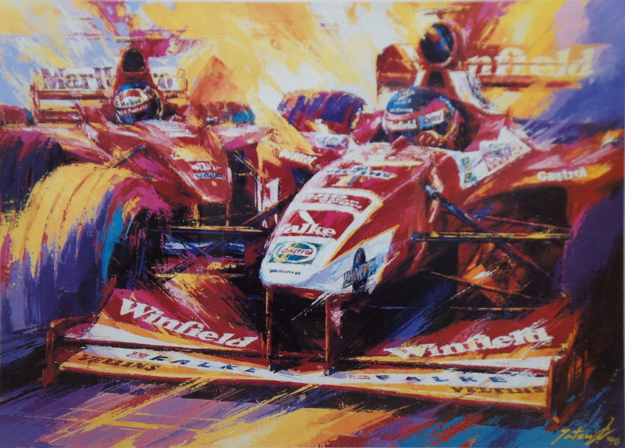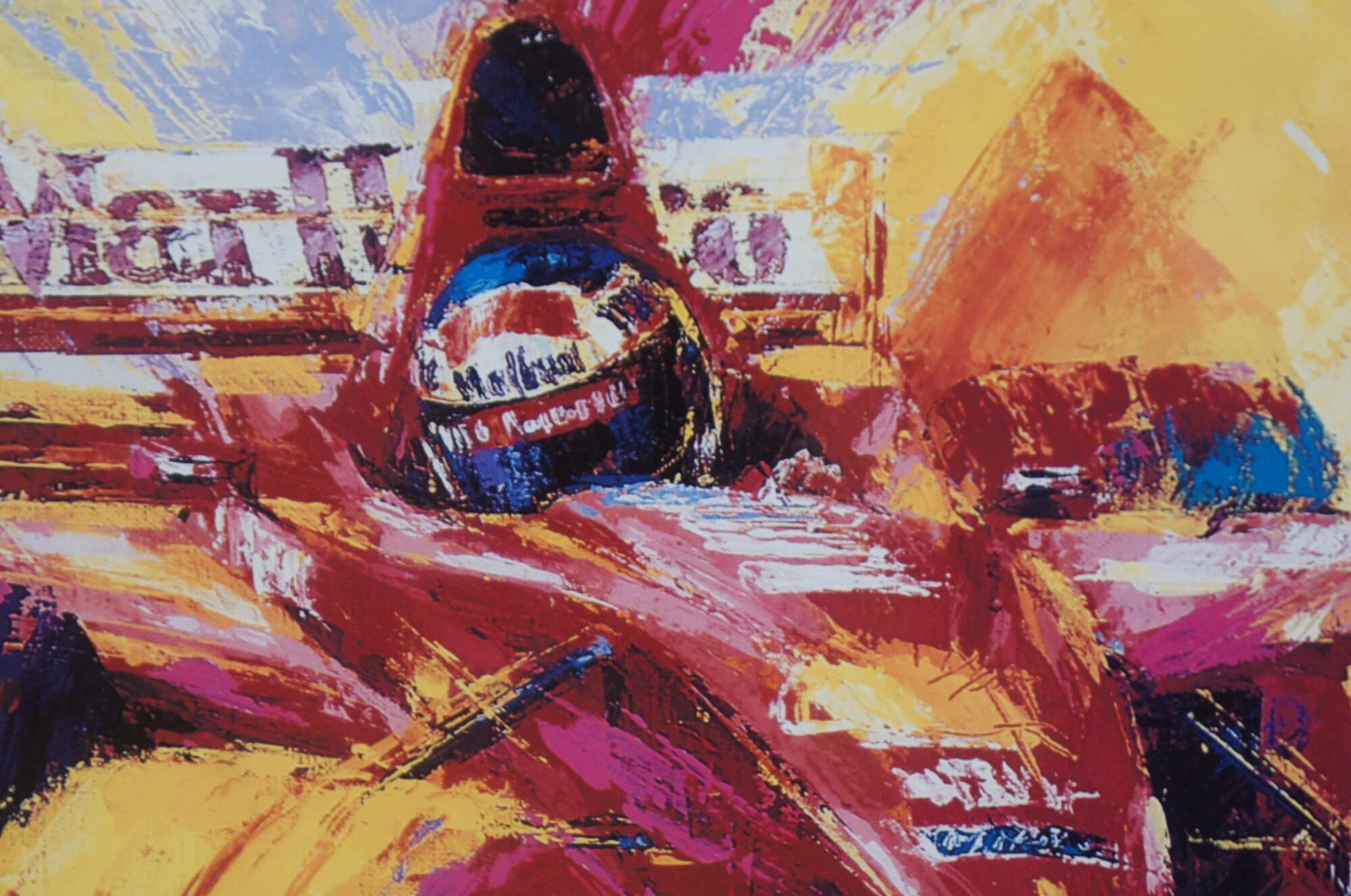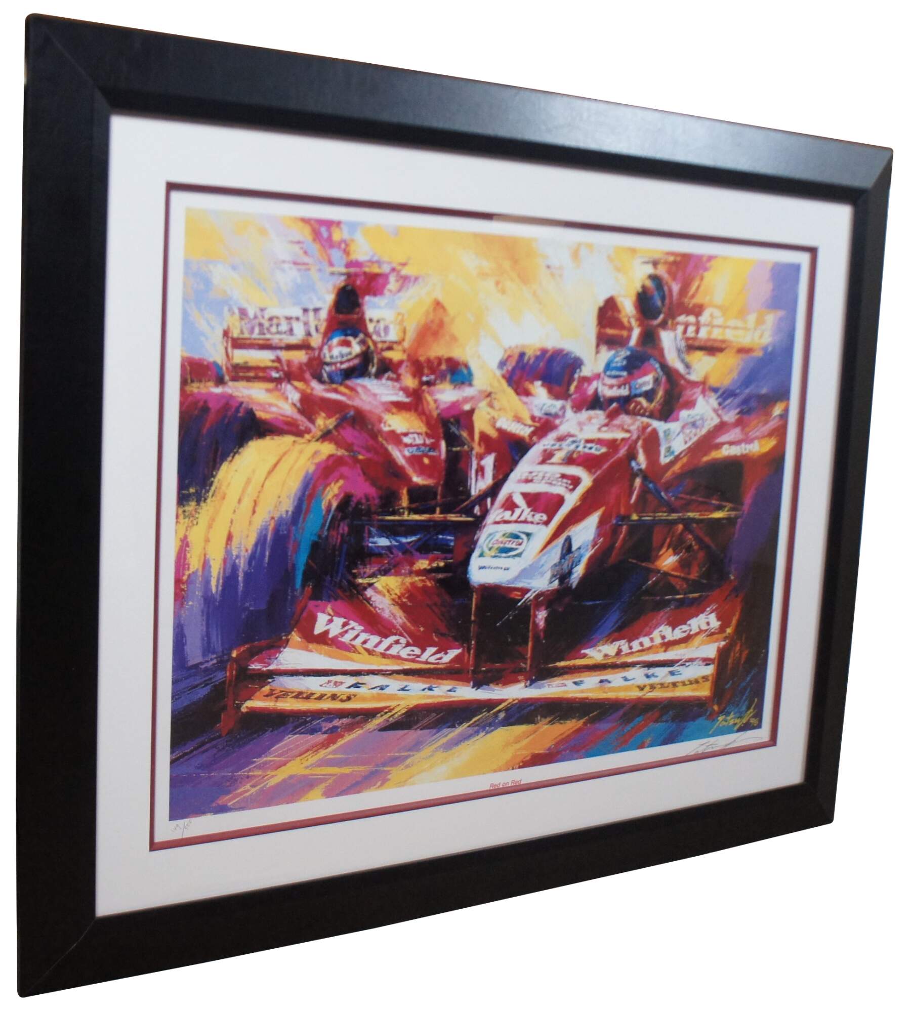 Vintage expressionist Formula One racing lithograph print titled “Red on Red,” by Tatsu Nakatsu, pencil signed and numbered 149/500.