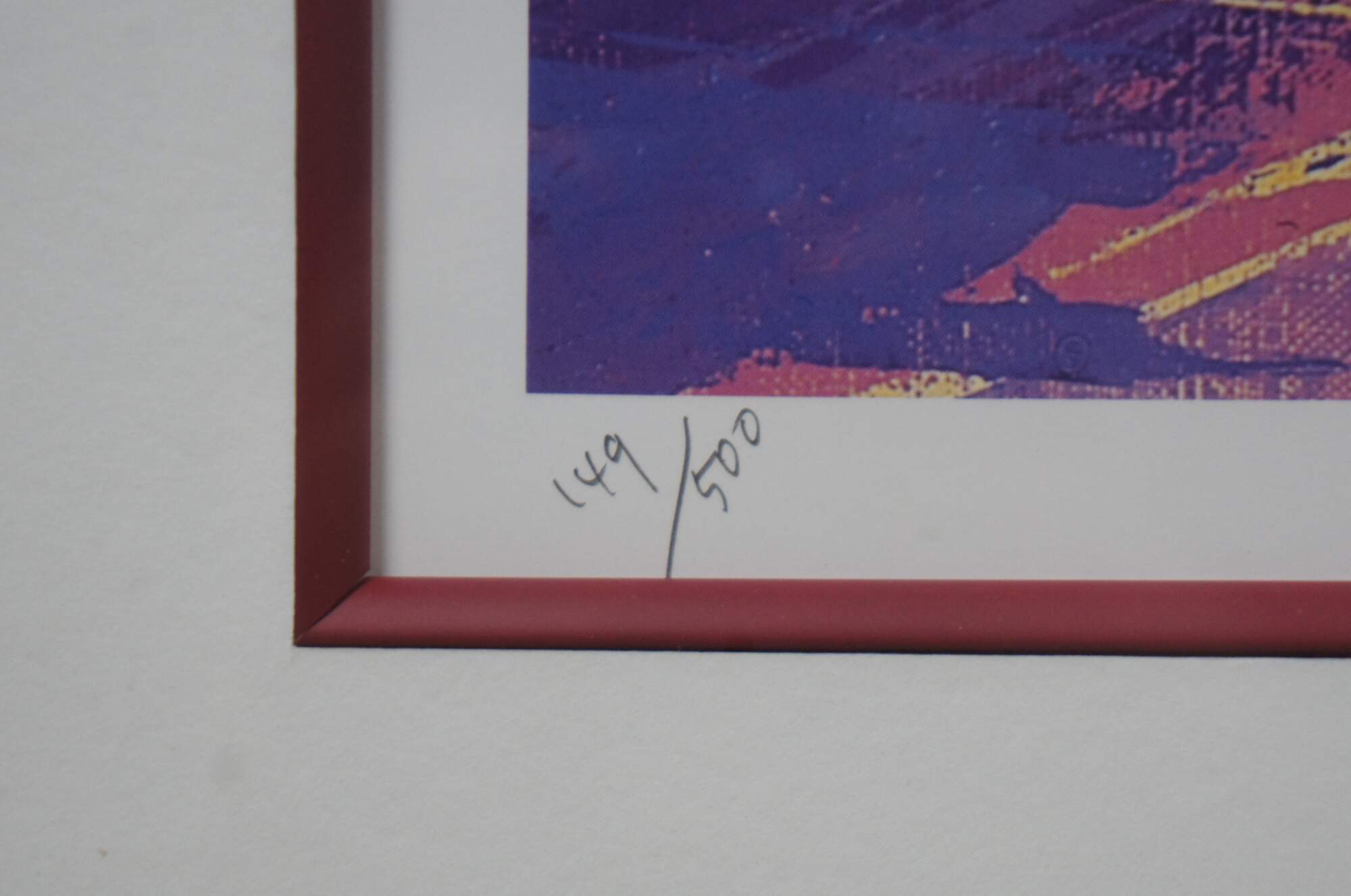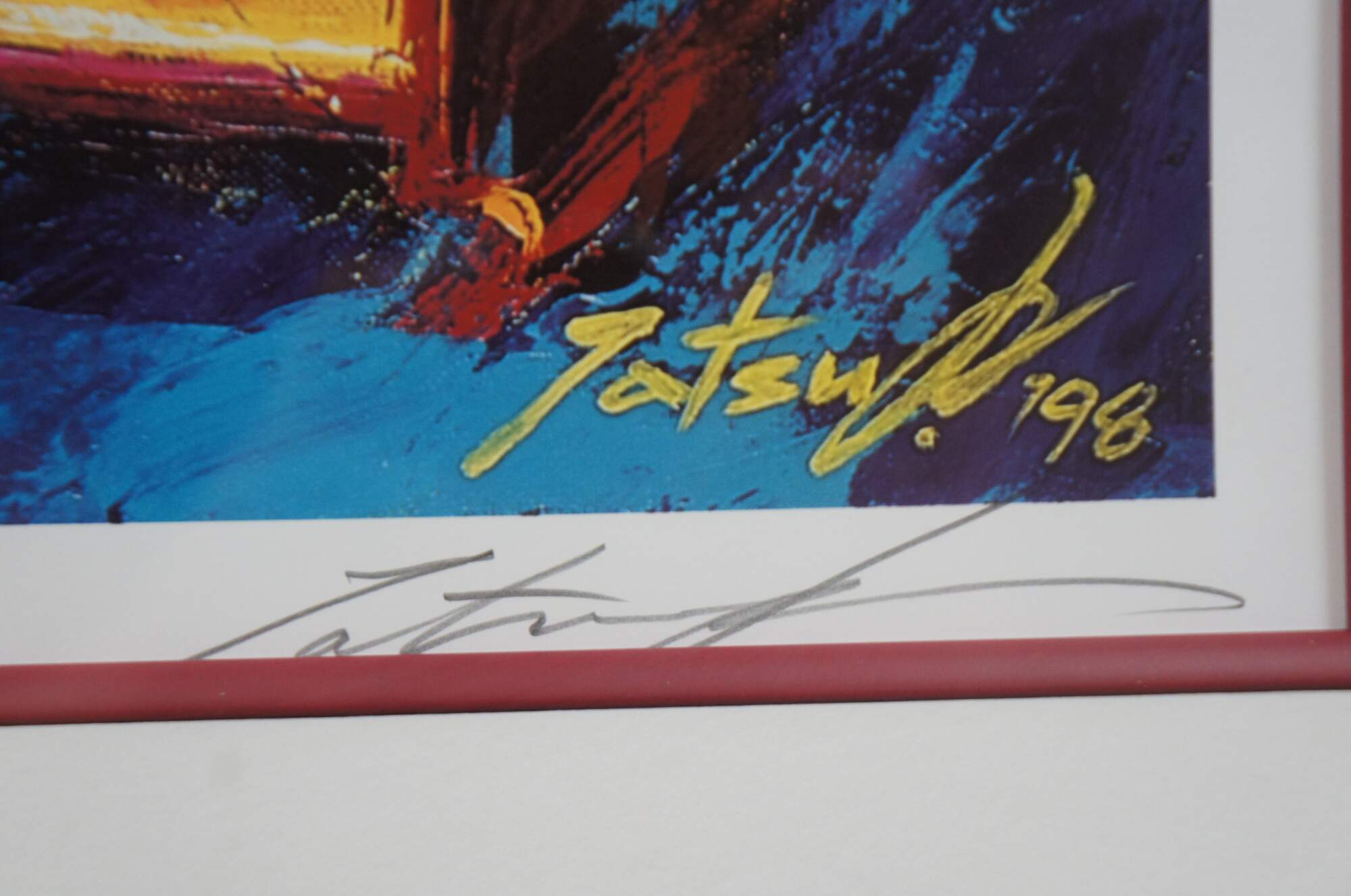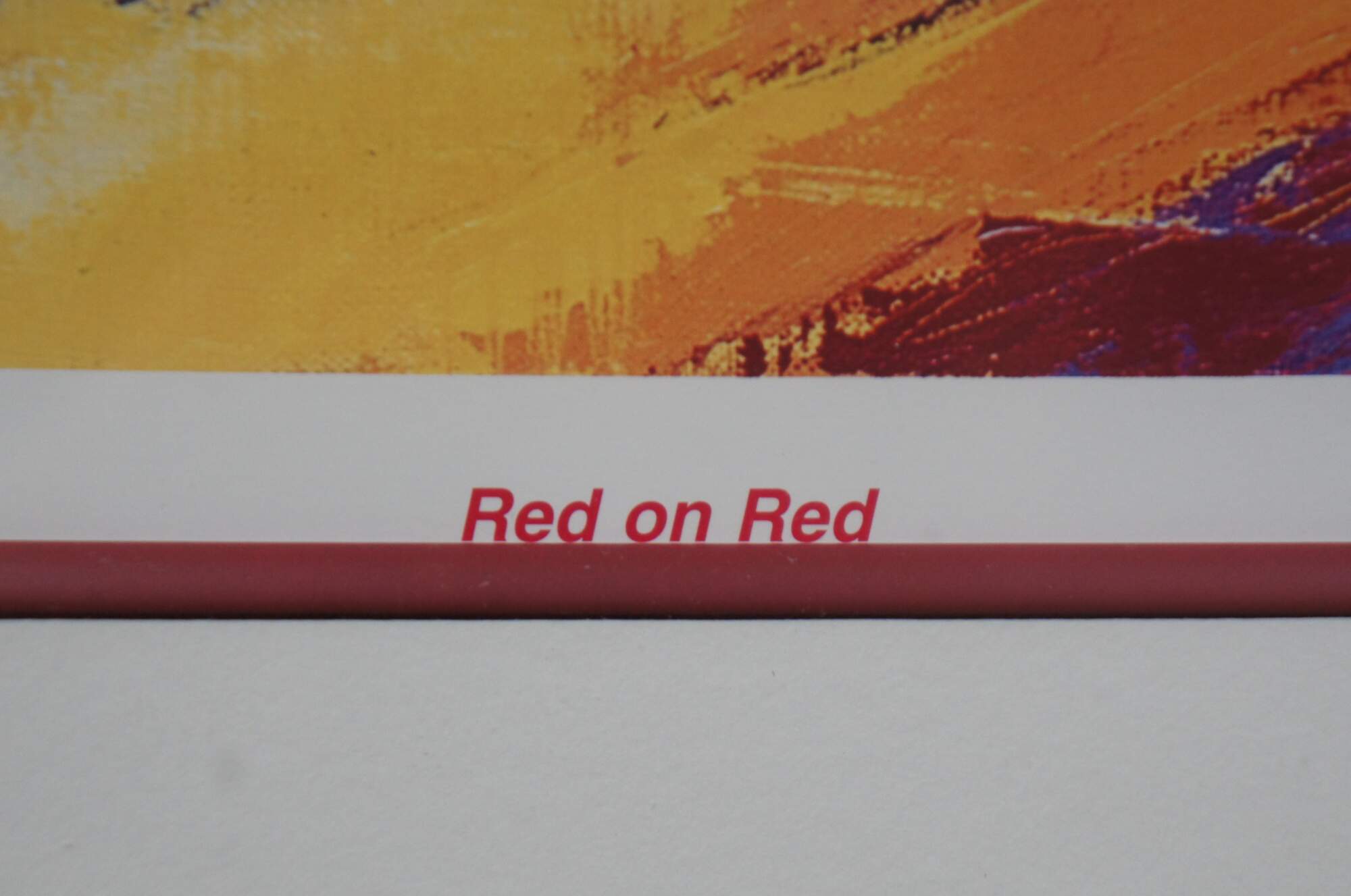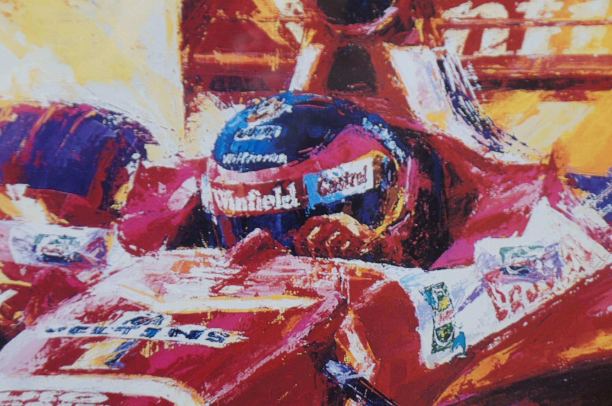 Vintage expressionist Formula One racing lithograph print titled “Red on Red,” by Tatsu Nakatsu, pencil signed and numbered 149/500.
