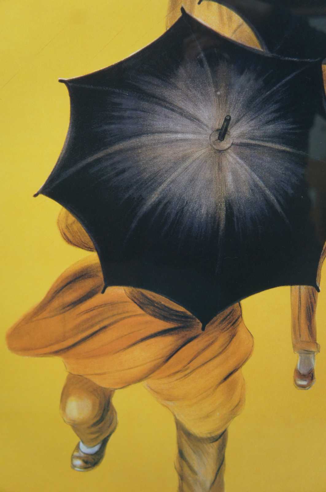 Reproduction print of a poster for Parapluie-Revel, first created by Leonetto Cappiello in 1922; this poster produced in 1998 by the McGaw Group. “Parapluie Revel (French, Umbrella Revel) is the former leading brand of the company Revel. In 1922, Revel engaged the famous Italian poster art designer Leonetto Cappiello to create this famous ad representing three people with umbrellas. It was published by the fine parisian printer's firm, Devambez, in the name of "Les Nouvelles Affiches Leonetto Cappiello". Leonetto Cappiello (9 April 1875 – 2 February 1942) was an Italian and French poster art designer and painter, who mainly lived and worked in Paris.[1] He is now often called 'the father of modern advertising' because of his innovation in poster design. The early advertising poster was characterized by a painterly quality as evidenced by early poster artists Jules Chéret, Alfred Choubrac and Hugo D'Alesi. Cappiello, like other young artists, worked in a way that was almost the opposite of his predecessors. He was the first poster artist to use bold figures popping out of black backgrounds, a startling contrast to the posters early norm.”