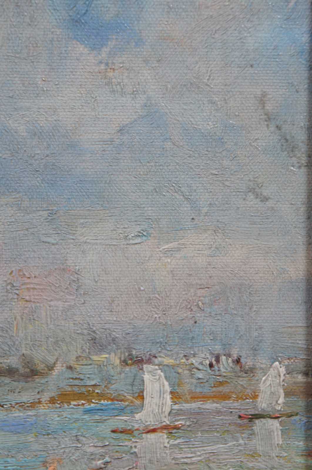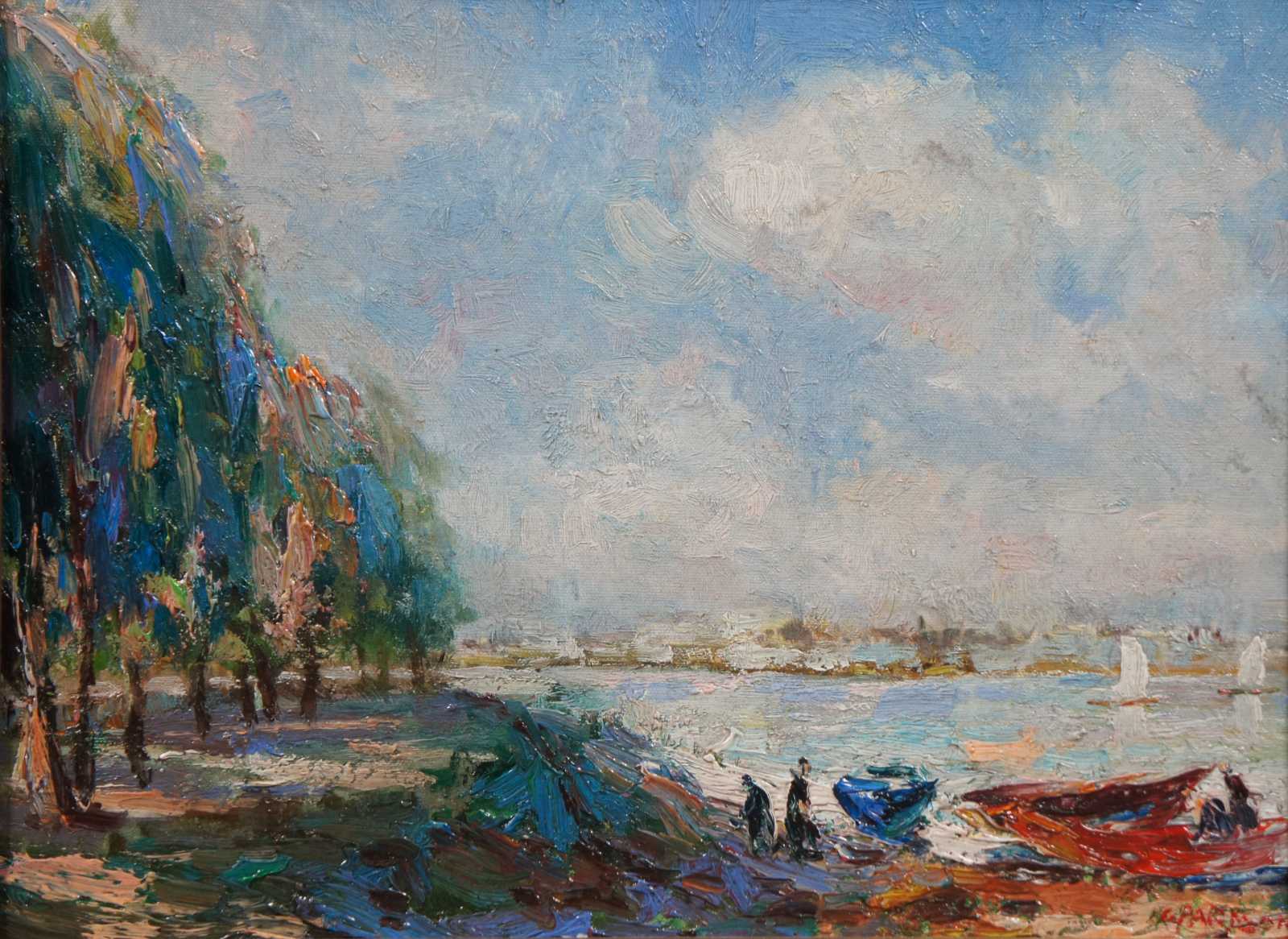 Vintage impressionist oil on canvas landscape painting showing a tree lined riverbank with figures and boats, signed in lower corner C. Parkson.