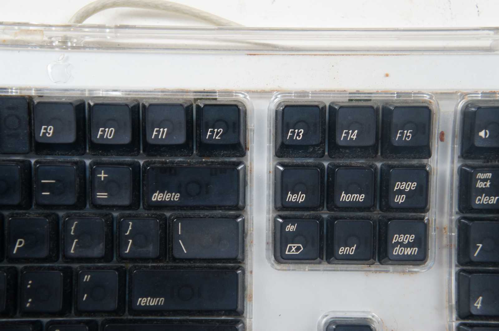 2 Available – Early 2000’s Mac Pro Keyboard model M7803, clear with black keys and two USB ports.