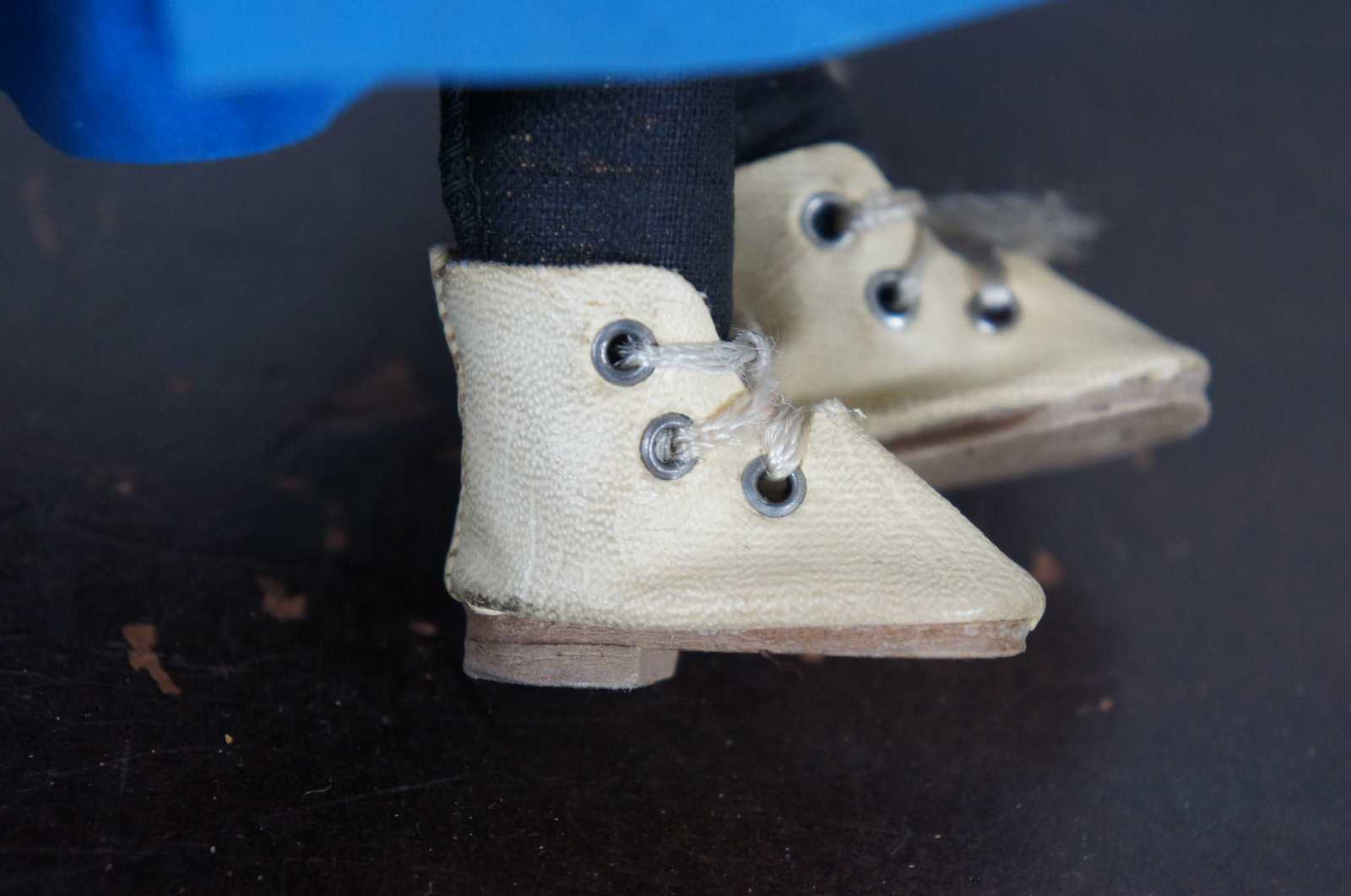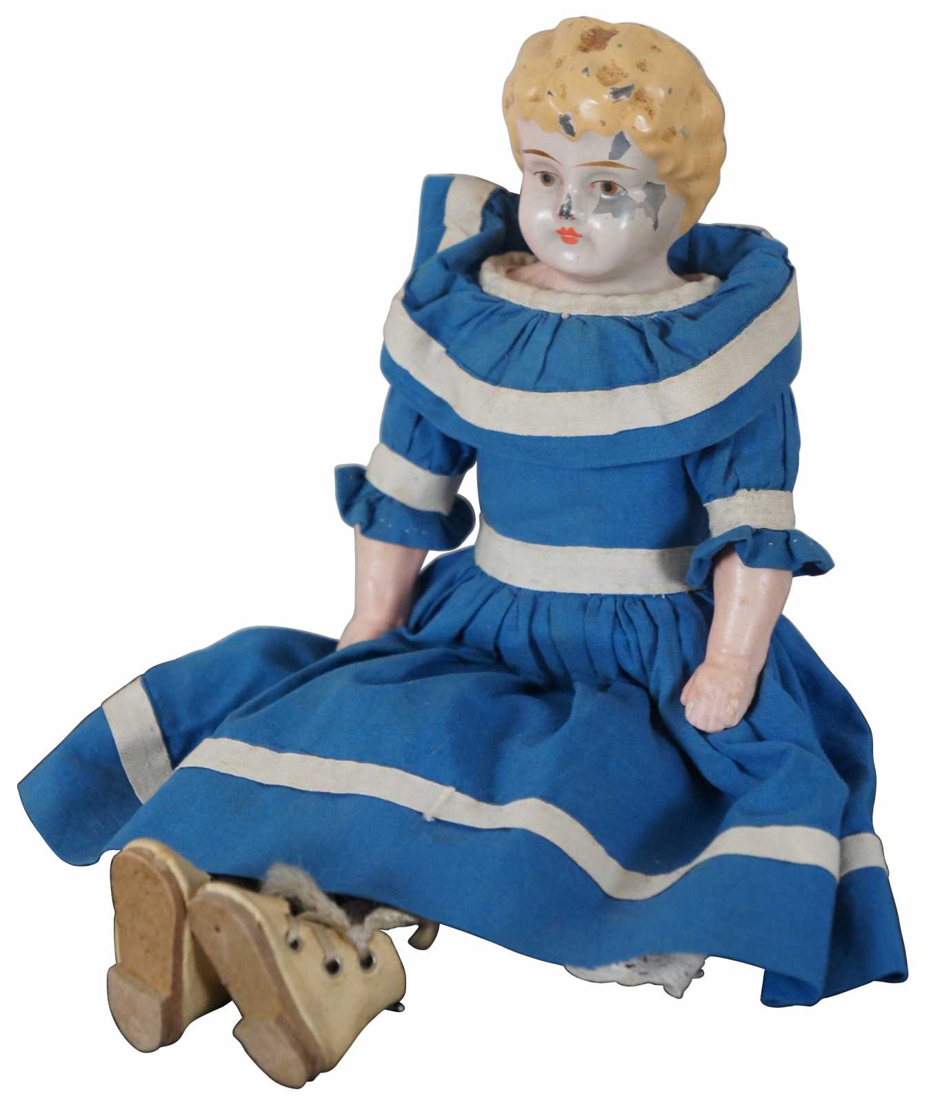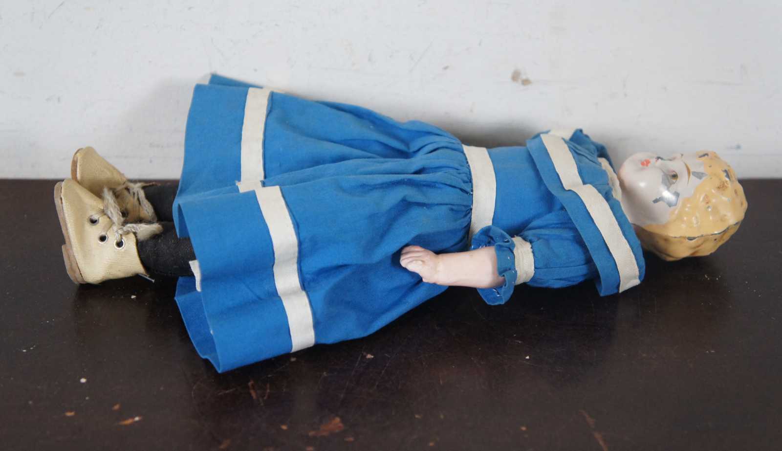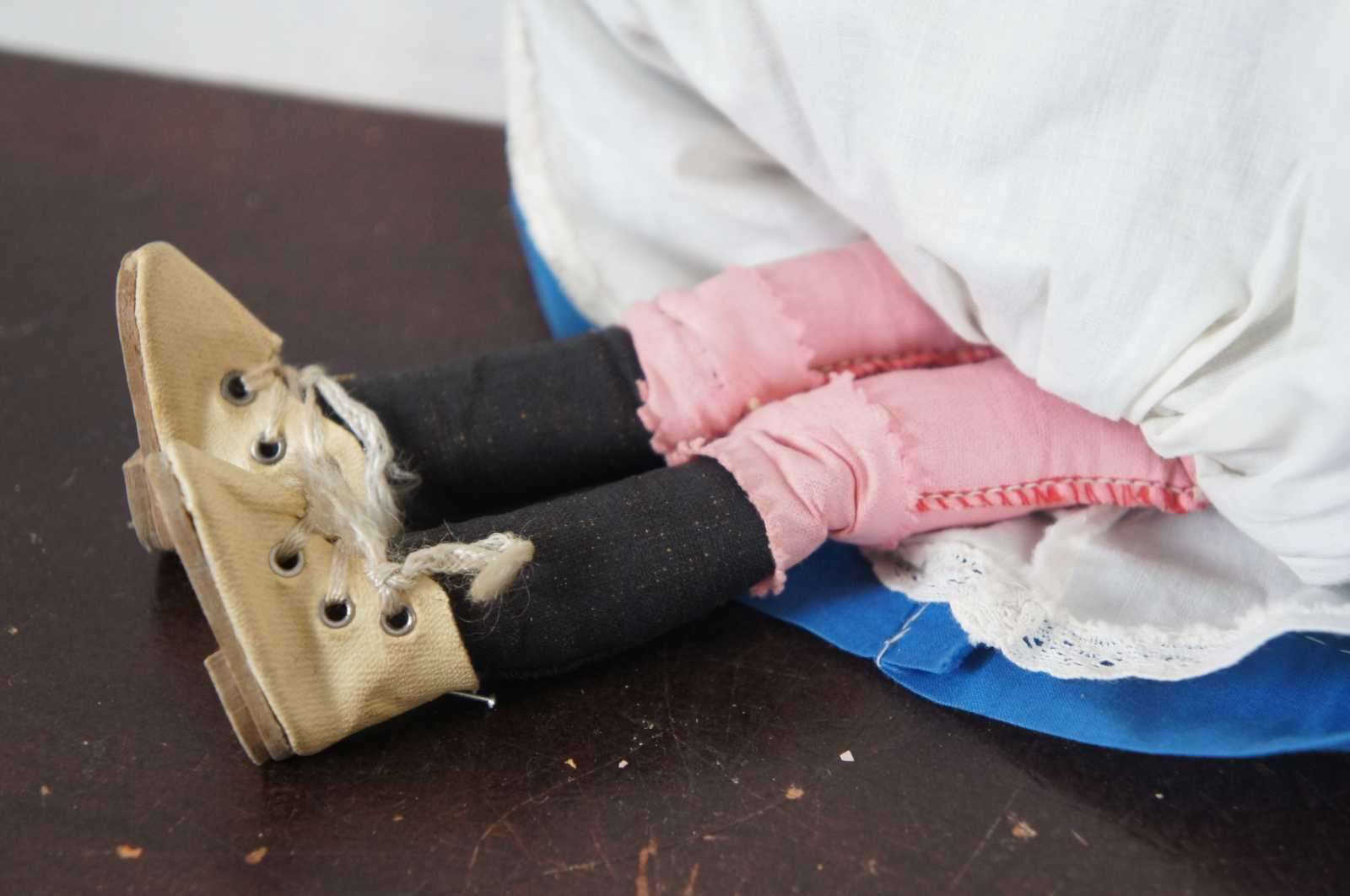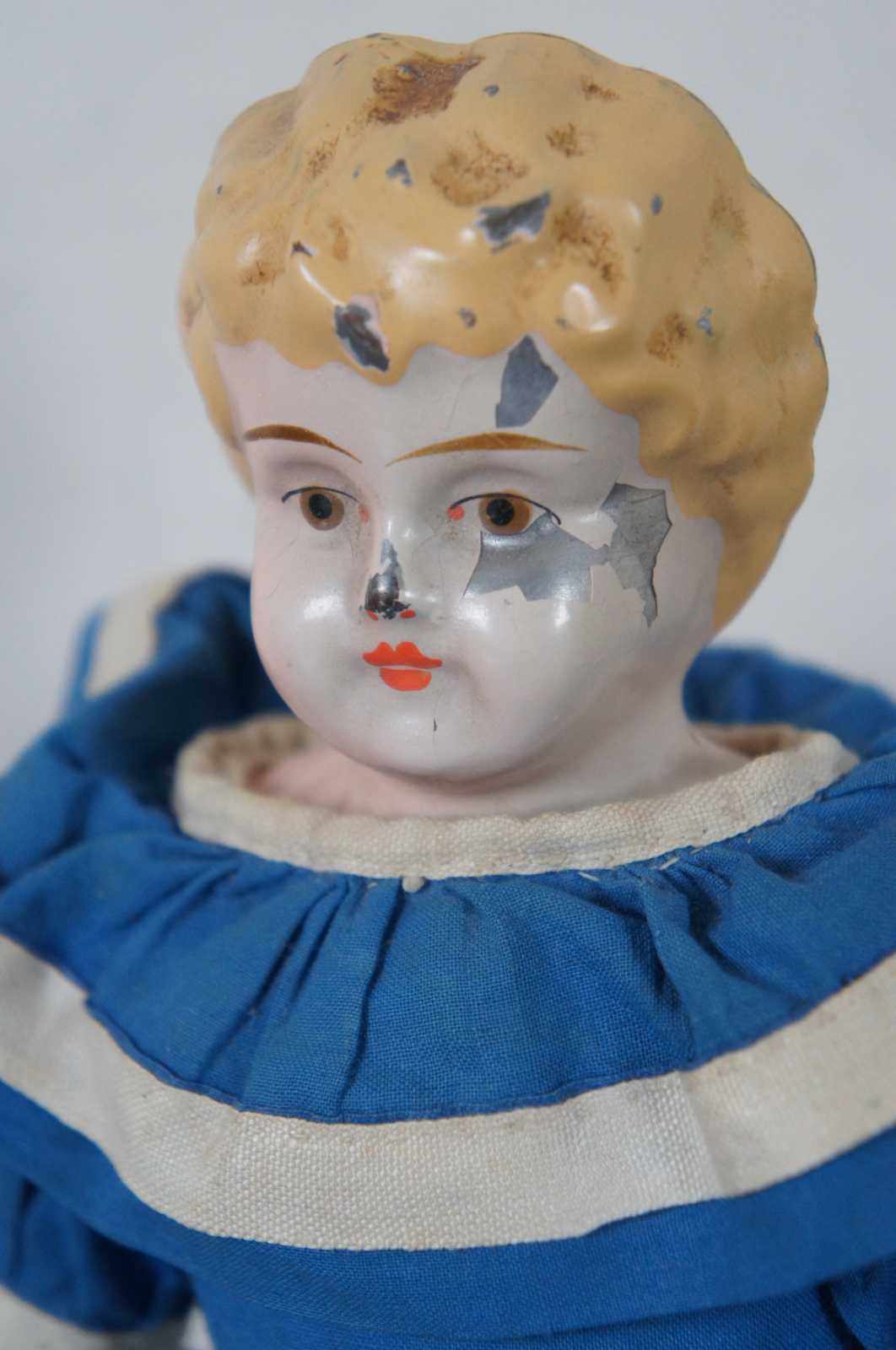 Antique 19th Century German doll with painted tin head, bisque hands and cloth body, dressed in a blue and white dress with leather shoes.