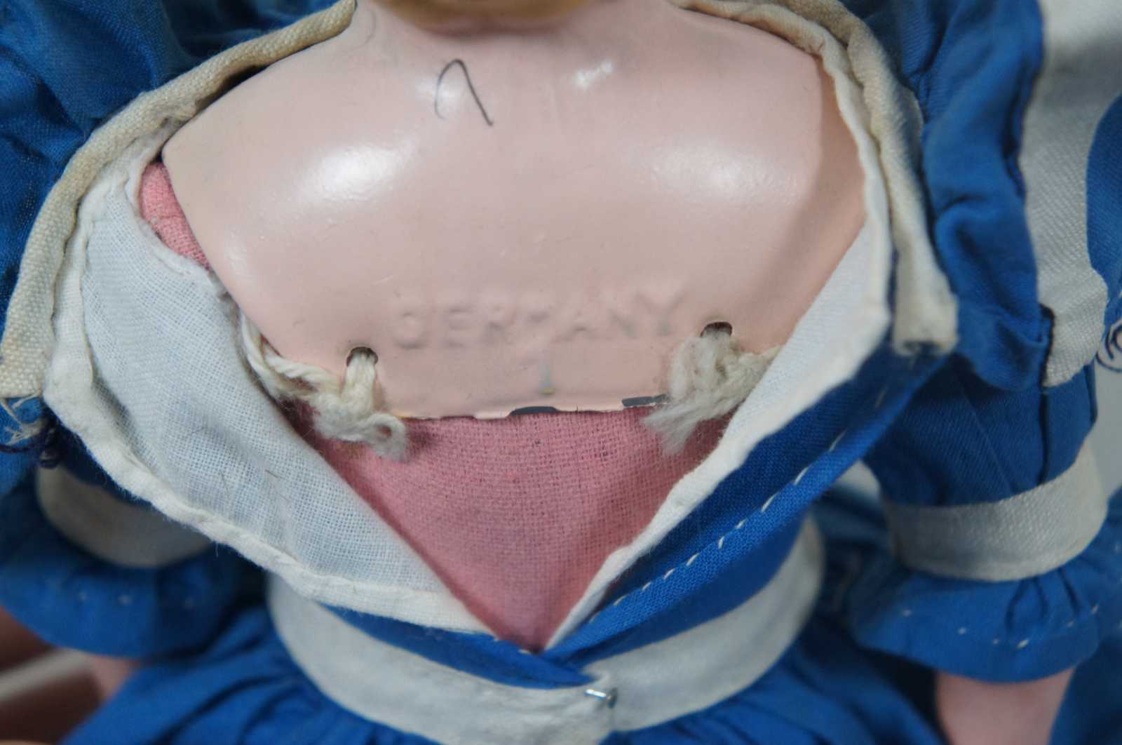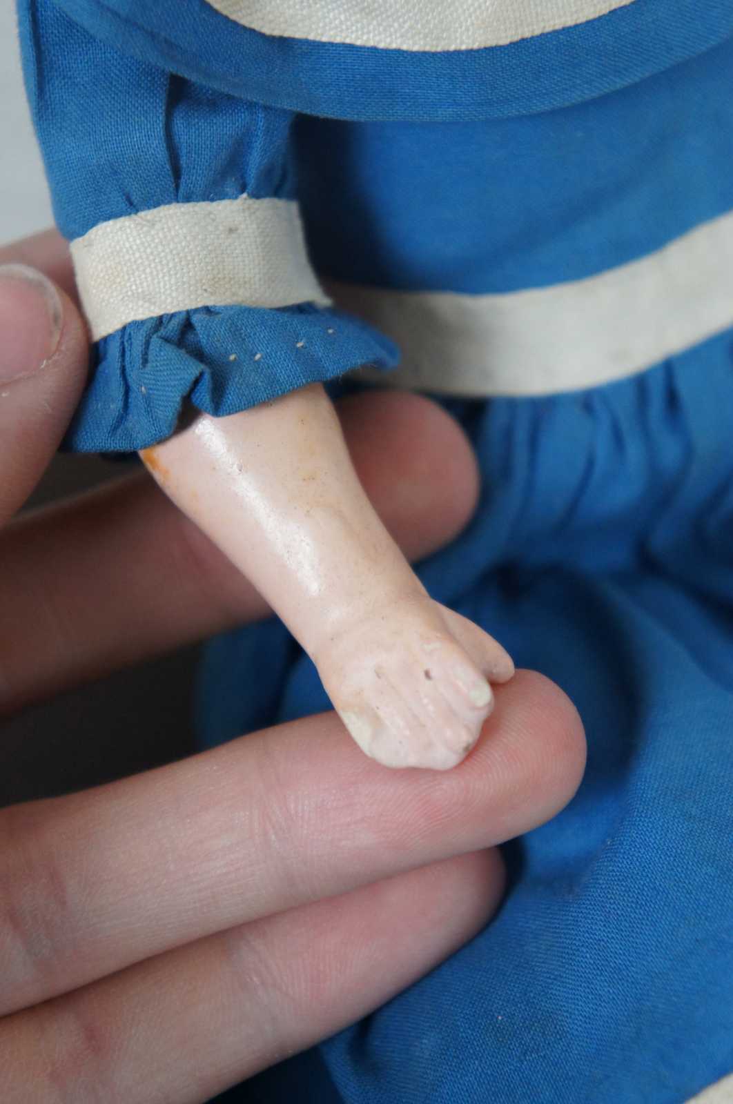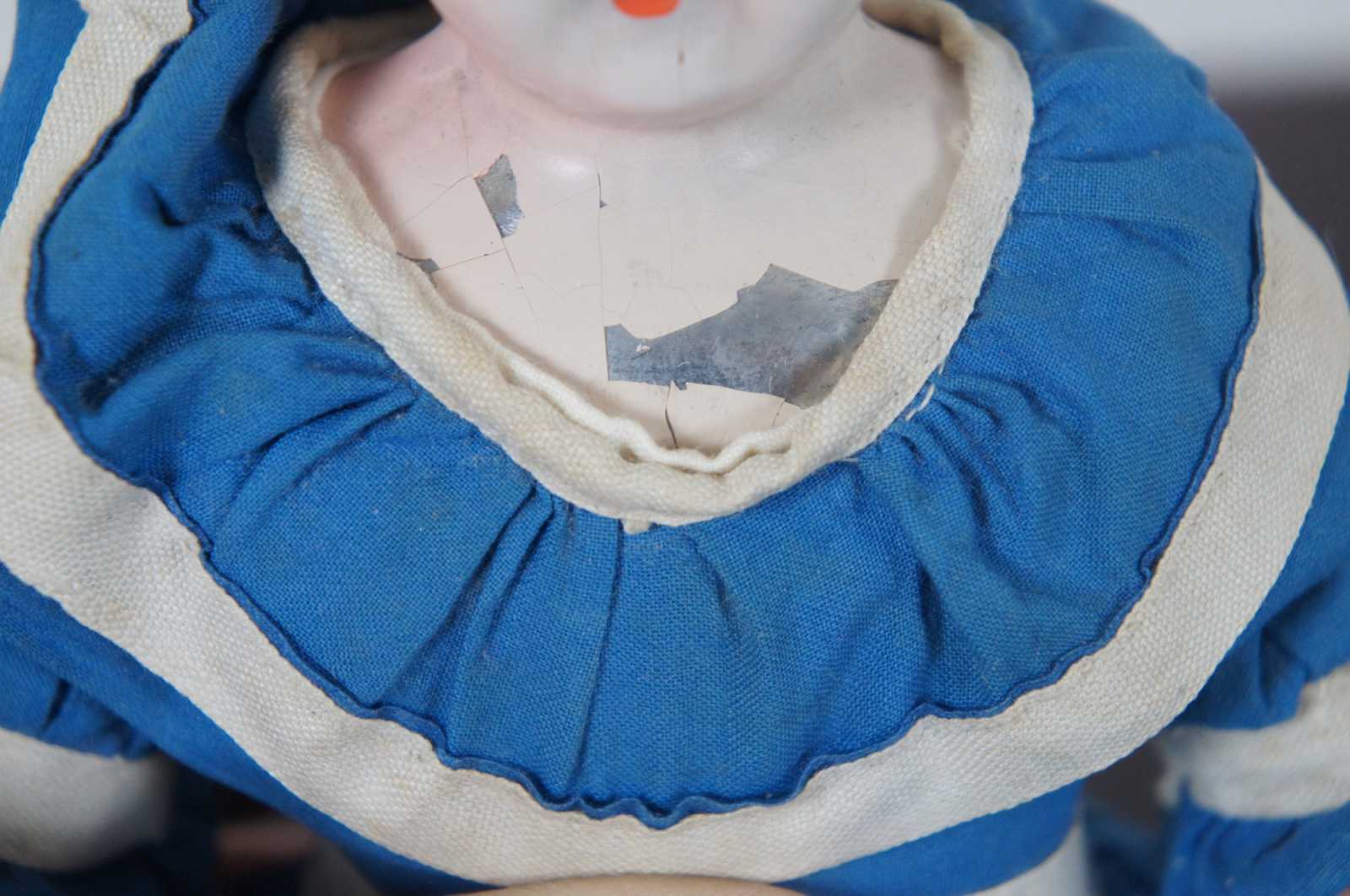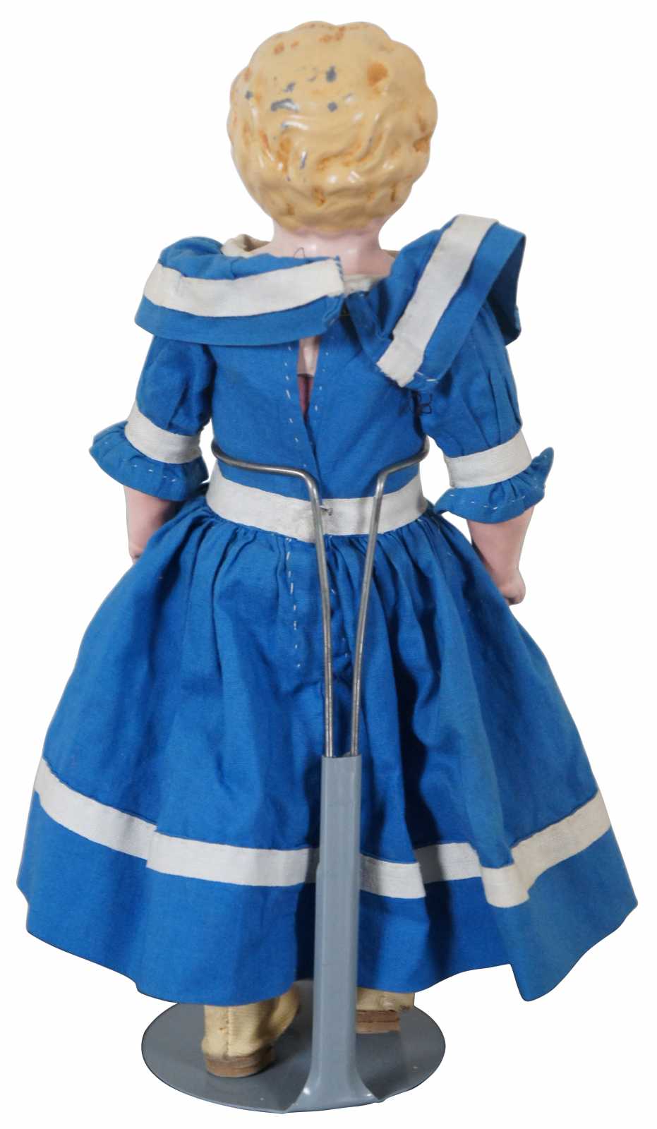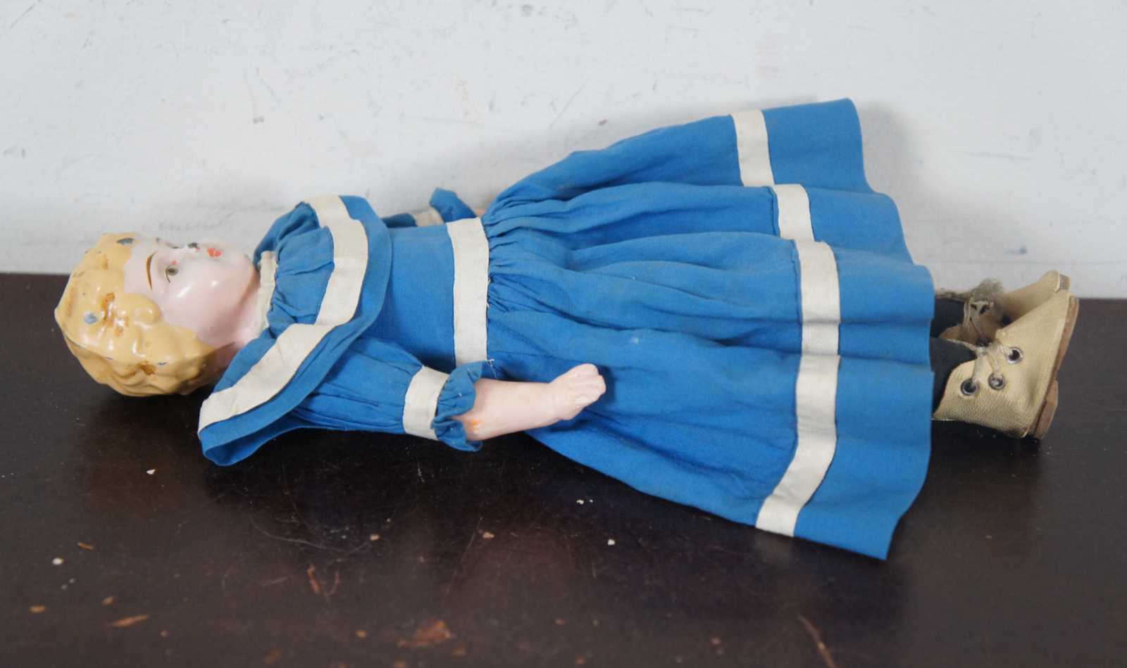 Antique 19th Century German doll with painted tin head, bisque hands and cloth body, dressed in a blue and white dress with leather shoes.