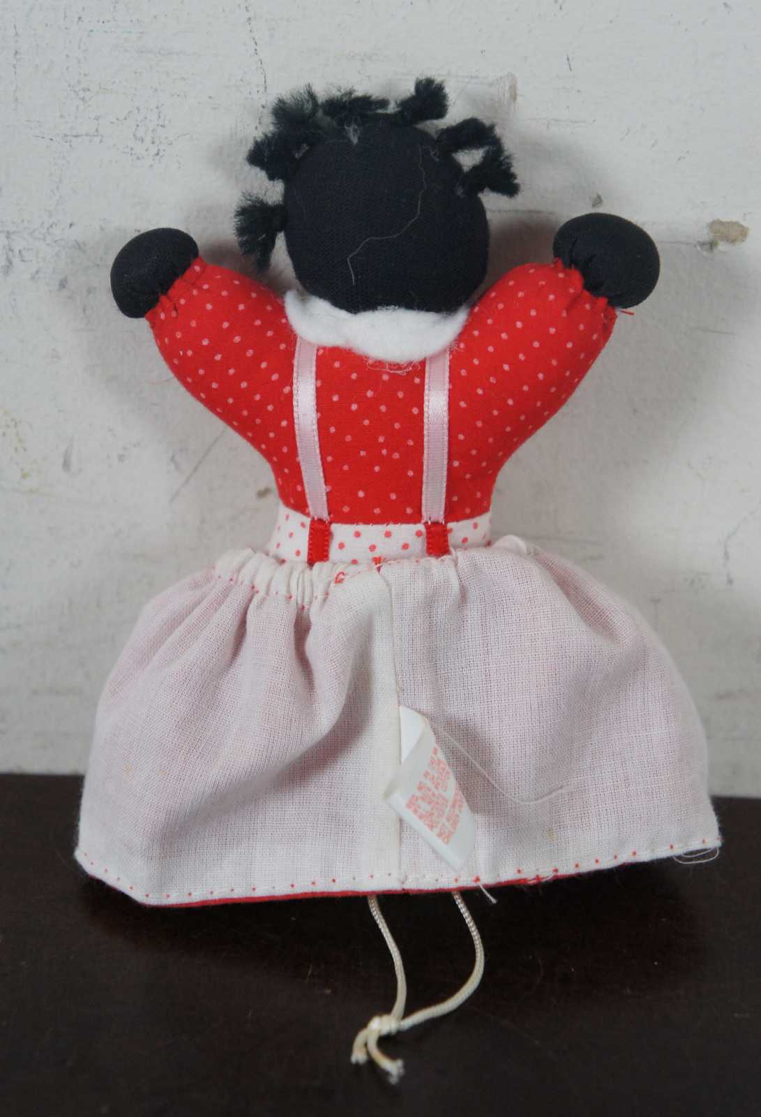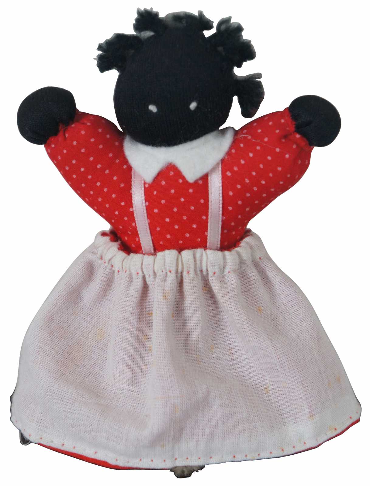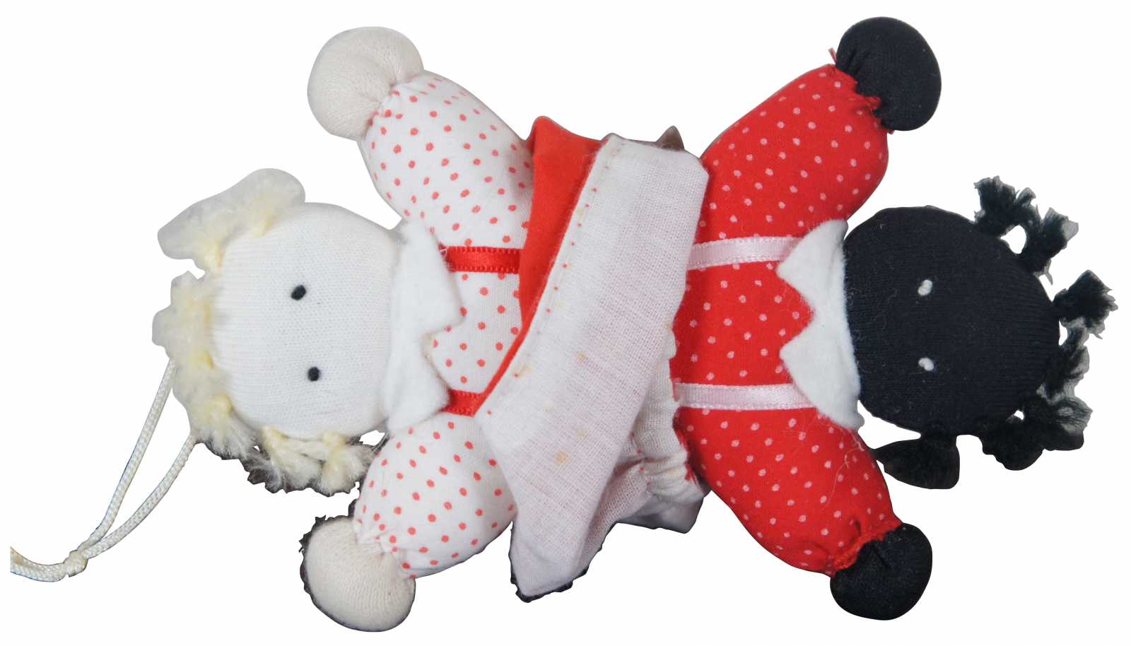 Modern construction, made in Taiwan black and white topsy turvy doll. Topsy-turvy dolls (two half dolls joined at the waist) date to the mid 1800’s. The topsy turvy doll originally featured the figure of a black girl and white girl on the opposite side. In 1852, the first known version of the doll emerged as the Topsy and Eva doll, which was based on the characters Topsy and Eva in Harriet Beecher Stowe’s Uncle Tom’s Cabin. Many contemporary topsy-turvy dolls feature fairy tale characters instead, for example Red Riding and the Wolf in Grandma’s clothing or Cinderella transforming from maid to princess.