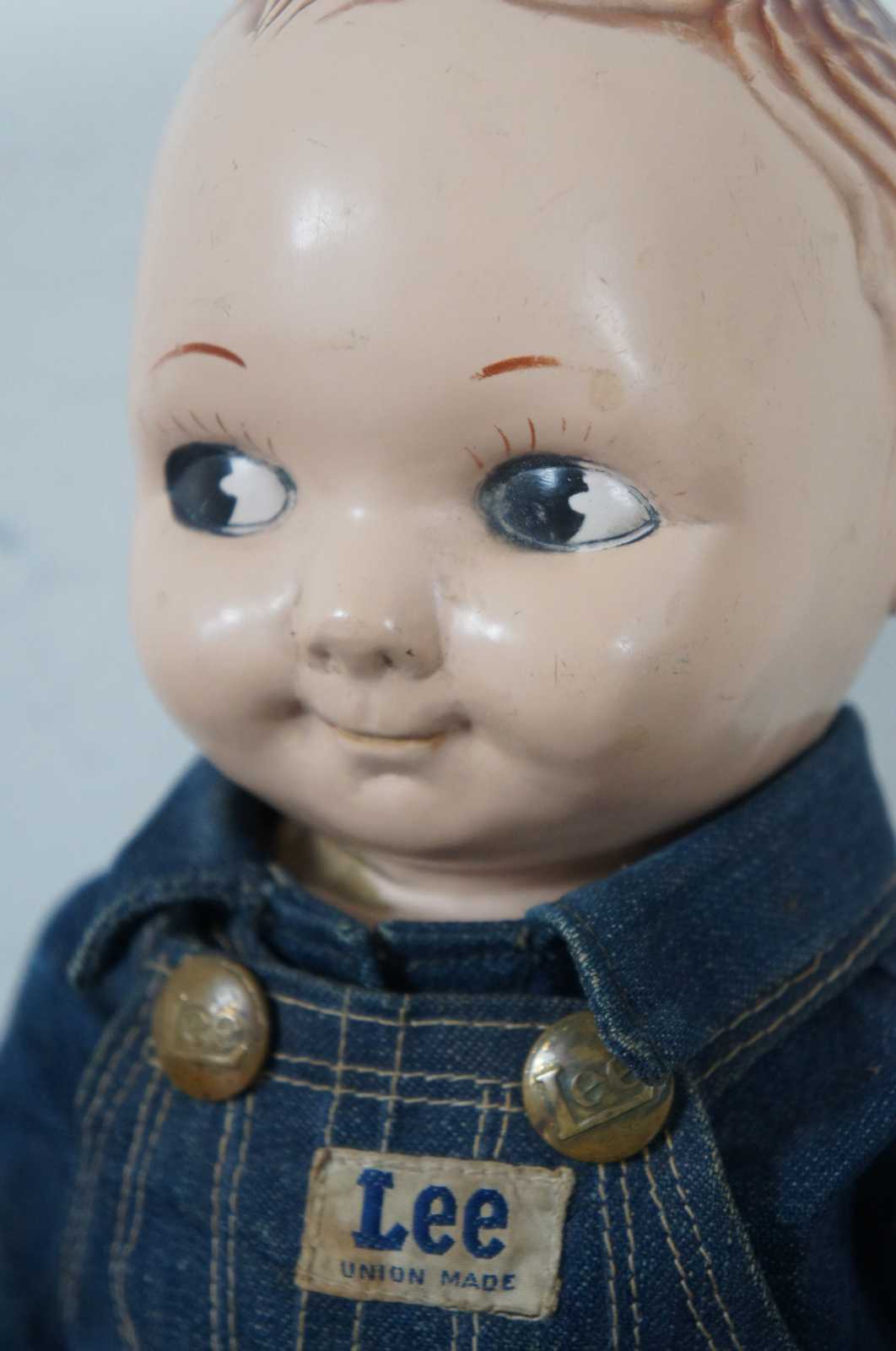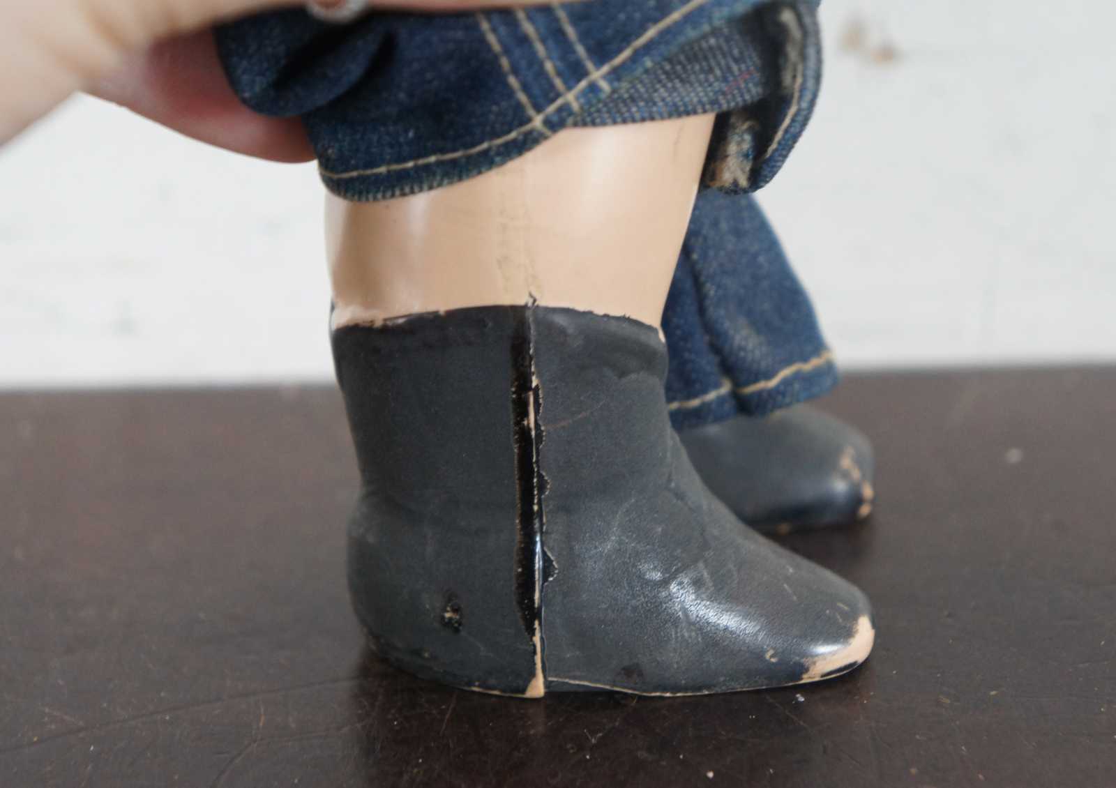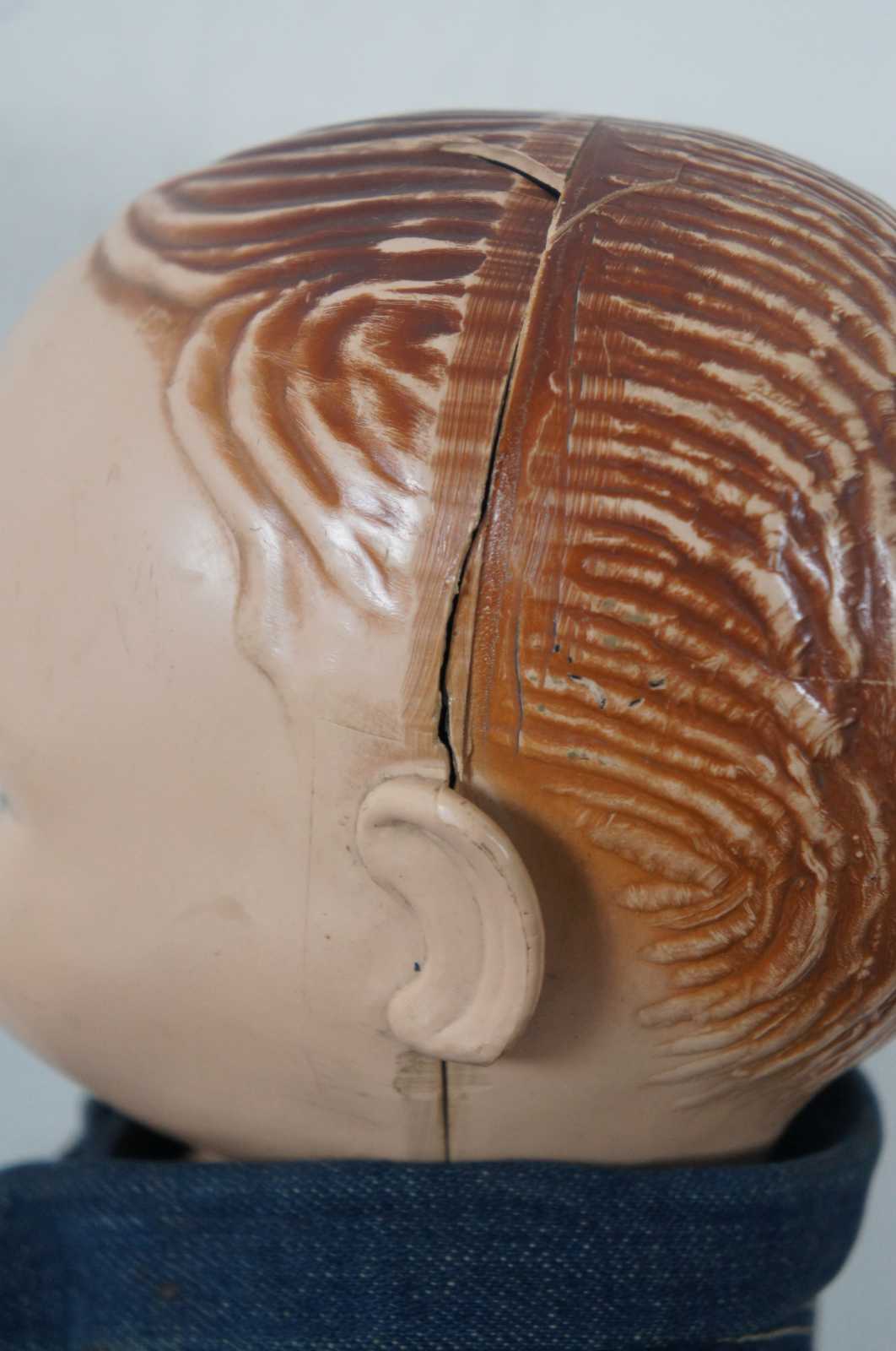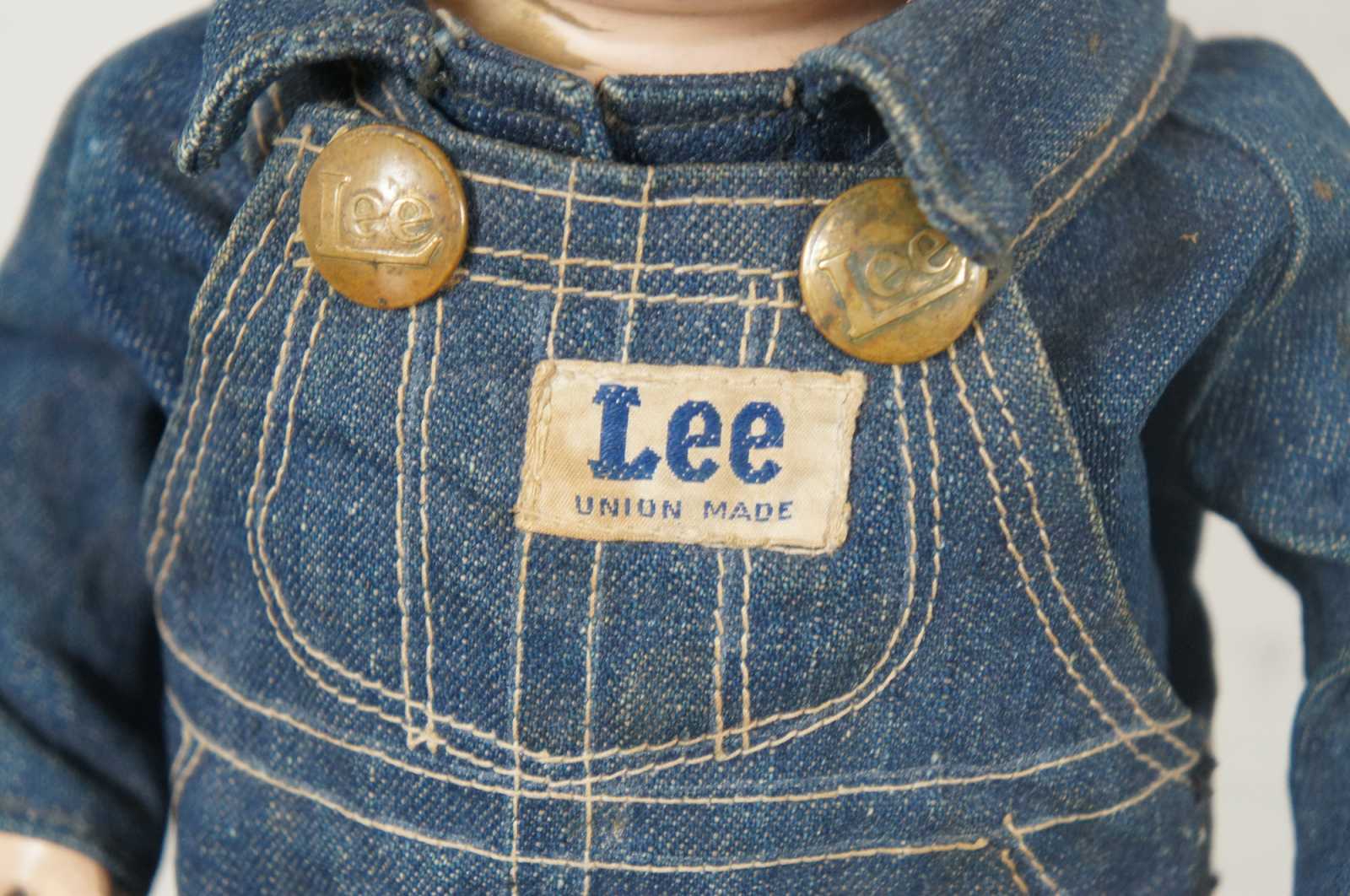 Antique early 20th century Buddy Lee advertising doll for Lee Denim, dressed in jean shirt and overalls with painted features and cowboy boots.