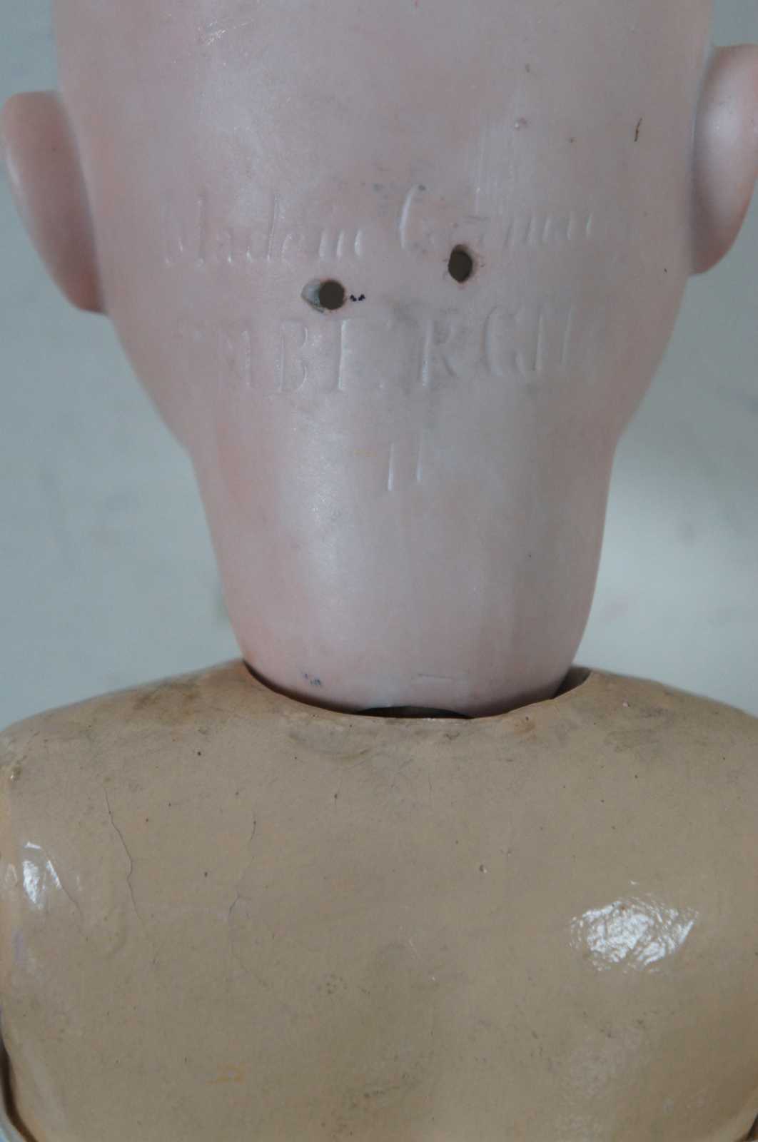 Antique German bisque head doll by CM Bergmann with articulated jointed limbs and composite body, non-original human hair, sleep eyes, marked “Made in Germany CM Bergmann II” on back of neck, dressed in a floral dress with pink sash and undergarments that include training stays. “Charles M. Bergmann operated a doll company in Waltershausen, Thüringia, Germany, by 1909 he added a factory in Friedrichroda, Germany, until they went bankrupt in 1931. Bergmann dolls came in sizes from 13" to 34" tall, with composition ball jointed bodies and a bisque socket head or bisque shoulder head and kid body, supplied from other manufacturers; Armand Marseilles, ABG - Alt, Beck & Gottschalck, William Gobel, Simon & Halbig and maybe others. Bergmann also made papier mache dolls, kid leather bodied dolls, character baby dolls. Dolls were distributed in the United States by Louis Wolf & Company, who registered these doll trademarks for them