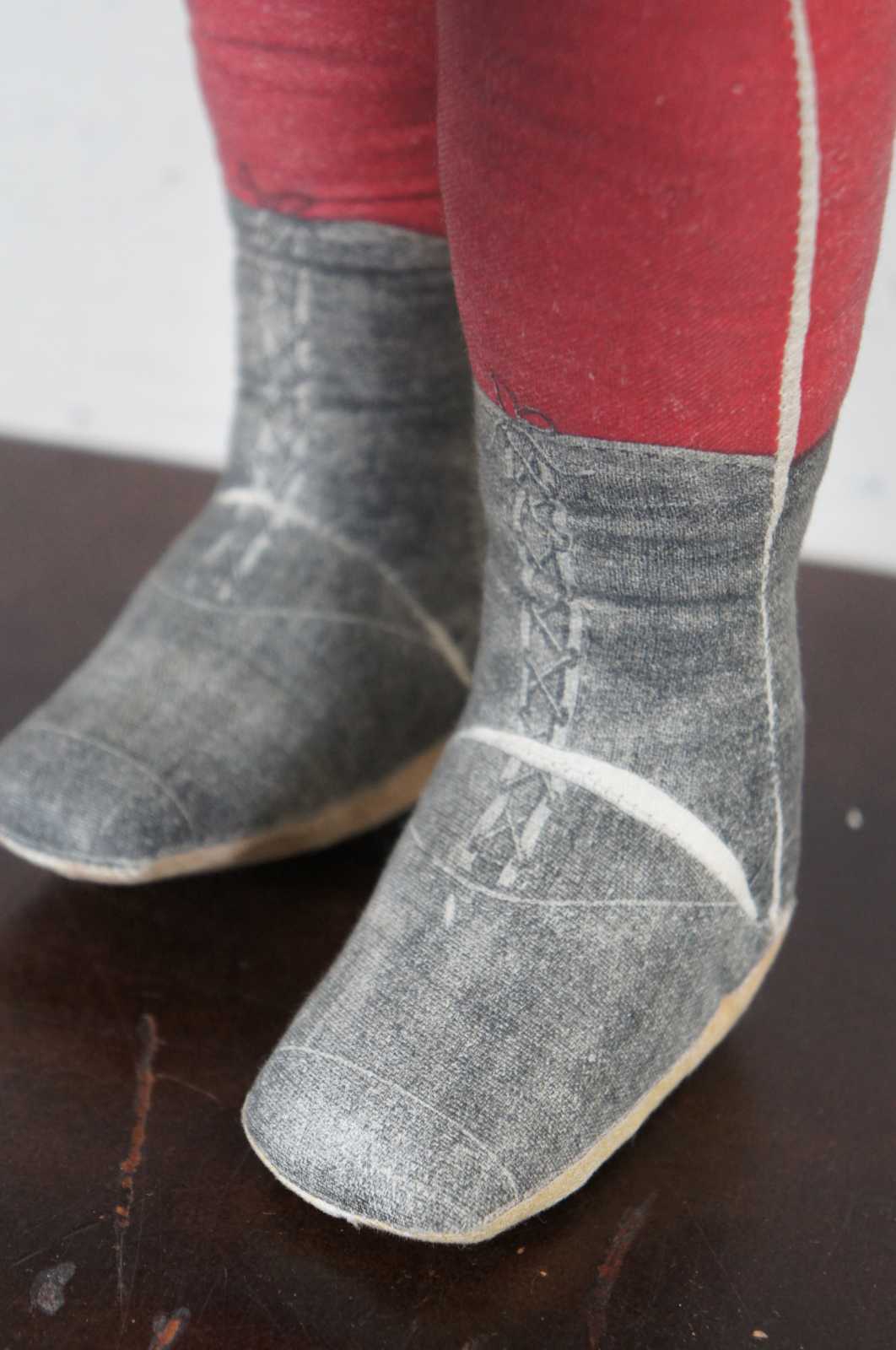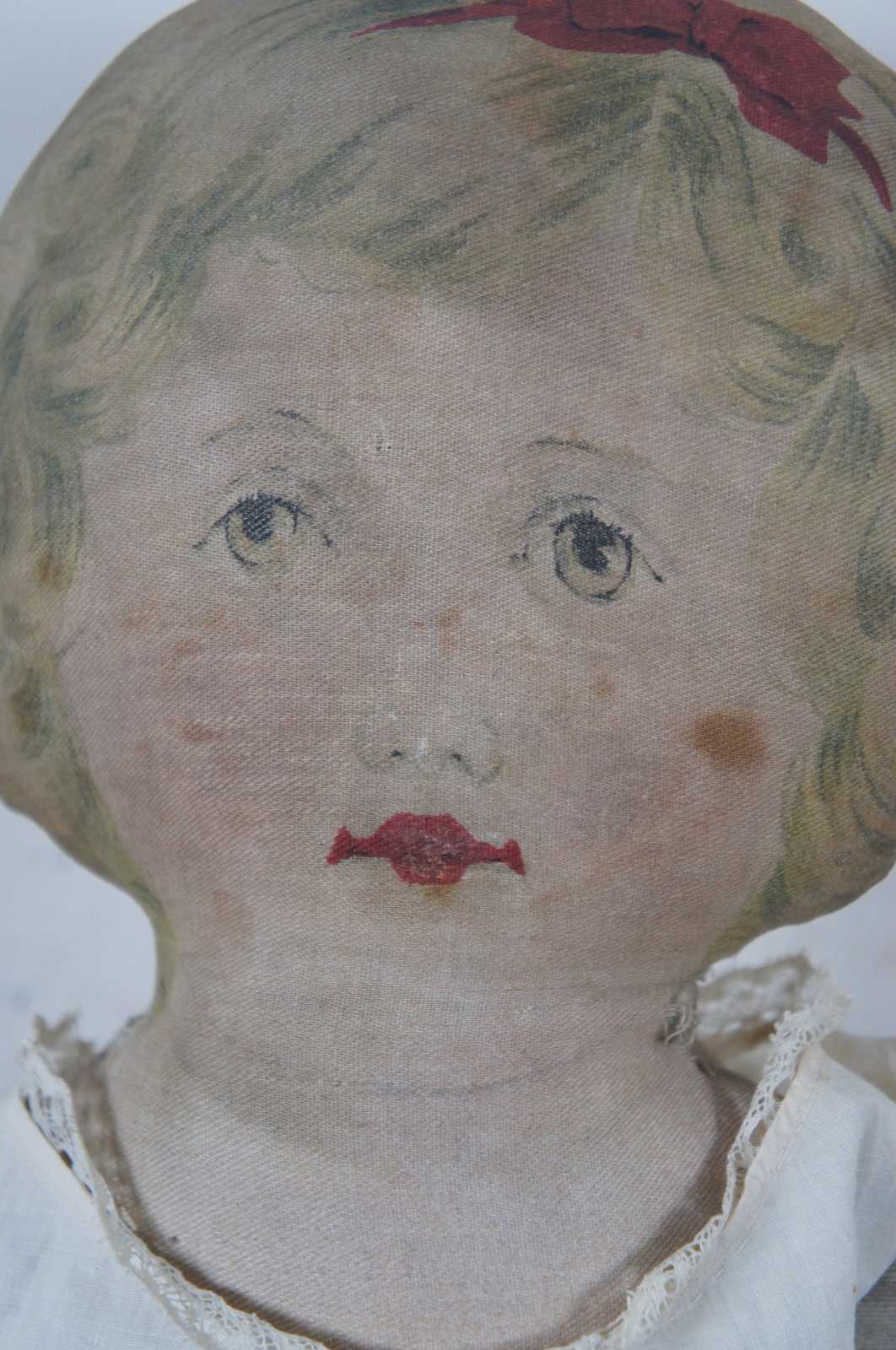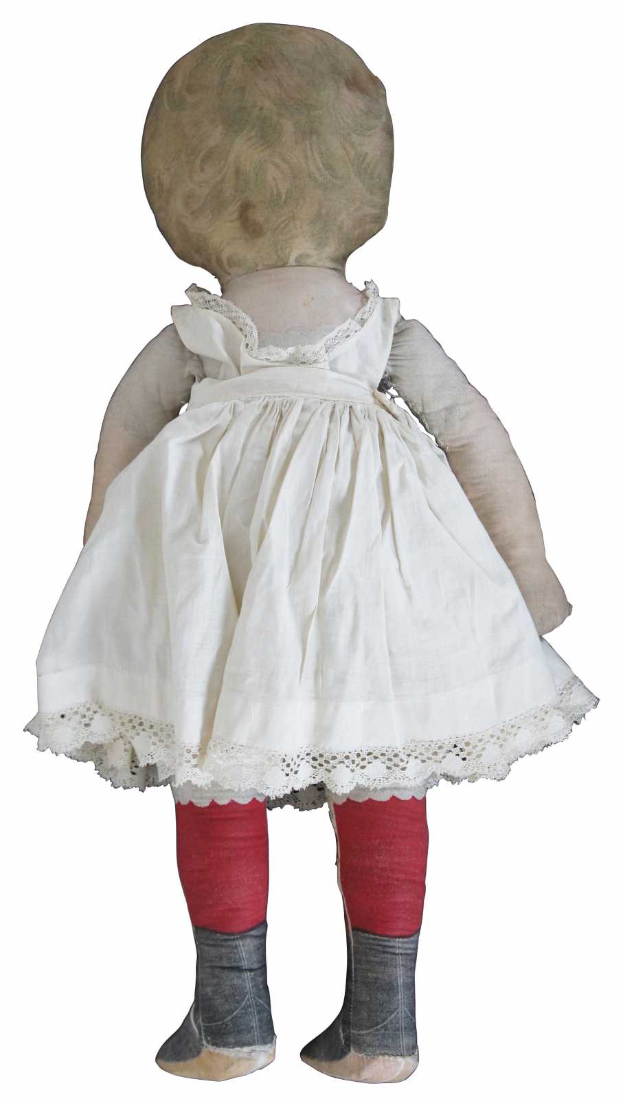Early 20th century printed cloth doll by art Fabric Mills. “Art Fabric Mills Company 1900-1910 USA, (then successors Selchow & Richter 1911-1930) Edgar Newell (company President) created a cutout printed cloth infant doll named Life-Size Doll, 8-30" tall, colorful lithograph facial features, hair, black high boots, undergarment and printed on bottom of foot, doll mark Art Fabric Mills New York Pat. Feb. 13, 1900. Some Art Fabric Mills cloth doll names are: Baby doll, Billy doll, Bridget doll, Buster Brown doll 16", Cry Baby Pin Cushion doll, Diana doll, Dolly Dimple, Foxy Grandpa doll, Merrie Marie doll, 1907 The Newlyweds Kid (baby Snookums) cloth doll (The Newlyweds comic strip characters by George McManus), Topsy dolls and Uncle doll.”