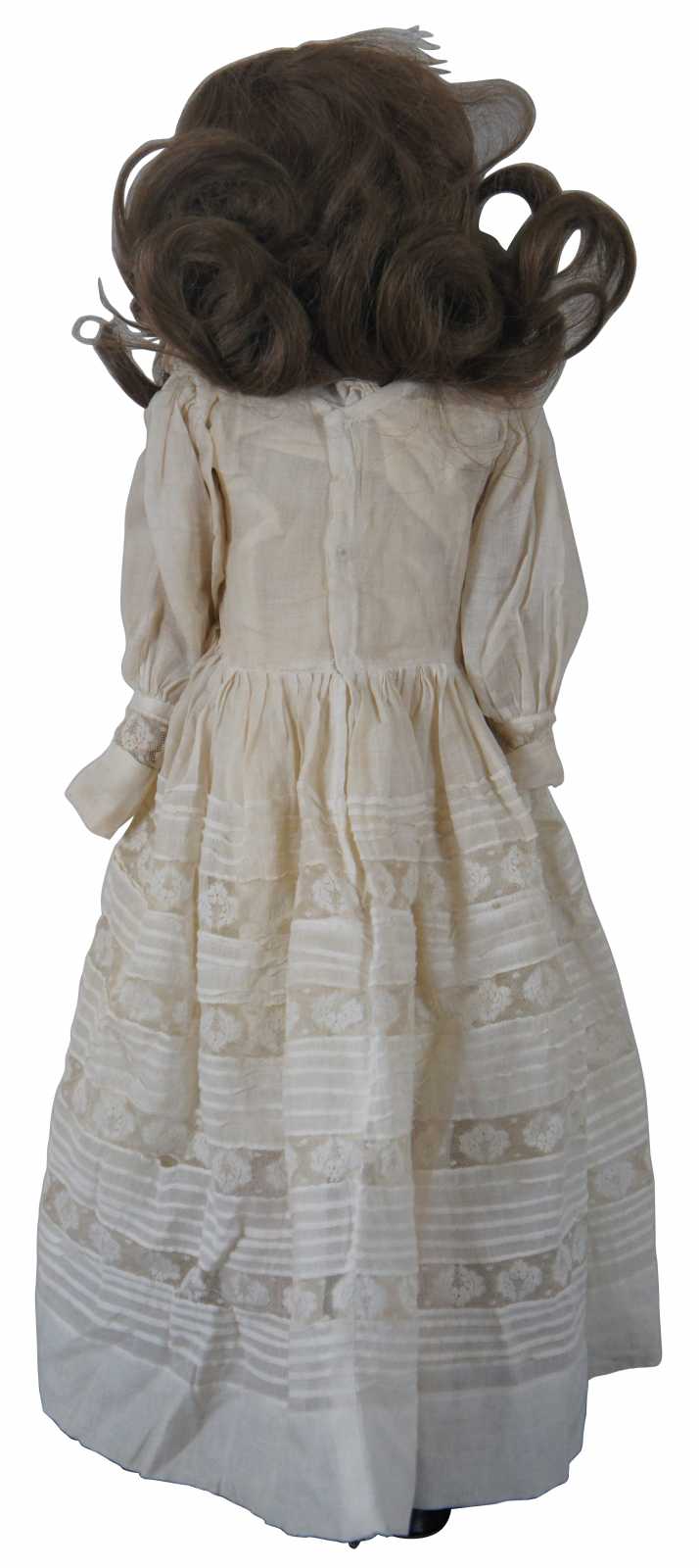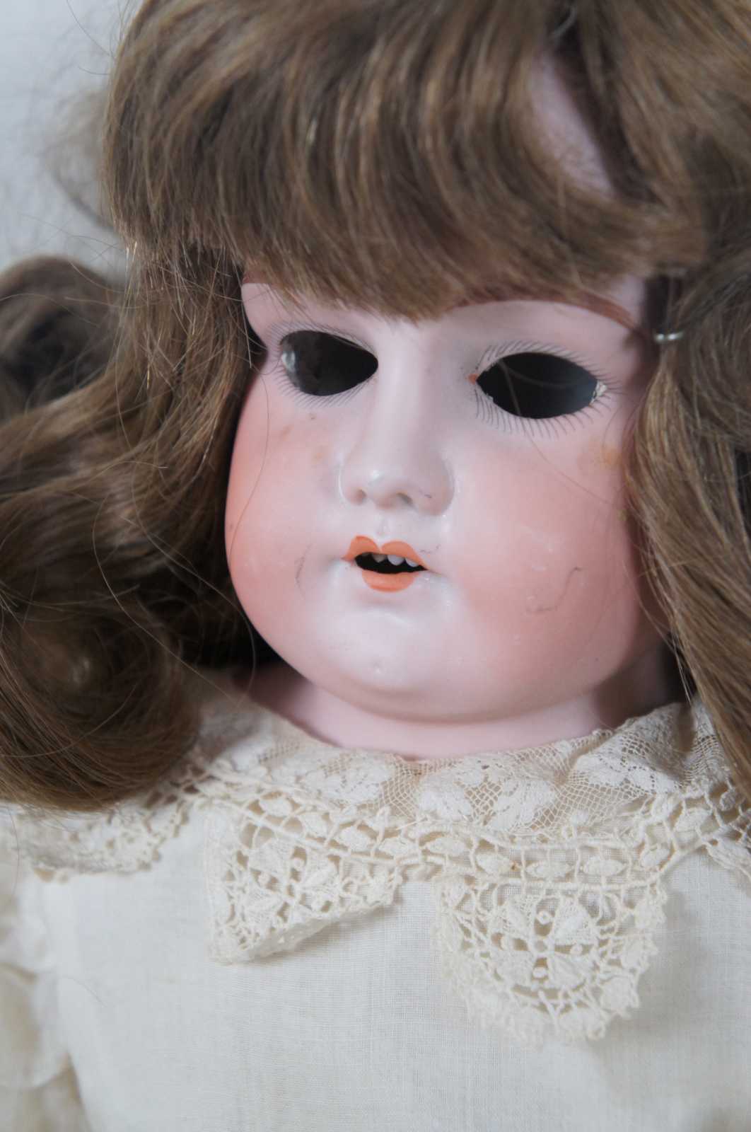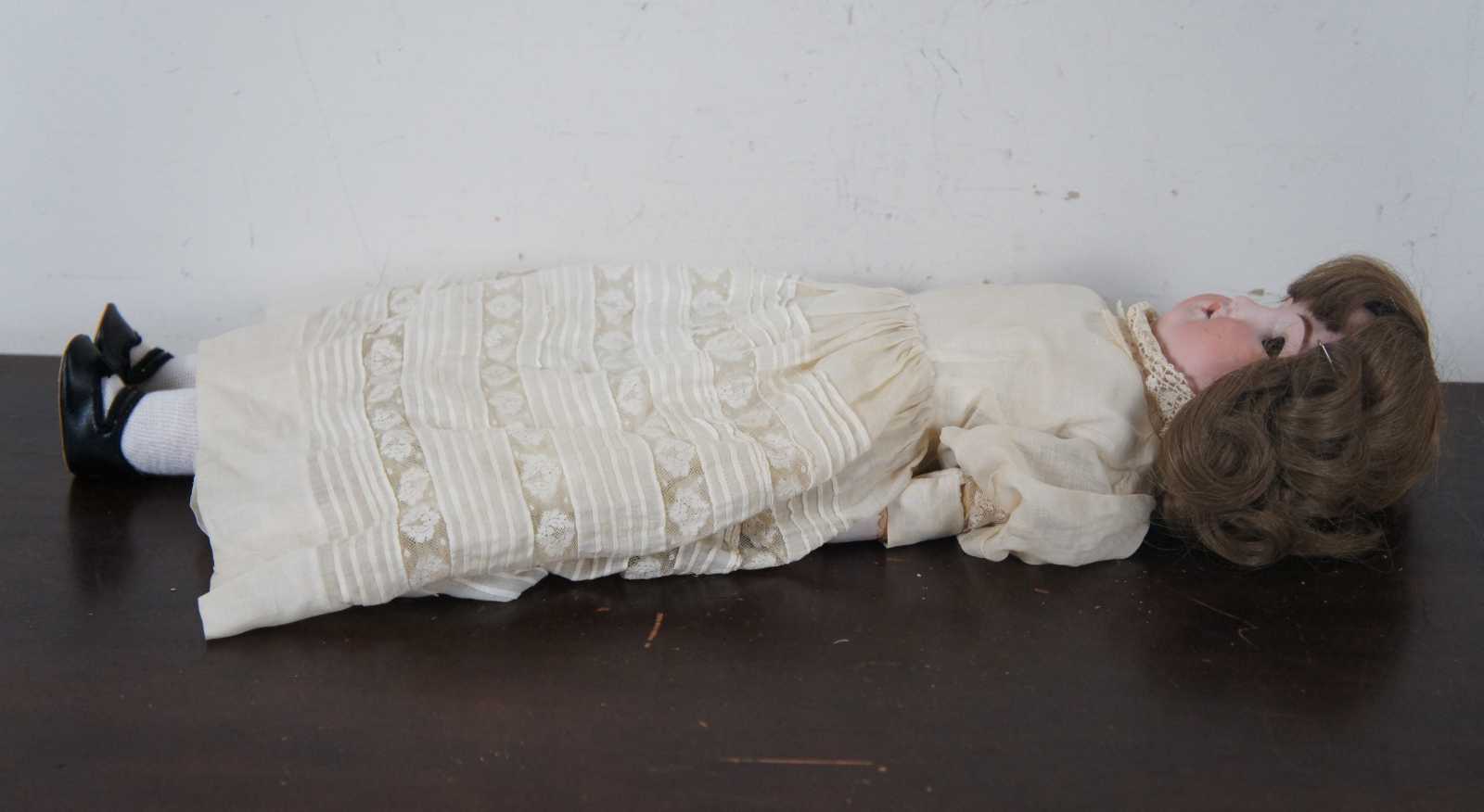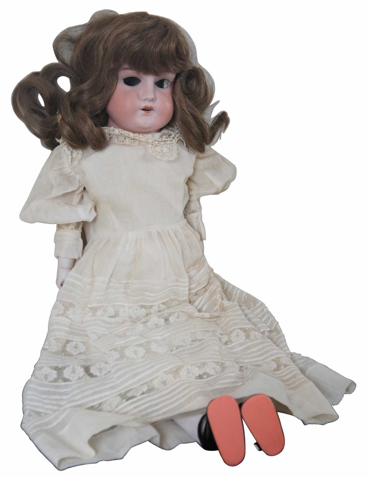 Antique 19th century German Armand Marseille” doll with bisque head and hands, cloth body, brown hair, detached glass eyes, and dressed in a white dress and black shoes.