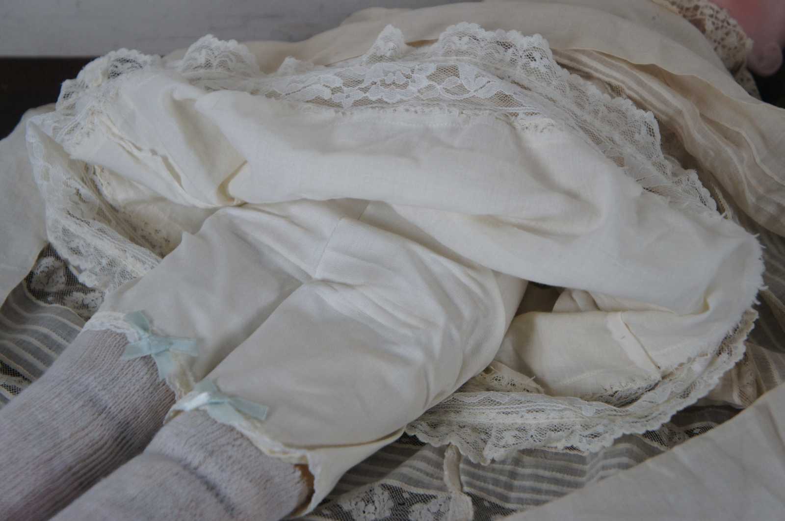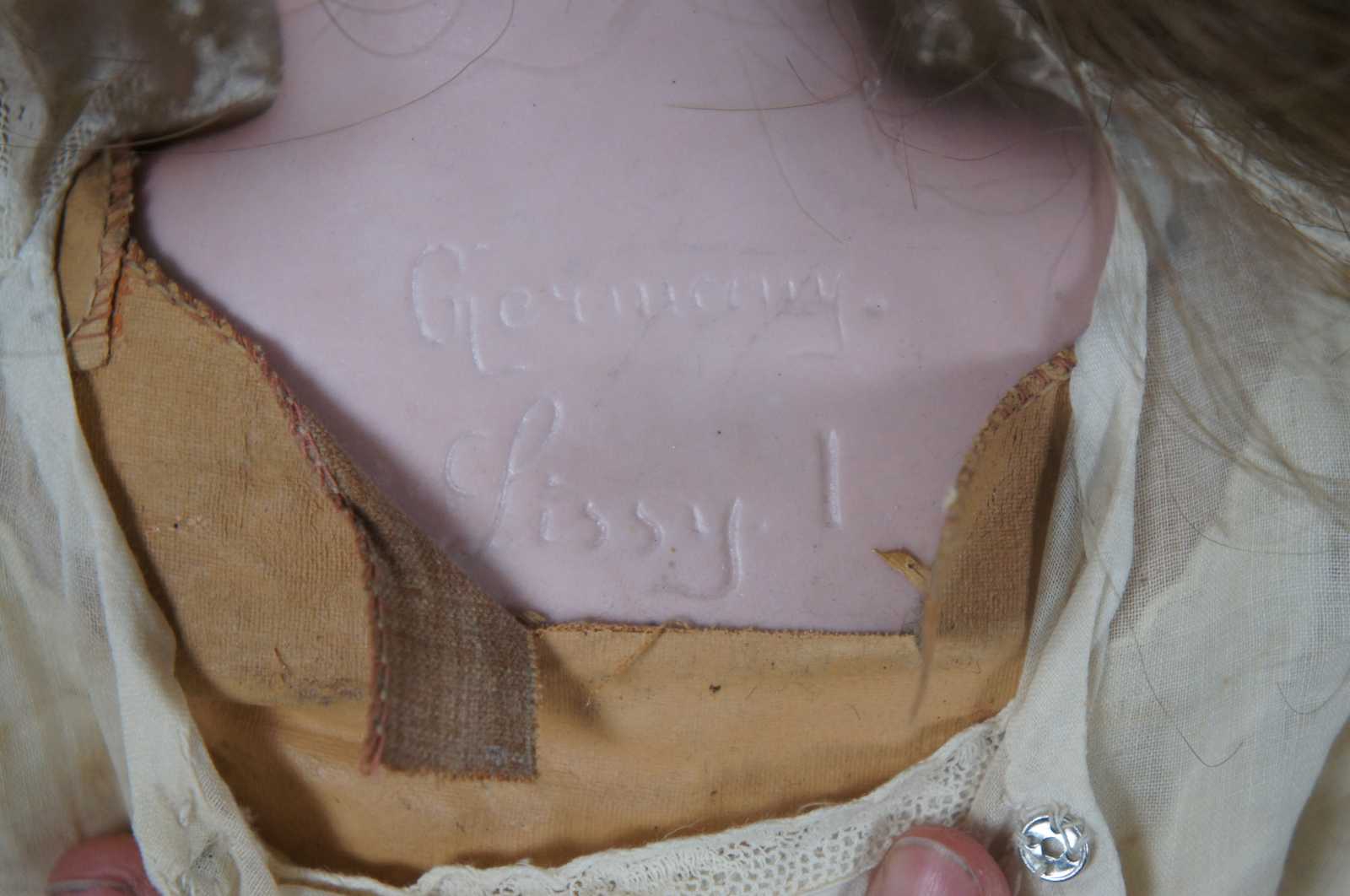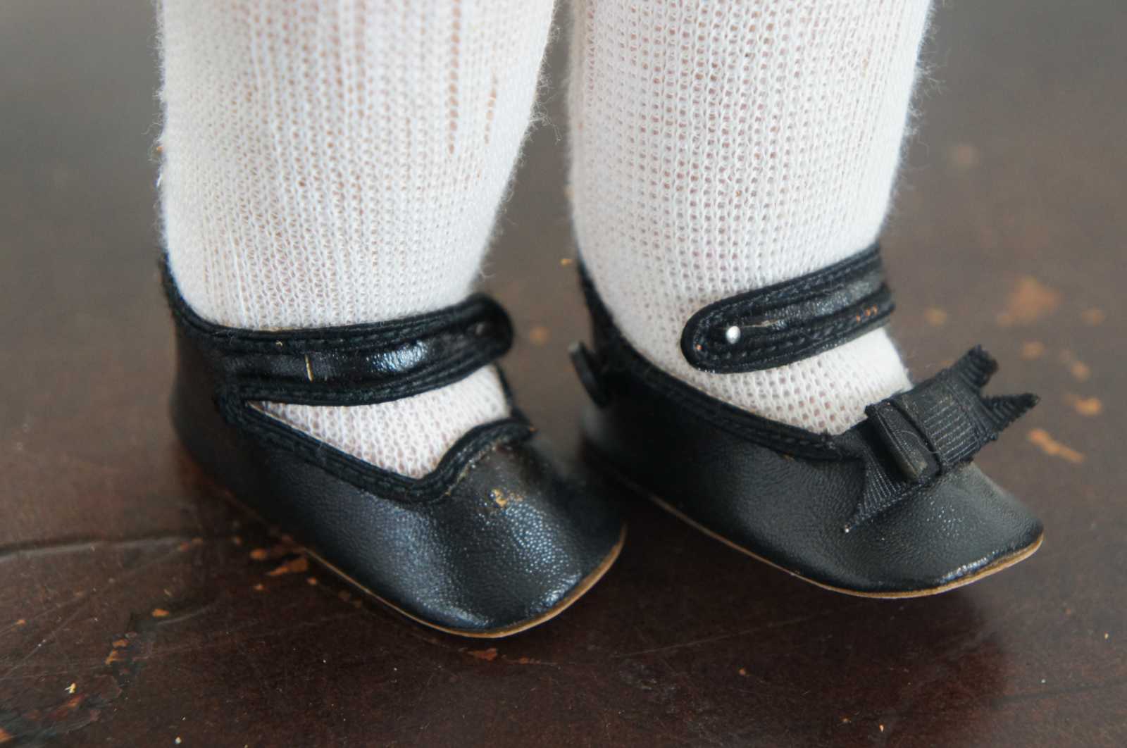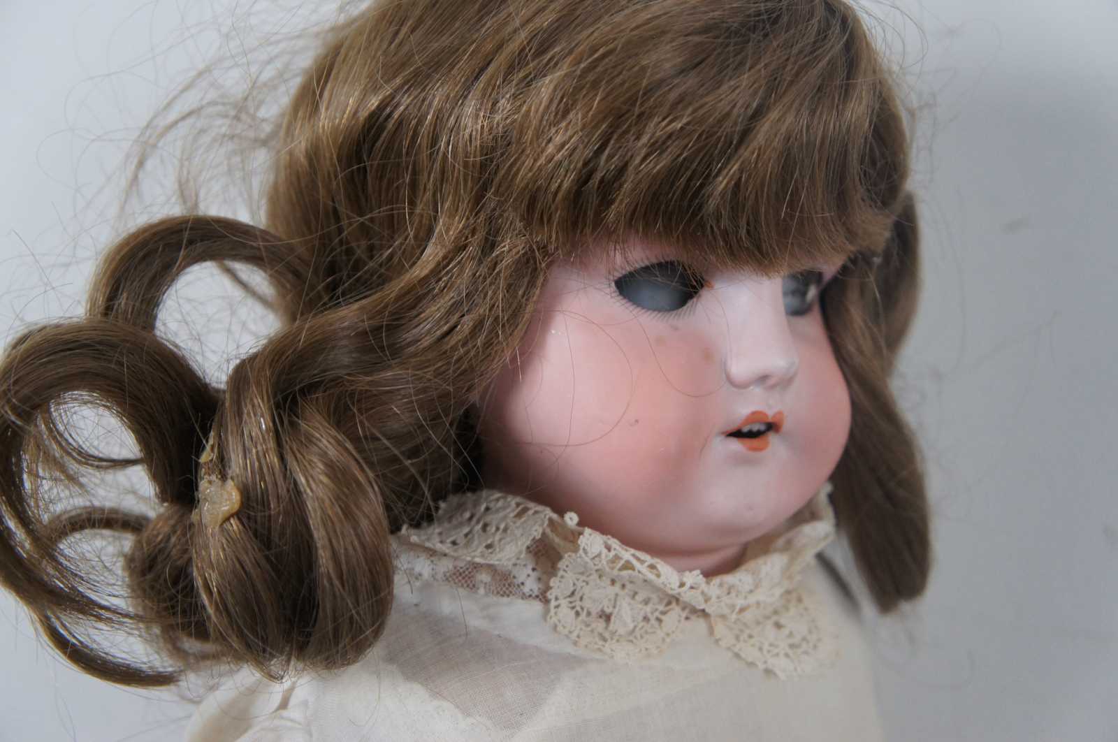 Antique 19th century German Armand Marseille” doll with bisque head and hands, cloth body, brown hair, detached glass eyes, and dressed in a white dress and black shoes.